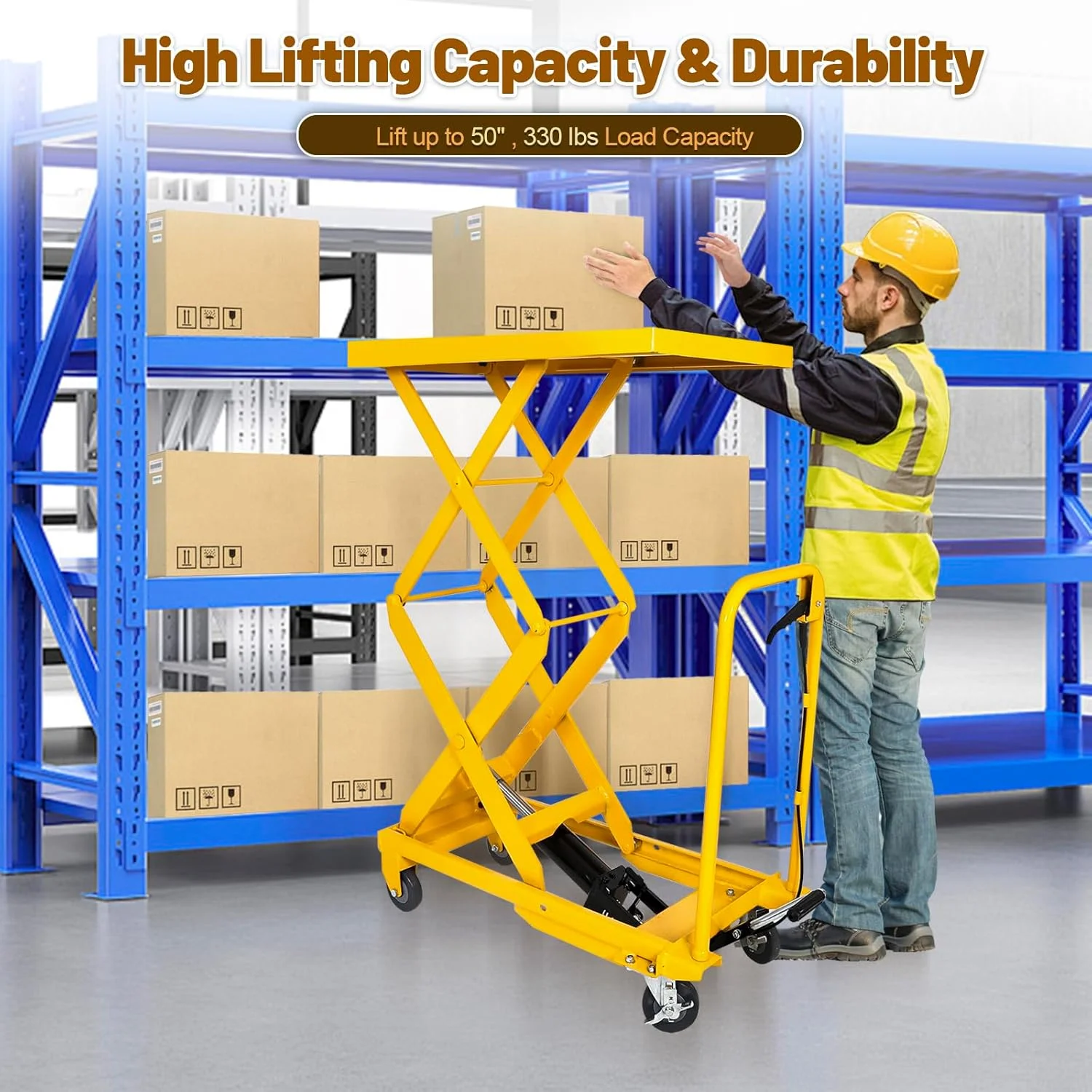 - Durable lift cart with a premium hydraulic pump for leak-proof lifting up to 50 inches and a 330 lbs load capacity, featuring rust-resistant steel construction