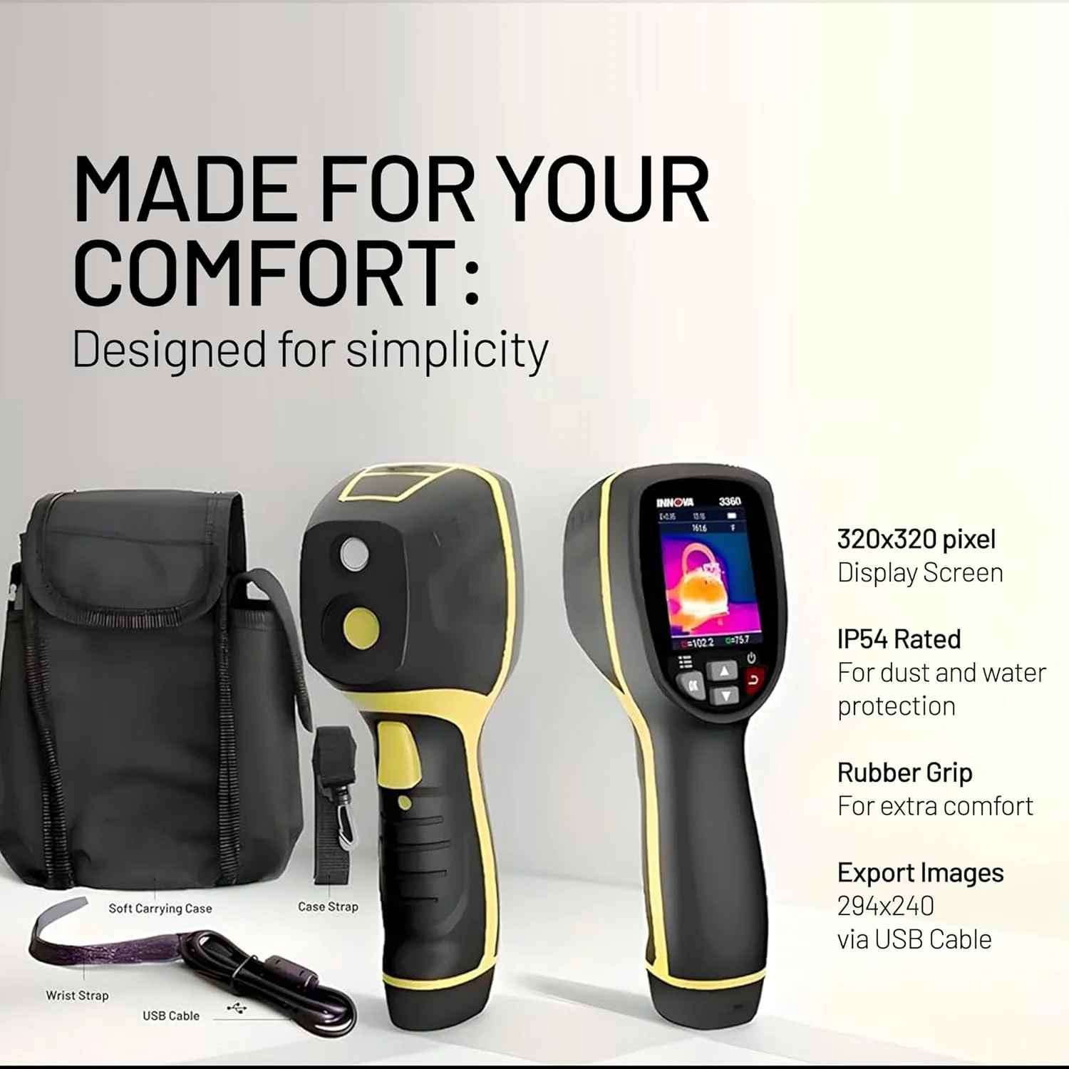 - SIMPLE & DURABLE: With a rugged rubber grip, IP54 durability rating, and easy-to-navigate controls, this thermal camera is designed for practical, no-frills use. Whether you��re scanning outlets or troubleshooting electronics, it��s built to handle real-world conditions.