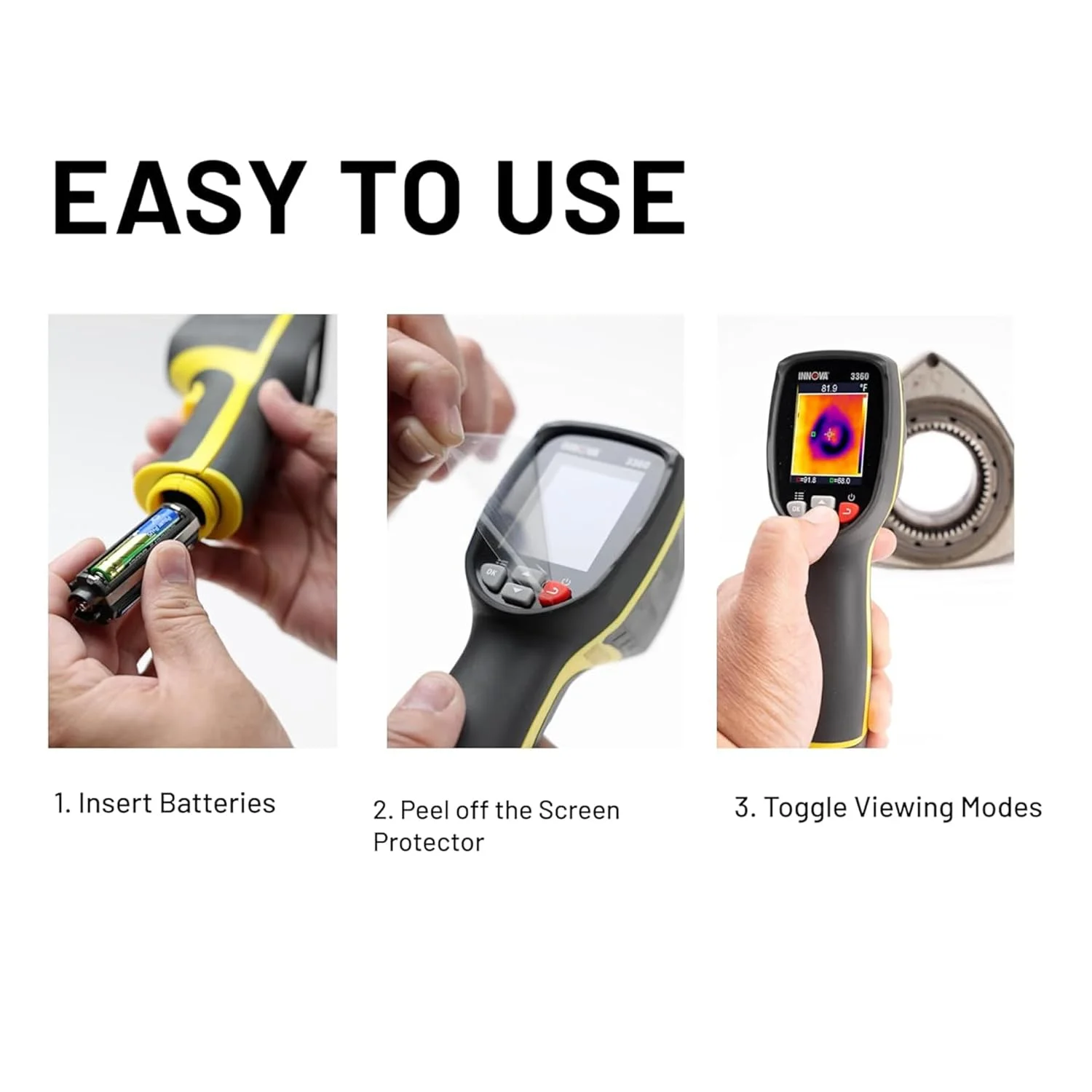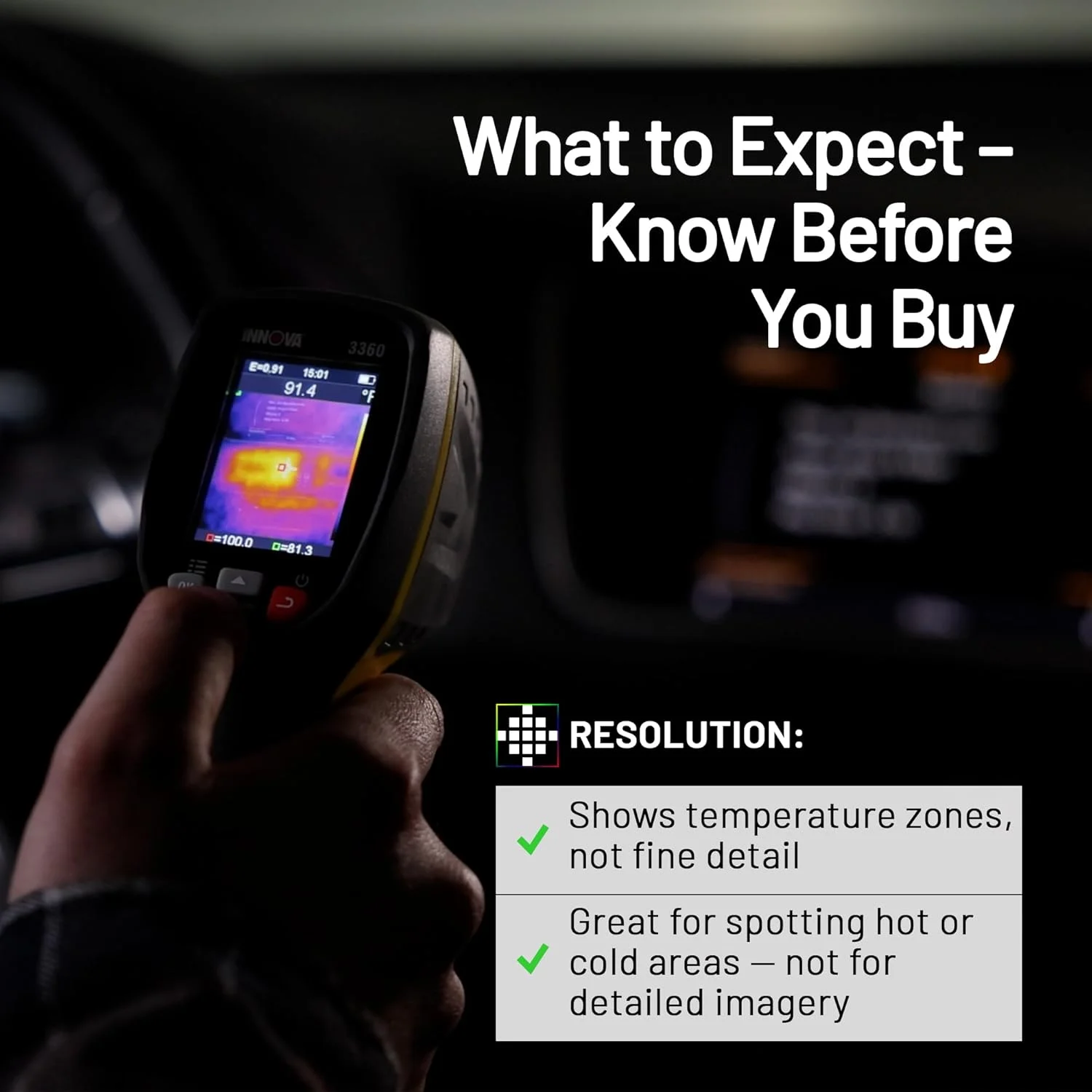 - IDENTIFY HEAT PROBLEMS SIMPLY: The Innova 3360 thermal camera helps you detect heat differences using basic thermal imaging. It measures temperatures from -4��F to 1112��F and shows hot and cold zones clearly when used at close range. Ideal for slow, methodical scans of vents, wiring, appliances, and other components.