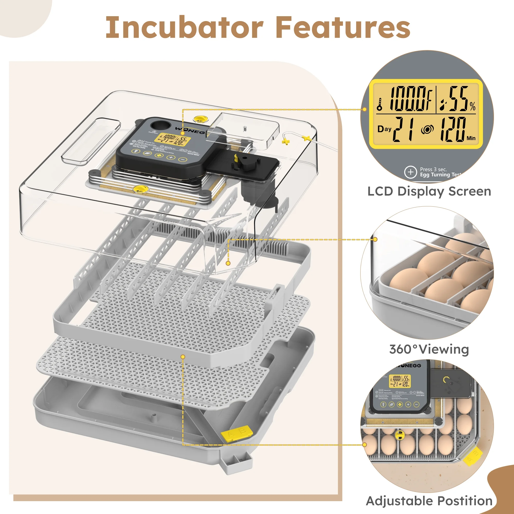 - 2.Smart Auto-Turning System: Equipped with an automatic egg turner that gently rotates eggs at set intervals and intelligently stops during the final 3 days, while removable egg frames and card strips ensure perfect hatching conditions.