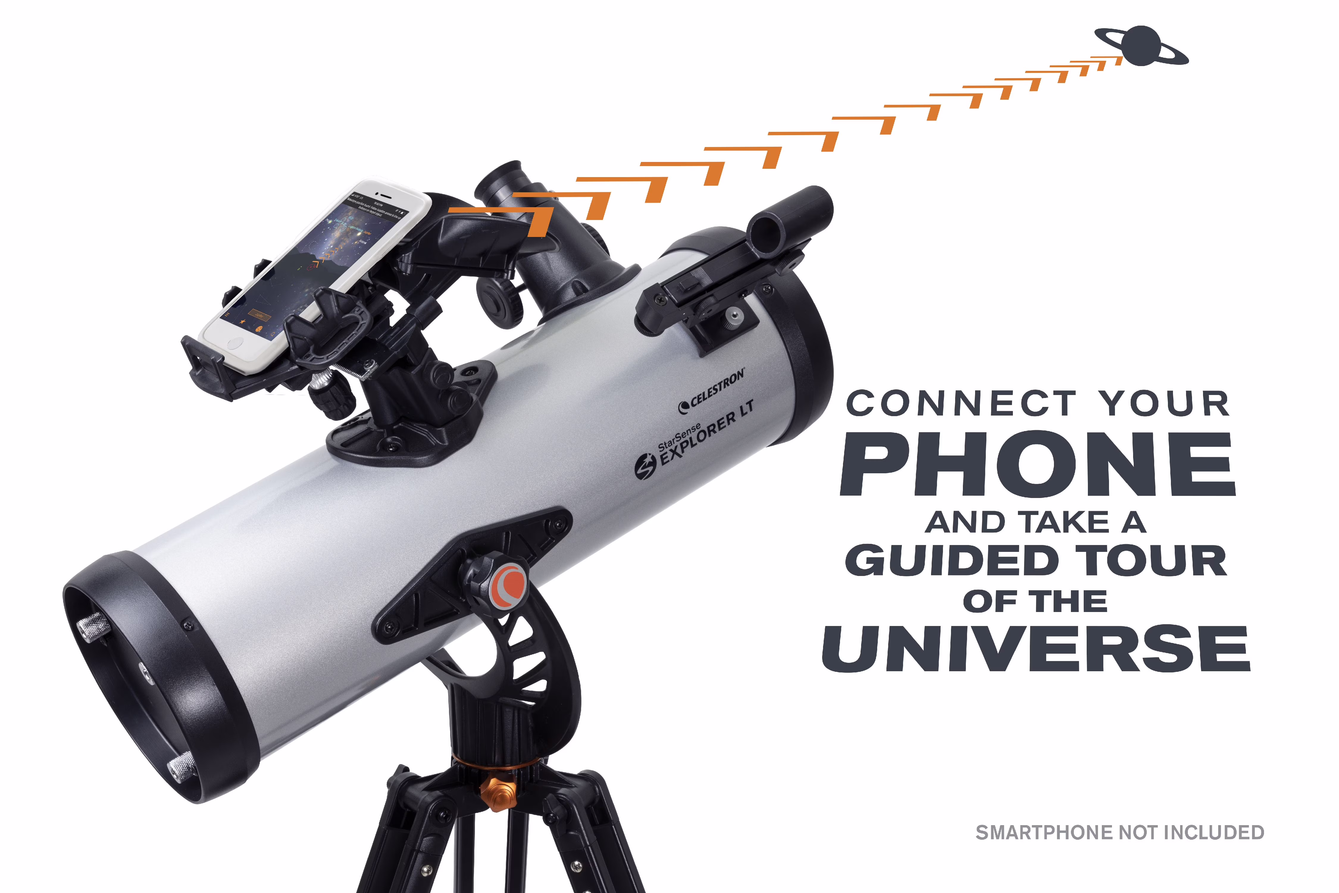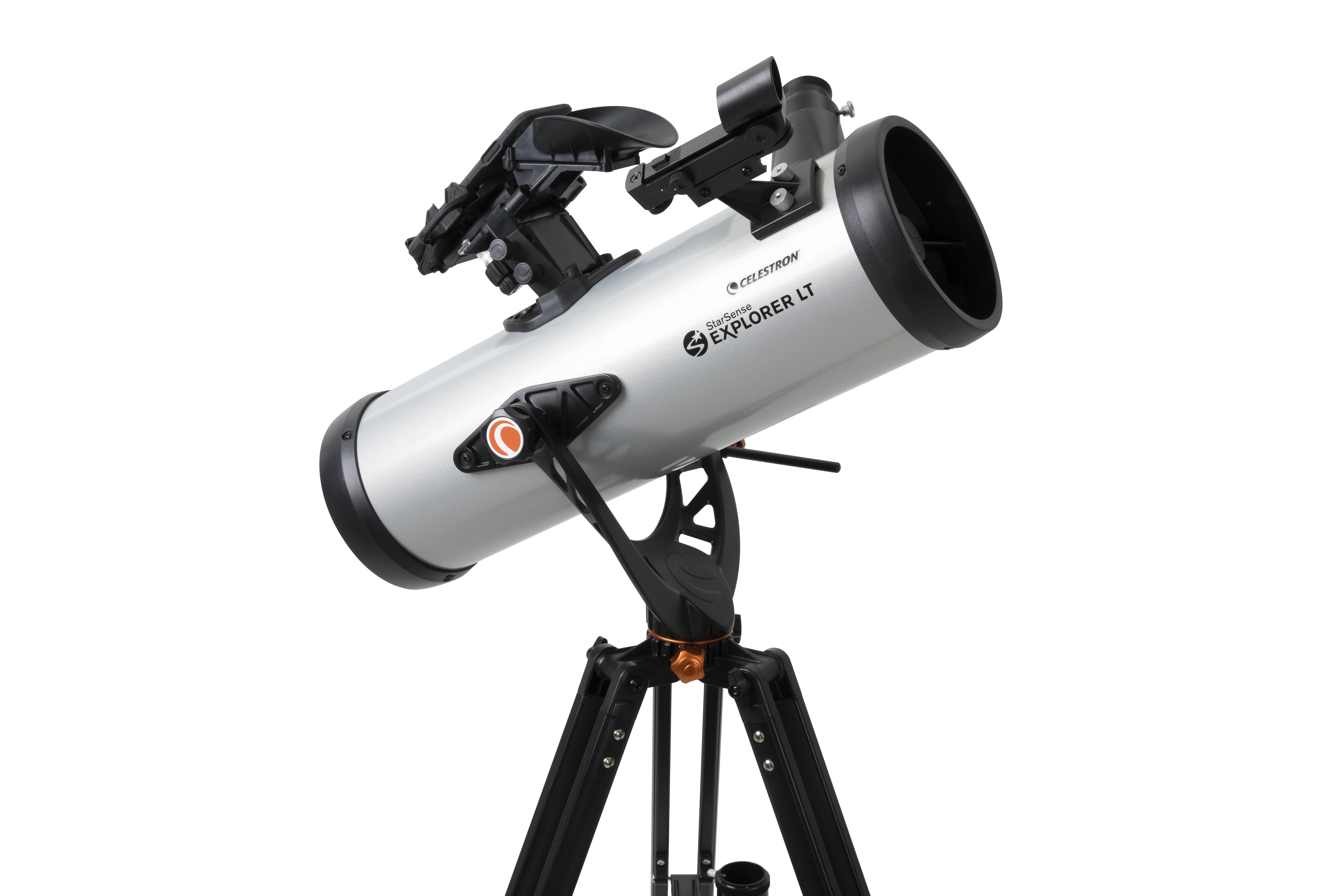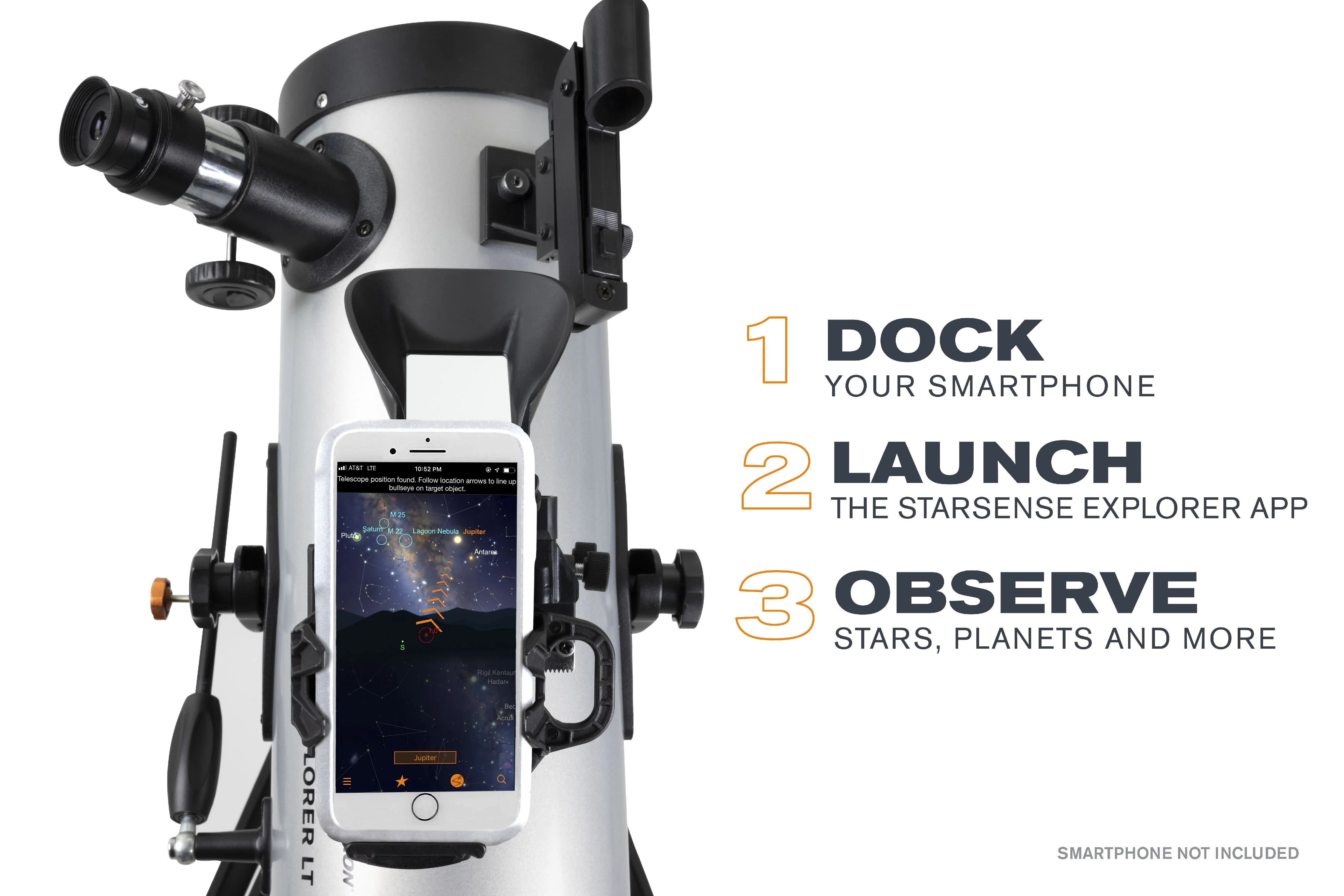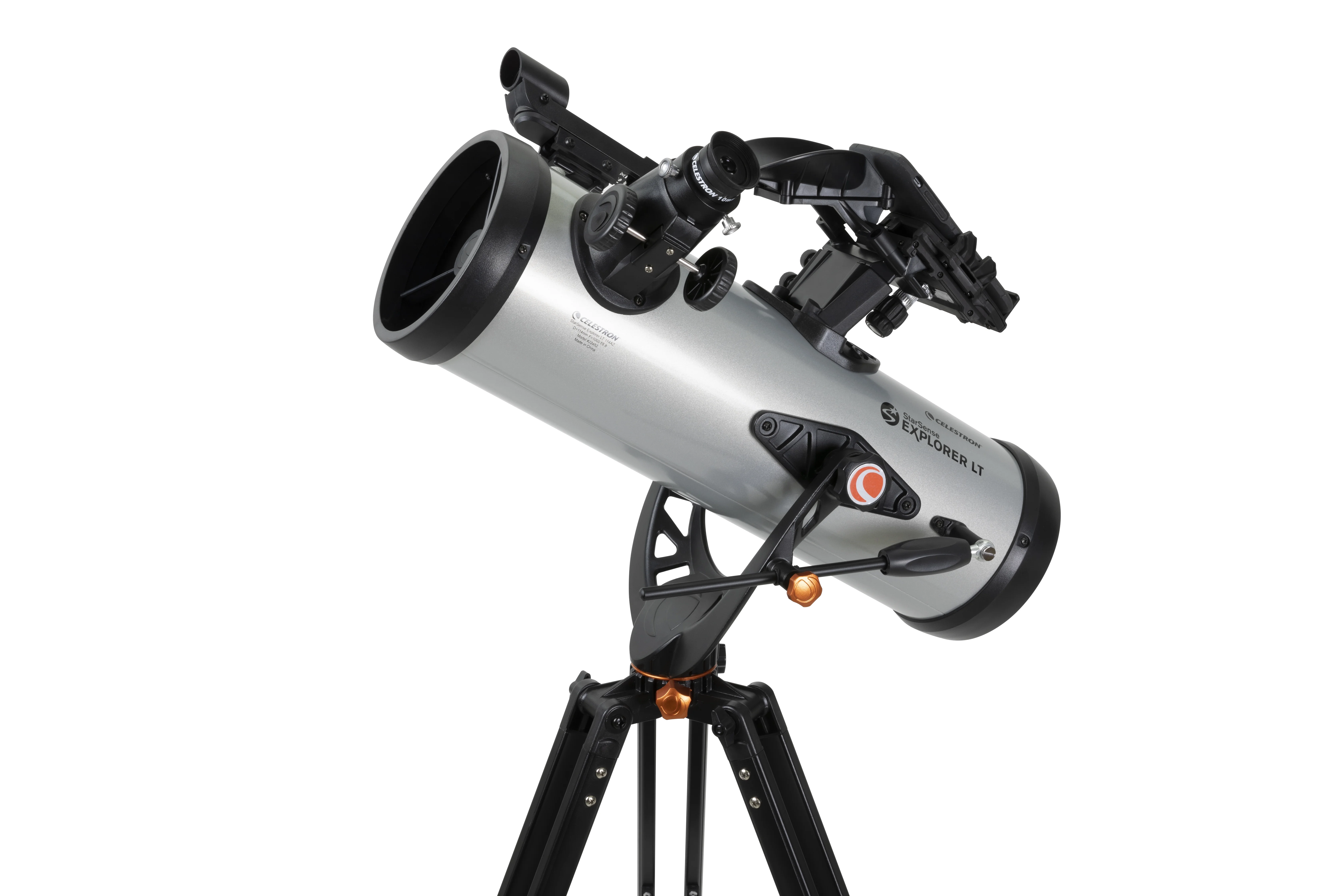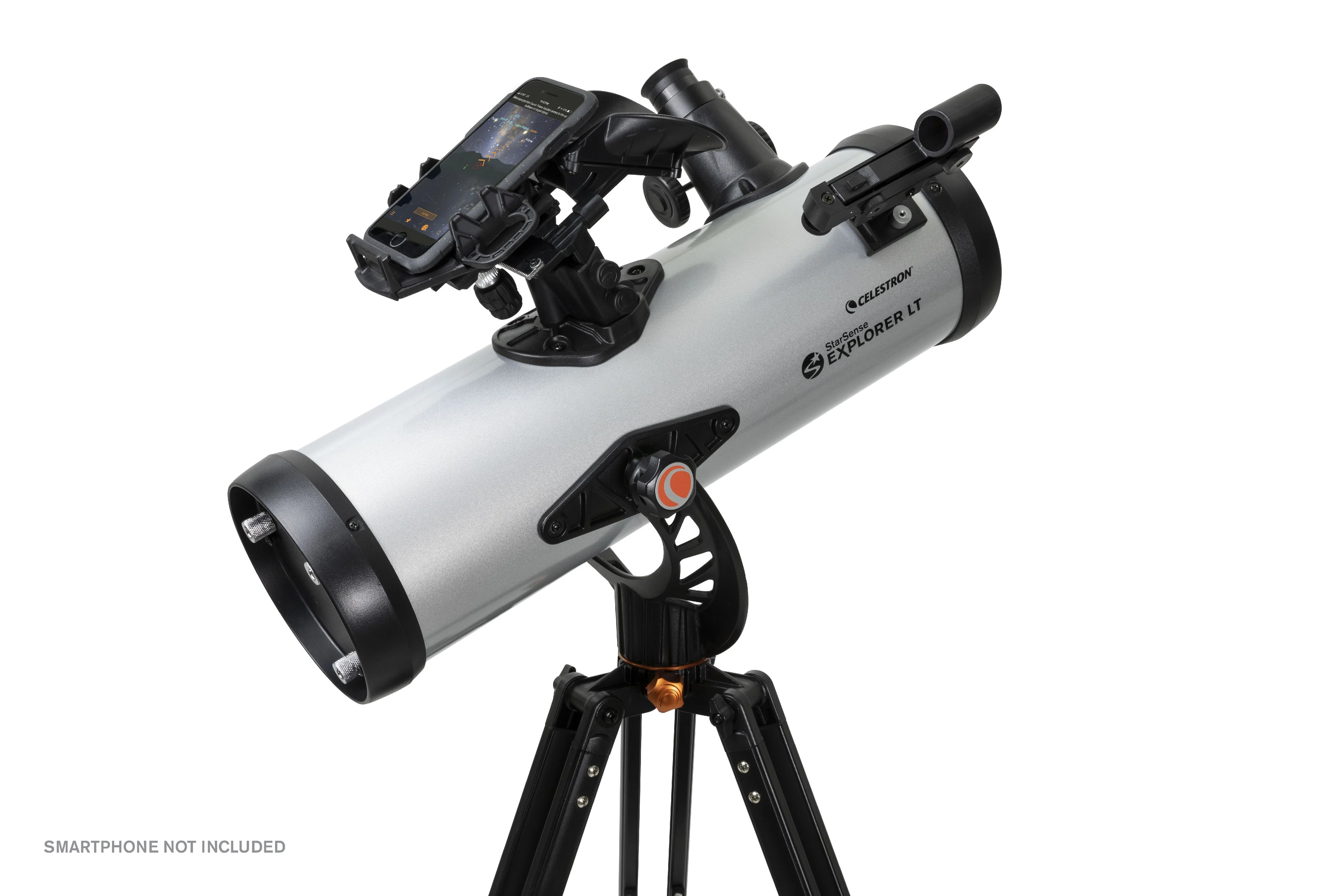 Celestron has reinvented the manual telescope with Star Sense Explorer��the first telescope that uses your smartphone to analyze the night sky and calculate its position in real time. Star Sense Explorer is ideal for beginners thanks to the app��s user-friendly interface and detailed tutorials. It��s like having your own personal tour guide of the night sky. Dock, Launch, Explore Leave complicated star charts, imprecise planetarium apps, and computerized mounts behind. With Star Sense Explorer, locating objects has never been easier, faster, or more accurate. Within minutes of setting up the telescope, you��ll be navigating the sky with confidence. Simply place your phone in the unique Star Sense dock and launch the Star Sense Explorer app. After aligning your phone to the telescope��s optics (a quick, 2-minute procedure), Star Sense Explorer generates a list of celestial objects currently visible. Make your selection and arrows appear onscreen, guiding you as you to move the telescope. When the object is ready to view, the bullseye turns green. Smartphone Compatibility Star Sense Explorer works with most modern smartphones, including iPhone 6 and up and most devices running Android 7.1.2 or later manufactured since 2016. For a complete compatibility list, click here. Patent-Pending Star Sense Sky Recognition Technology Star Sense Explorer uses patent-pending technology and your smartphone to determine exactly where the telescope is pointed in the night sky. A Lost in Space Algorithm (LISA), like the ones satellites use in orbit to correctly reorient themselves, helps the app match star patterns it detects overhead to its internal database. While other astronomy apps may claim that they can help you find objects, they rely exclusively on the phone��s gyros and accelerometers, which aren��t as accurate as LISA technology. No other app can accurately tell you when your target is visible in the eyepiece. Sturdy Altazimuth Mount Star Sense Explorer LT��s simple altazimuth mount makes it easy to move the telescope to find your target. An altitude slow motion adjustment with a sliding rod helps you fine tune the telescope��s pointing position and follow targets as they appear to drift across the night sky. It��s all anchored by an adjustable, full-height tripod. Dazzling Views with High Quality Optics With a large 114mm (4.5��) objective lens, this telescope has enough light gathering ability to bring out detail in celestial objects. You can expect sharp, bright views of Jupiter��s four Galilean moons, its cloud bands and Great Red Spot, the rings of Saturn, the trapezium in the Orion Nebula, and beautiful Pleaides Open Star Cluster. Perfect for the City or Dark Sky Sites Even if you live in a light polluted city location, Star Sense Explorer is advanced enough to be able to pick out Jupiter, Saturn, Venus, the Orion Nebula, double stars, and a few more of the most famous celestial objects. But if you can take the telescope to an even slightly darker location, more objects will become visible. With this 4.5�� Newtonian and relatively dark skies, the Andromeda Galaxy, Hercules Open Star Cluster, and so many more are easily within your reach. The entire telescope kit weighs just 10.4 pounds, so it��s perfectly portable and easy to bring on your next camping trip or to a remote observing site. Everything You Need to Observe Immediately When you unbox your new Star Sense Explorer LT, you��ll find: 114mm Newtonian reflector optical tube Star Sense dock for your smartphone Low powered (25mm) and high powered (10mm) eyepiece 2x Barlow lens to double the power of each eyepiece Star Pointer red dot finder scope, perfect for using the telescope during the day or without the Star Sense Explorer app Altazimuth mount with slow motion control rod Full-height tripod with an accessory tray to keep you organized