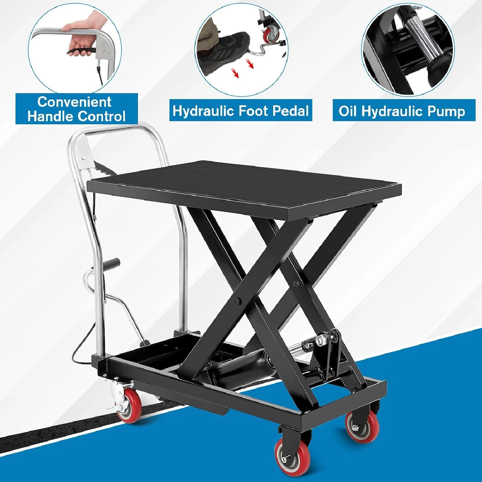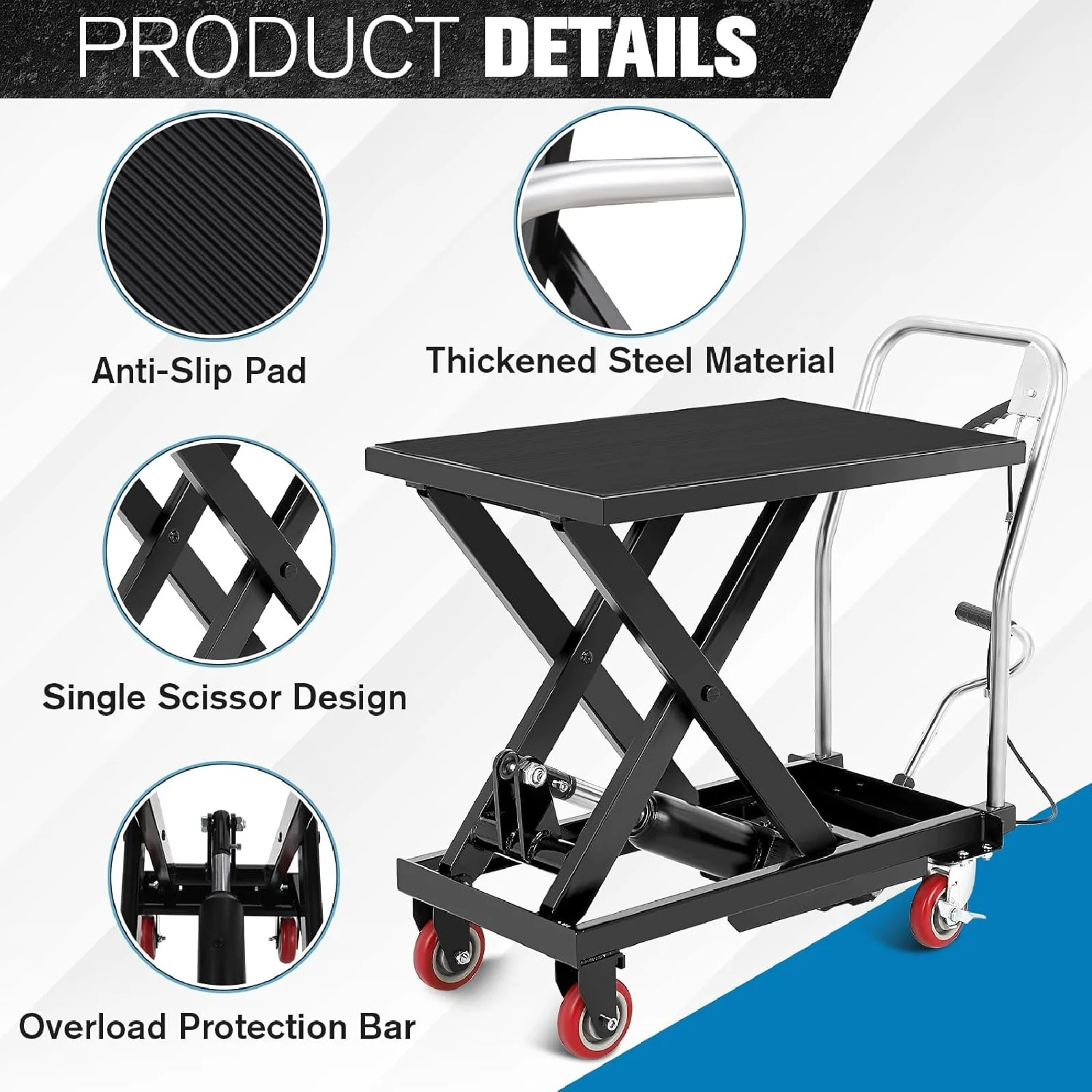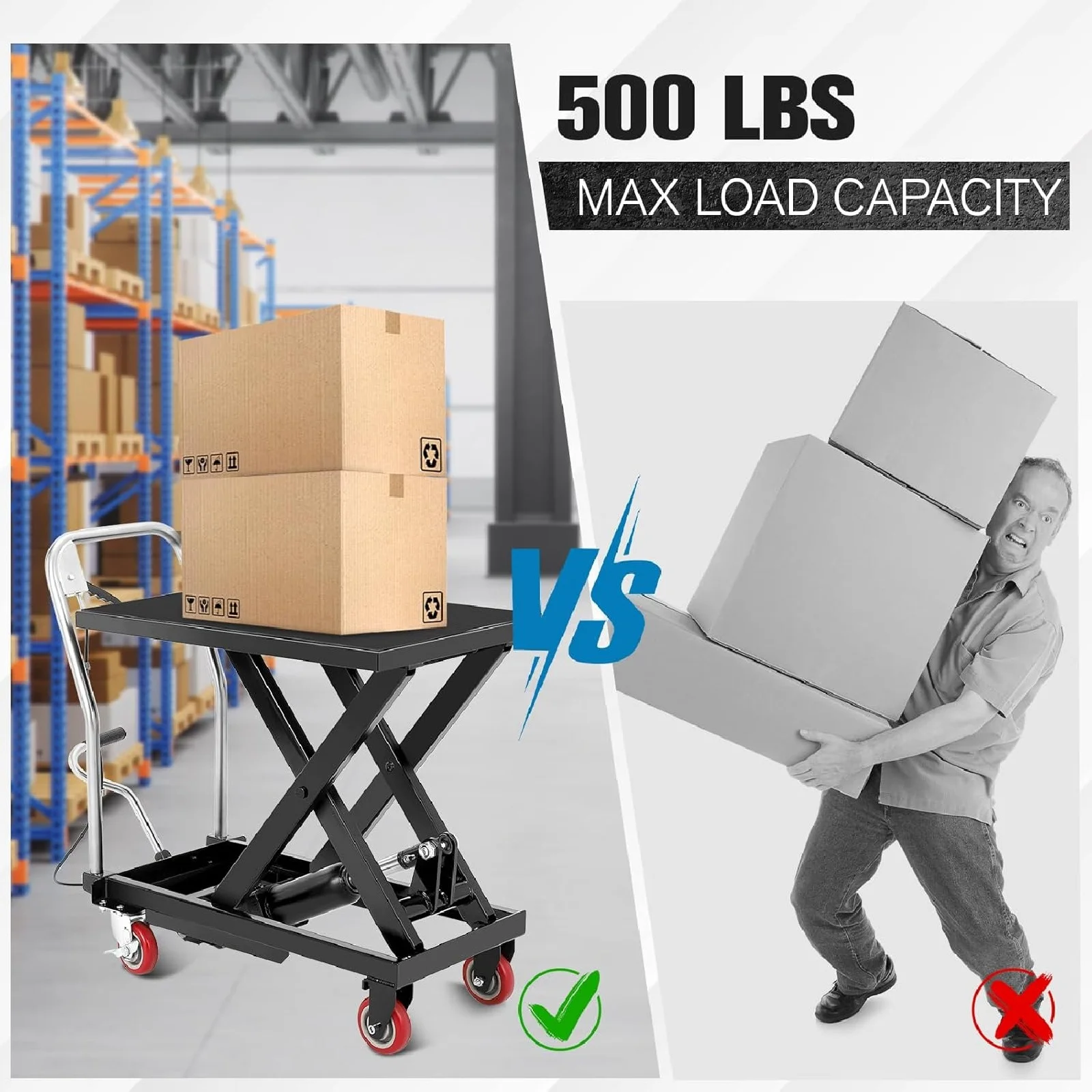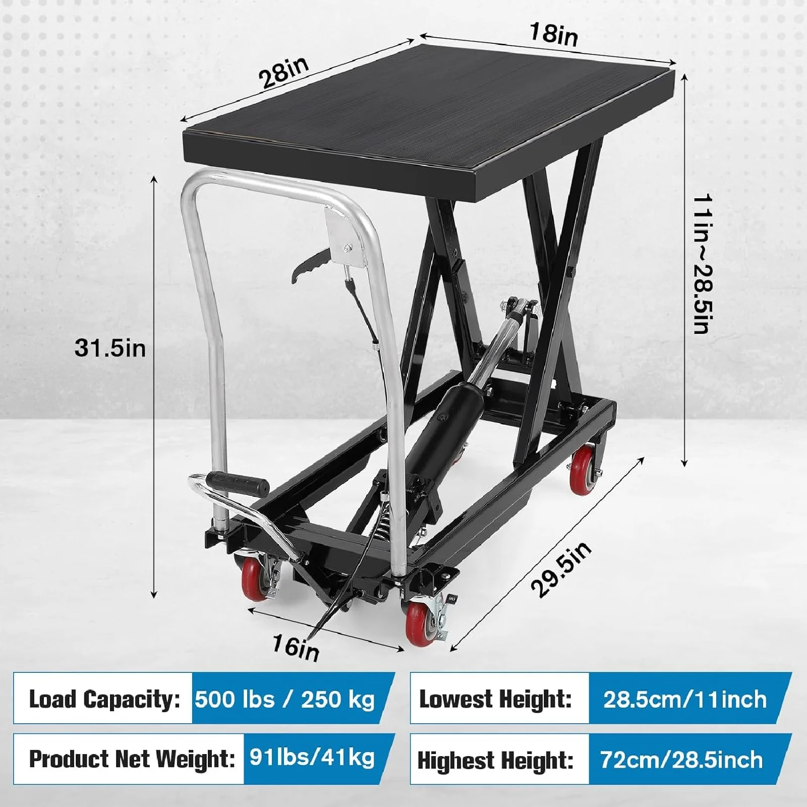 Name: Hydraulic Lift Table, 500 Lbs Capacity Hydraulic Table Cart, Single Scissor Lift Cart 28.5 Inch Lifting Height with 4 Wheels and Non-Slip Pad for Material Handling