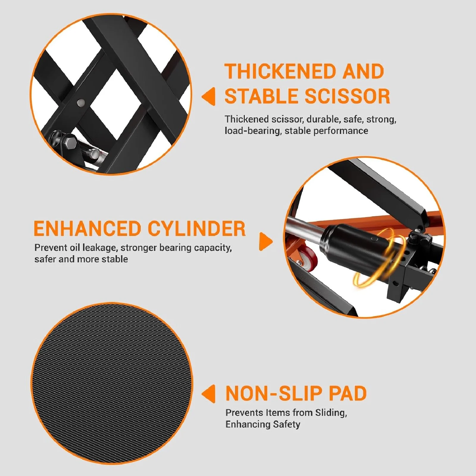 - Sturdy Build: The 500 lbs Capacity Hydraulic Lift Table Cart is made from high-quality thickened steel with a rust-resistant powder-coated finish, securely handling loads up to 500 lbs with a maximum lift height of 28.5 inches.