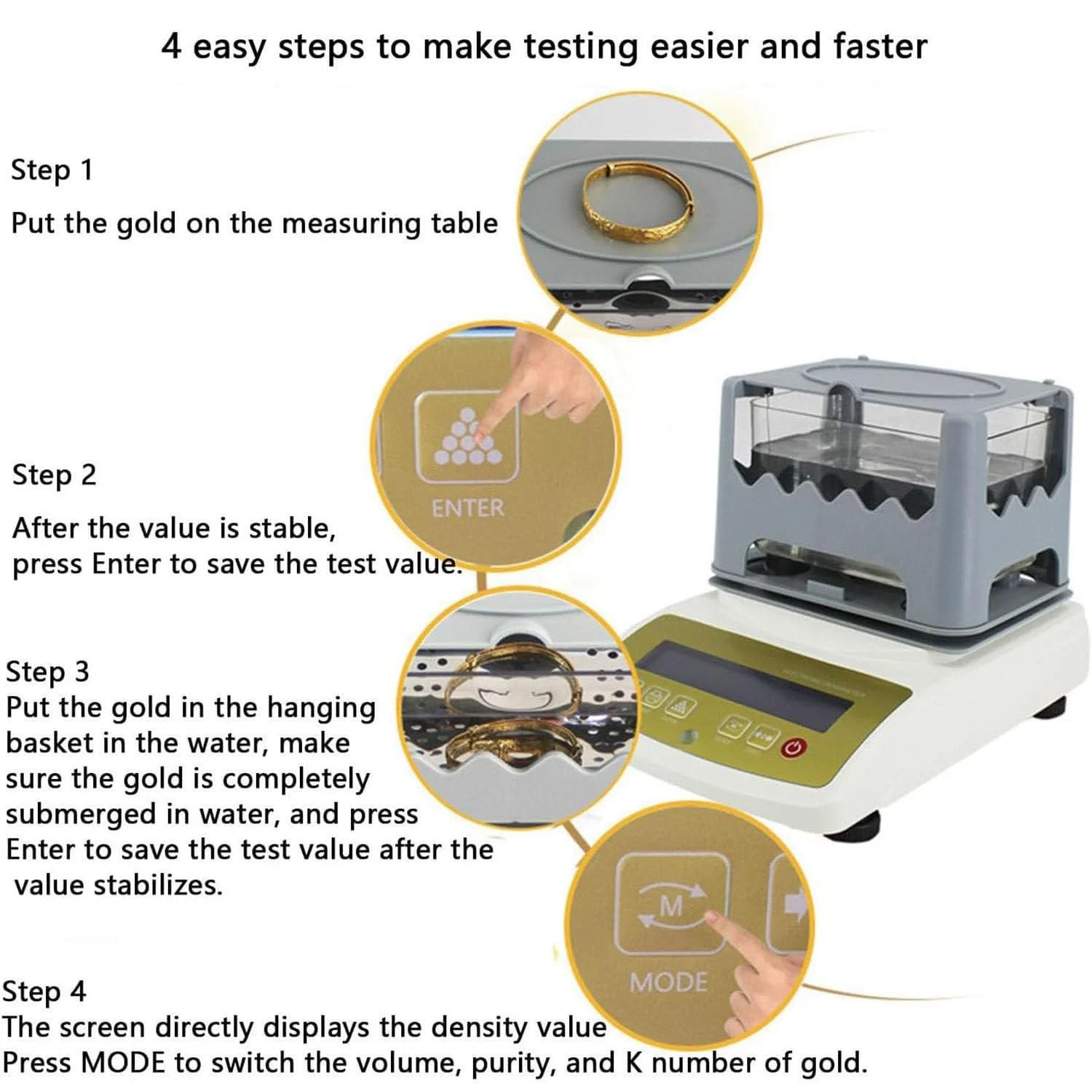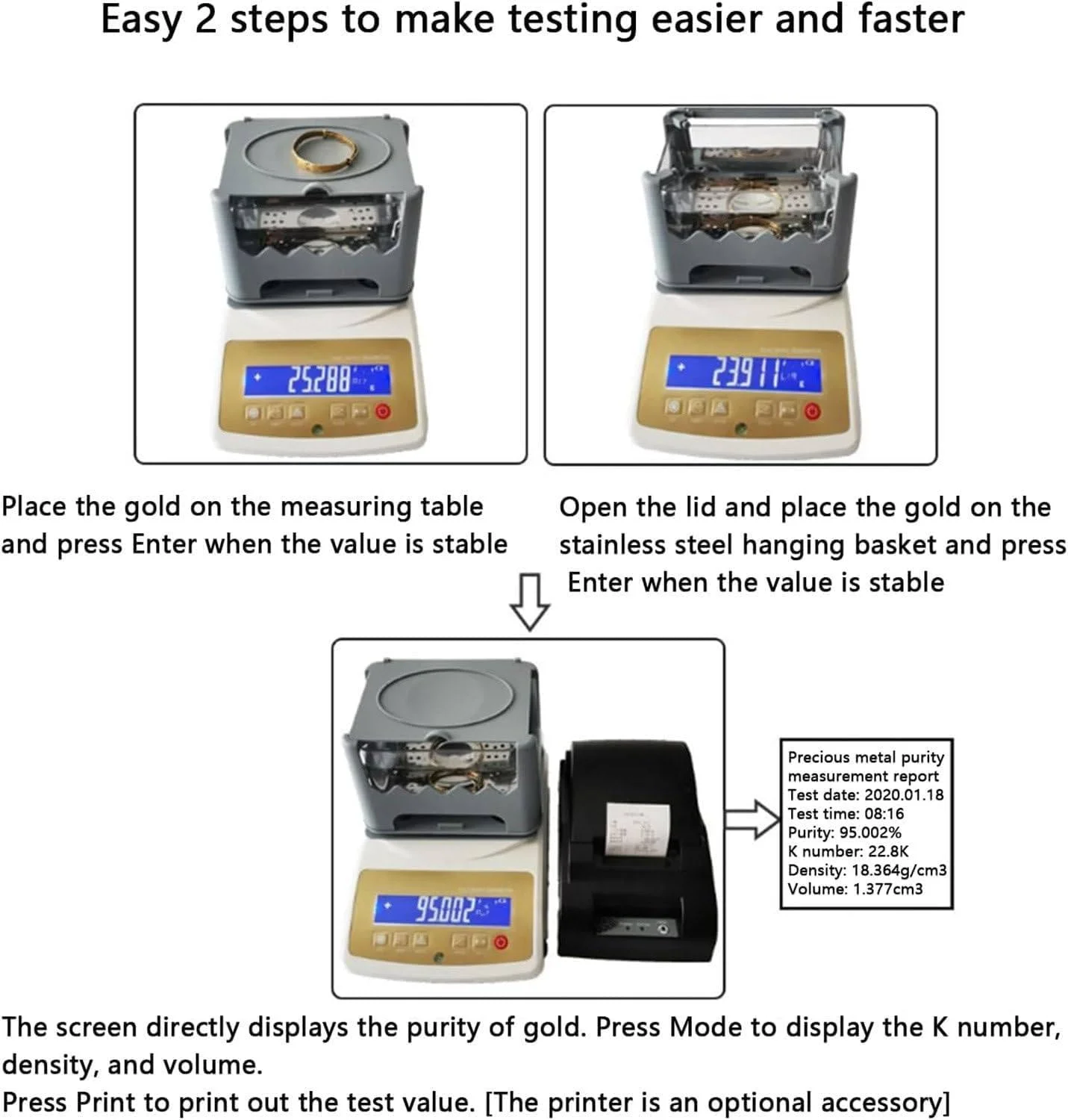 1. Only two weighing steps, karat, density and purity of gold can be showed rapidly and accurately.