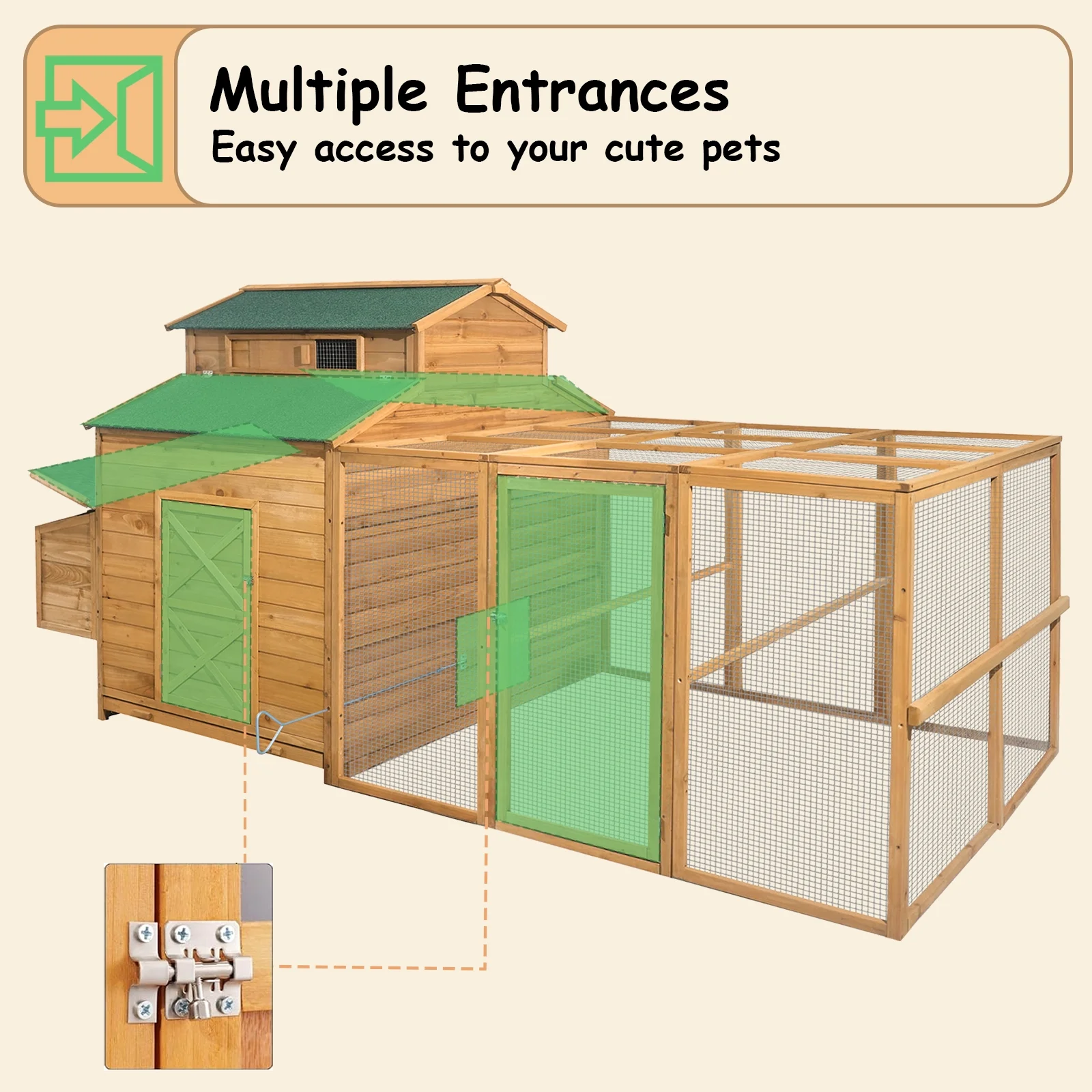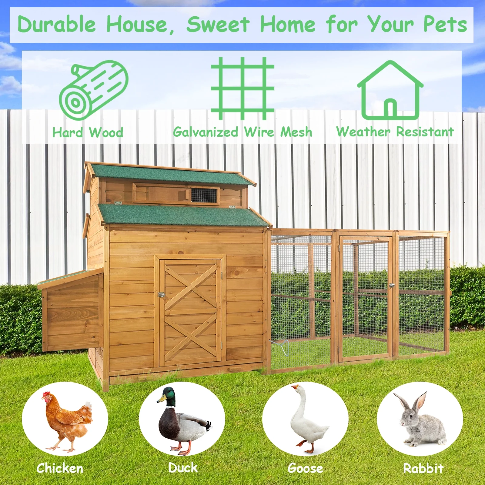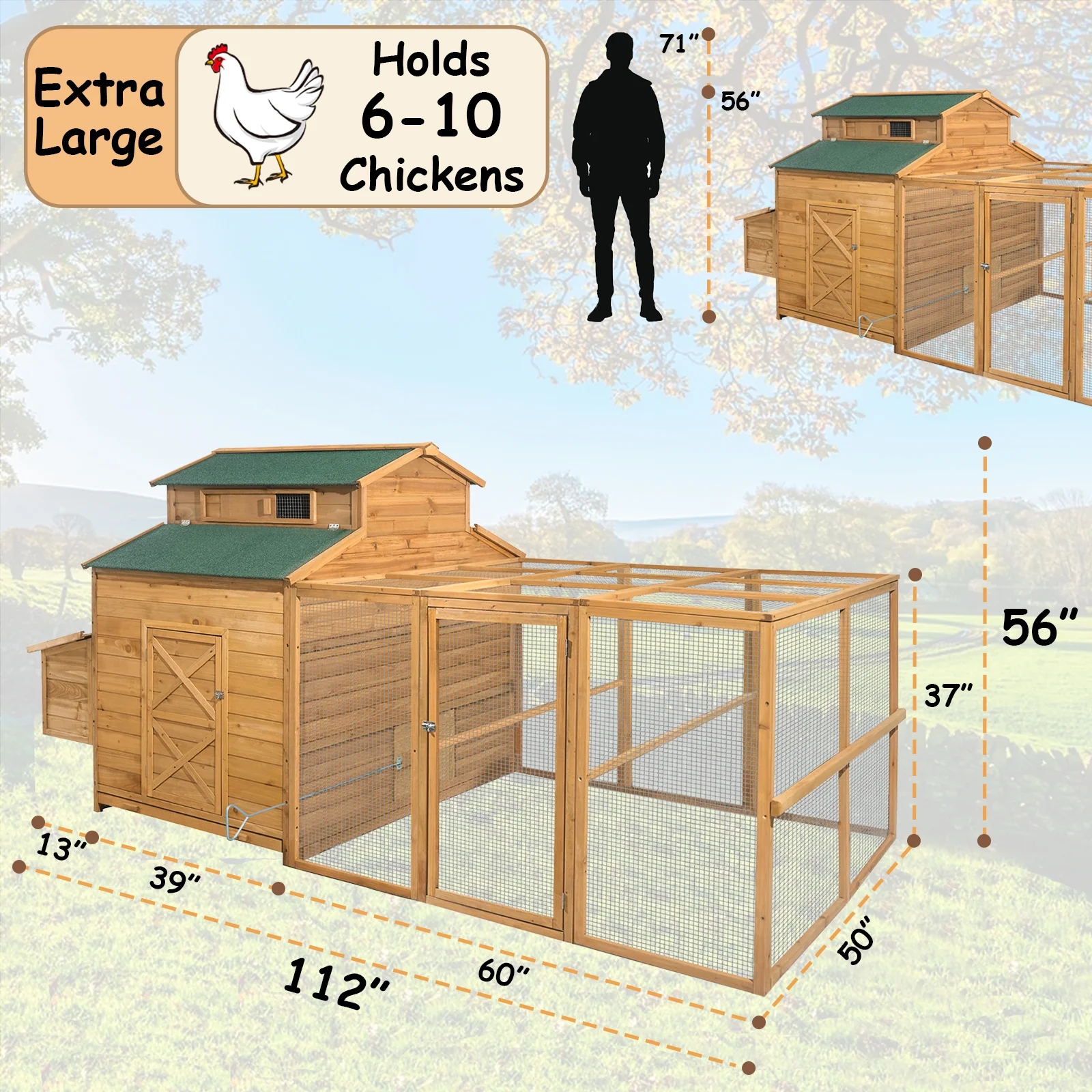 Chicken Coop for 6 - 10 Chickens, 112" Extal Large Chicken Coops, with Chicken Run & Nesting Box & Secure Enclosure, Outdoor Wooden Hen House Hutch for Rabbit, Poultry Pet, Duck