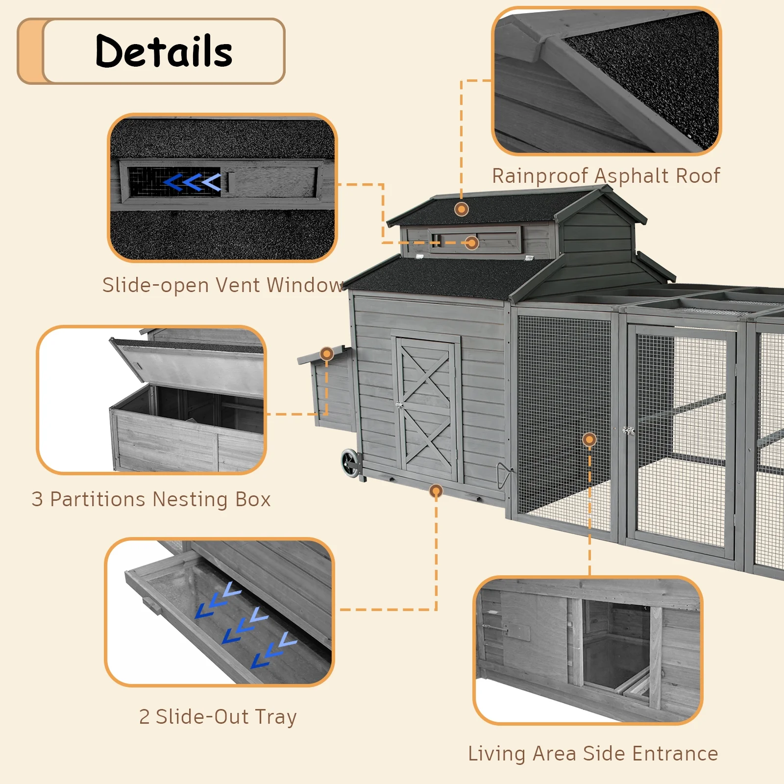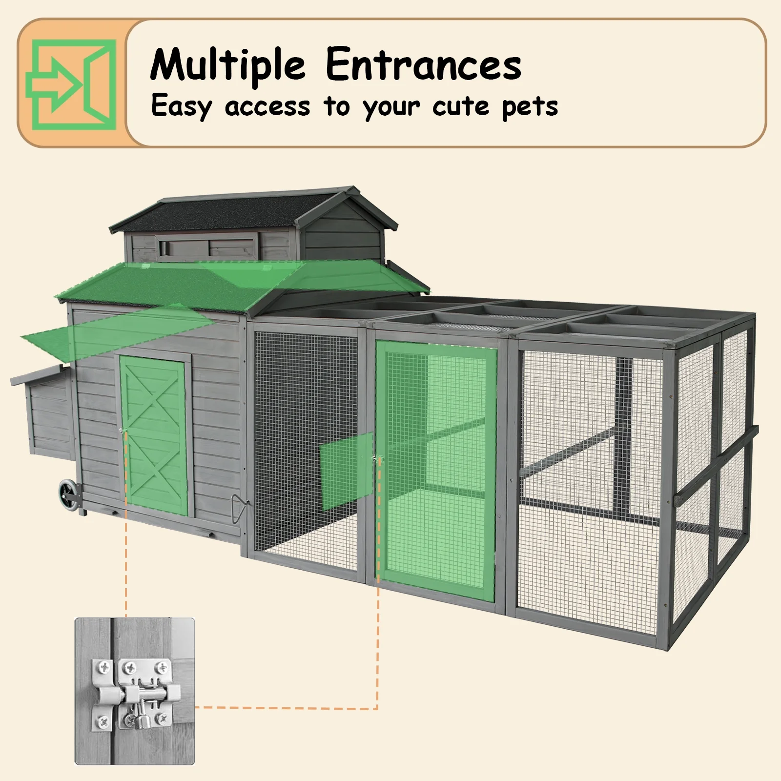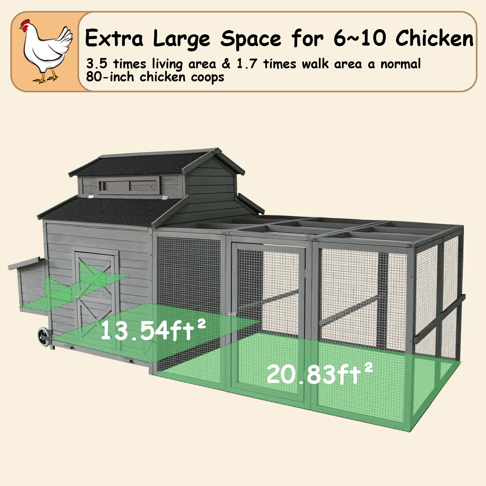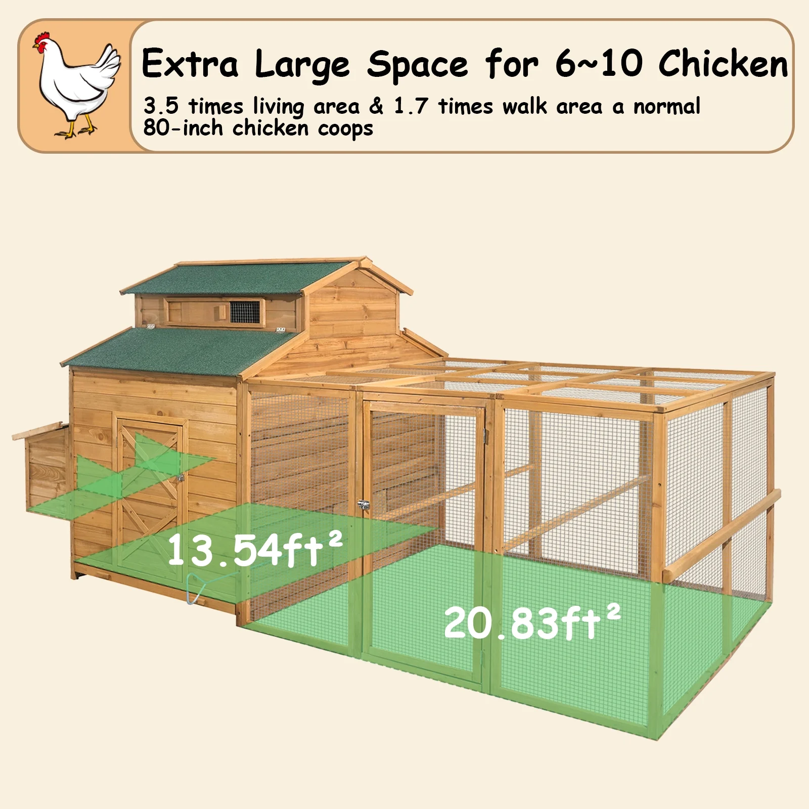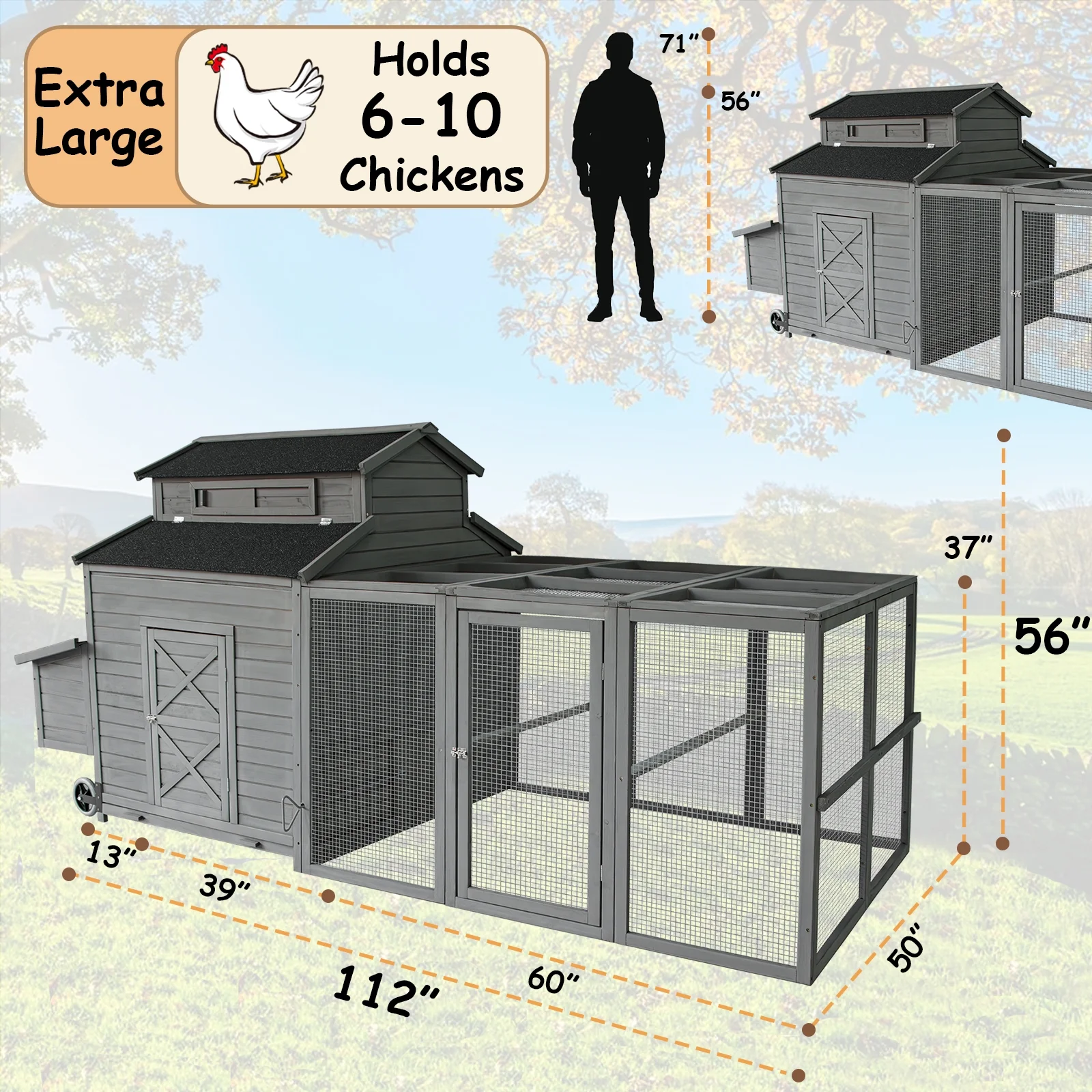 - Extra Large Space: 112"L x 50"W x 56"H coop, ample room for 6-10 chickens to live comfortably.
