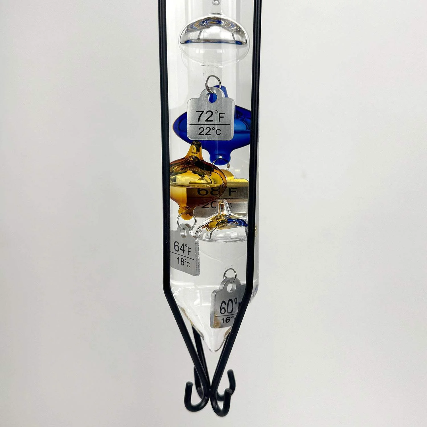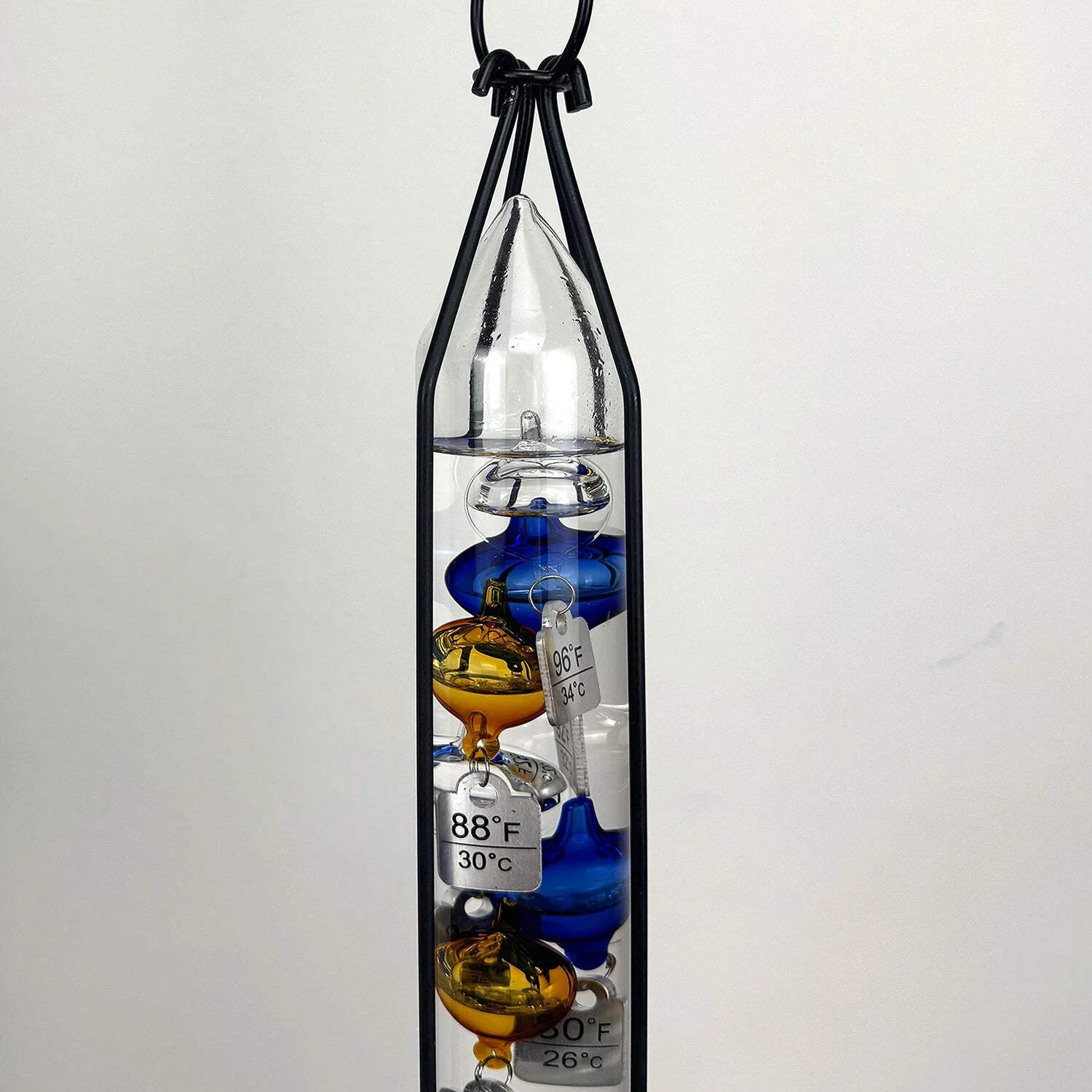 Inspired by the finding of Galileo Galilei, these high quality glass thermometers demonstrate how temperature affects density and buoyancy. Each glass orb is partially filled with liquid to achieve a precise weight. A metal counterweight for each temperature is hung from the bottom of the orbs. As the temperature changes, the density of the liquid inside each orb changes, causing it to rise or fall within the column. Each thermometer is individually calibrated to achieve an accuracy of 2��F/1��C.