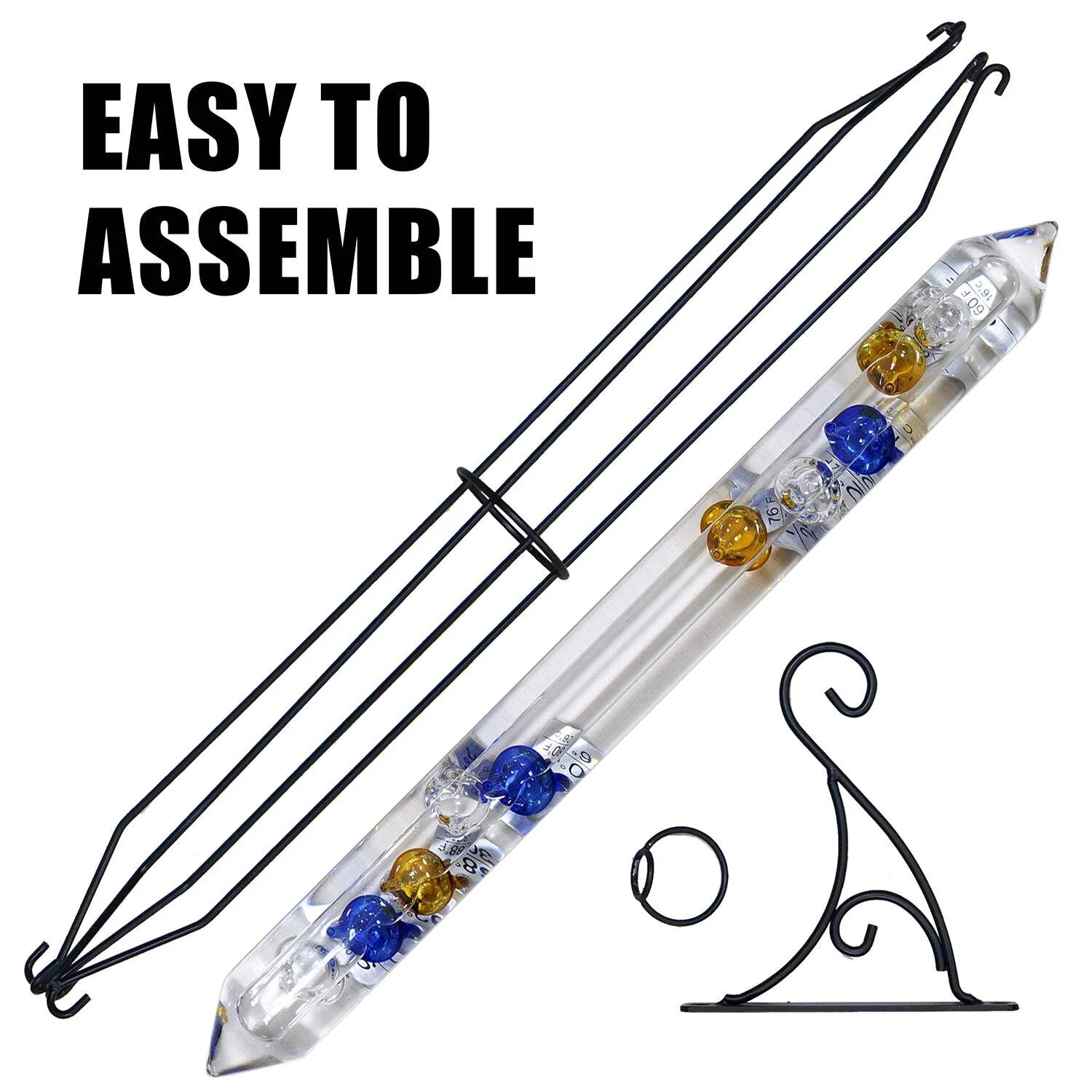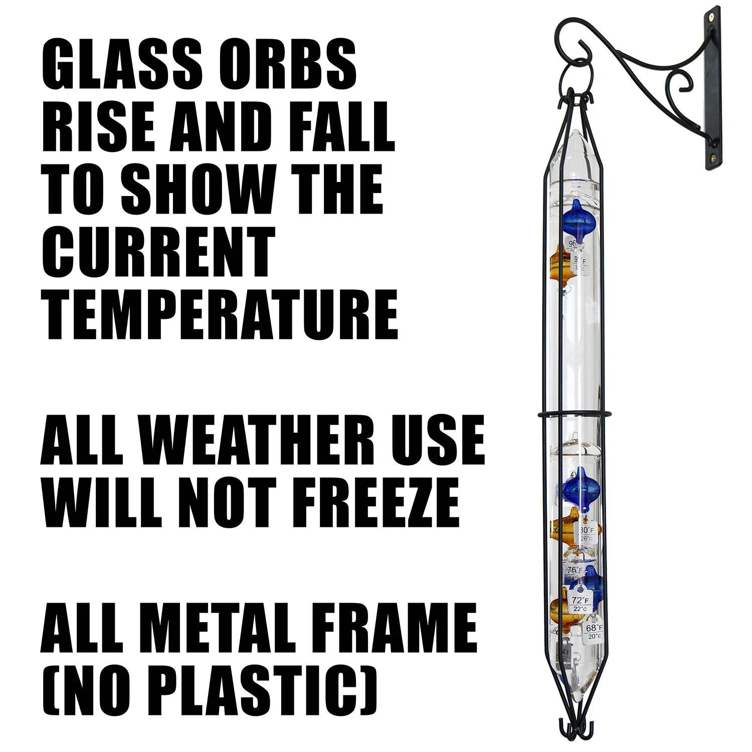 This hanging Galileo thermometer is the ONLY ONE that uses colored glass instead of colored liquid (which fades under direct sunlight). This feature means our Blue, Amber and Clear orbs will never fade, while the competitions will! This 2025 product update features dual temperature tags showing both Fahrenheit and Celsius as well as a redesigned hanging frame. We have removed all of the plastic pieces that were found on our previous metal hanging frame and replaced it with 100% metal parts (unlike the competition). Also, our model includes a hanging bracket (a $12 value) for free!