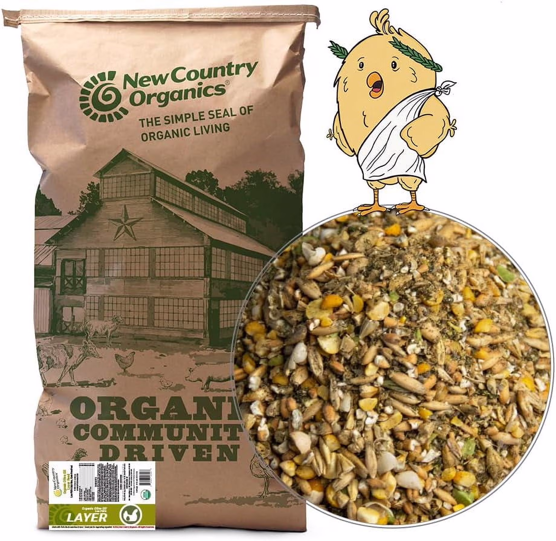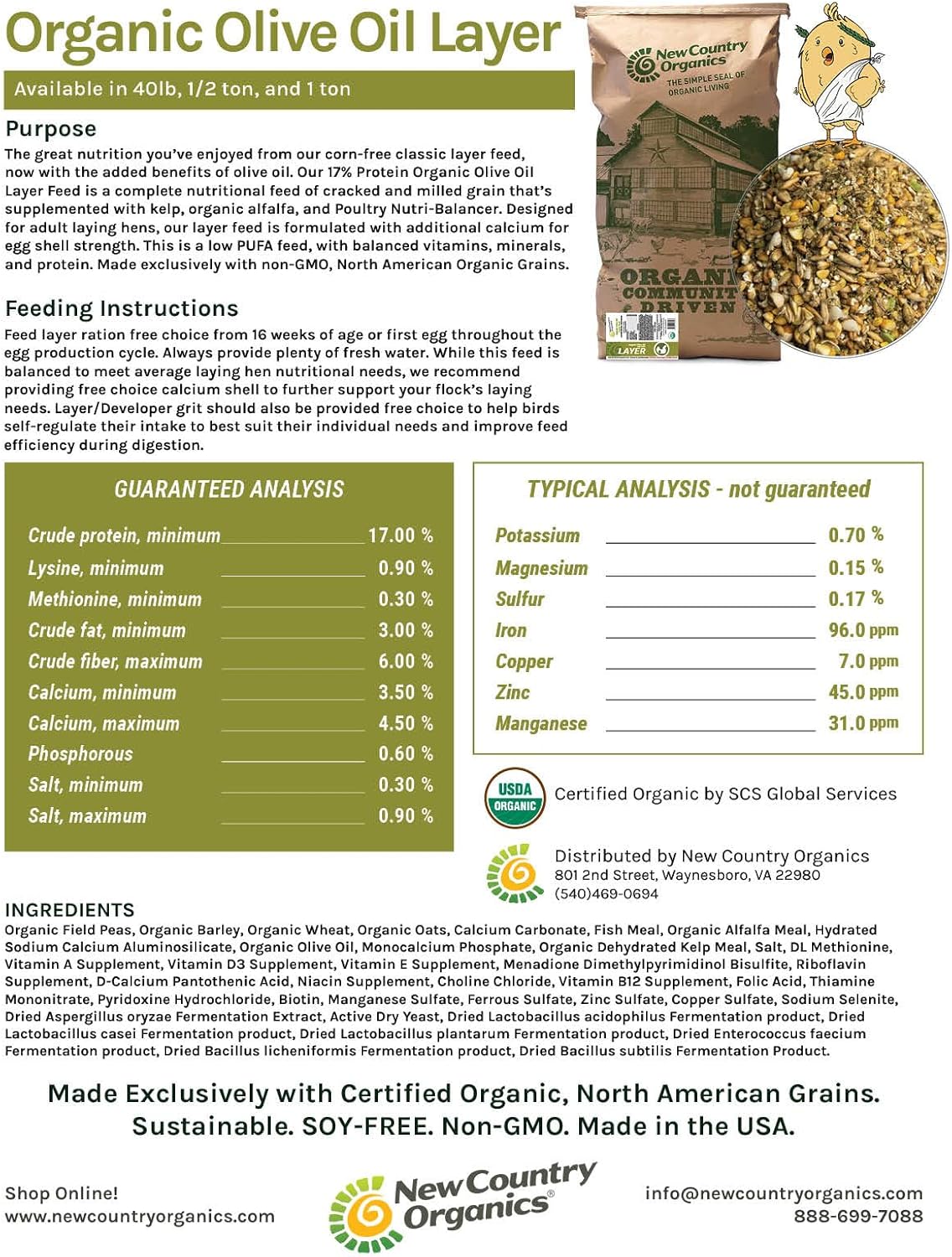 New Country Organics I Organic Olive Oil Layer Feed for Laying Hens | Corn - Free, Soy - Free | 17% Protein | High Omega - 3 Chicken Feed | Organic Chicken Layer Food for Healthy Eggs & Hens | 40 lb