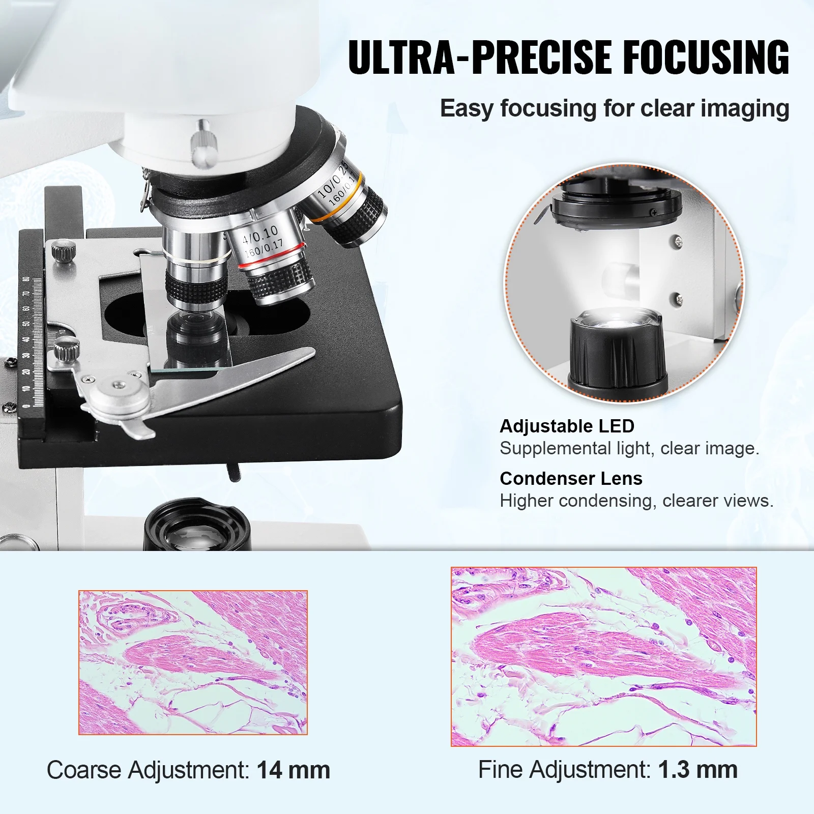 - Experience accurate and smooth focusing with the precision focusing system of our trinocular lab microscope. It features both coarse and fine adjustments for optimal focusing. The adjustable LED lighting system adapts to various lighting conditions, ensuring clear imaging.