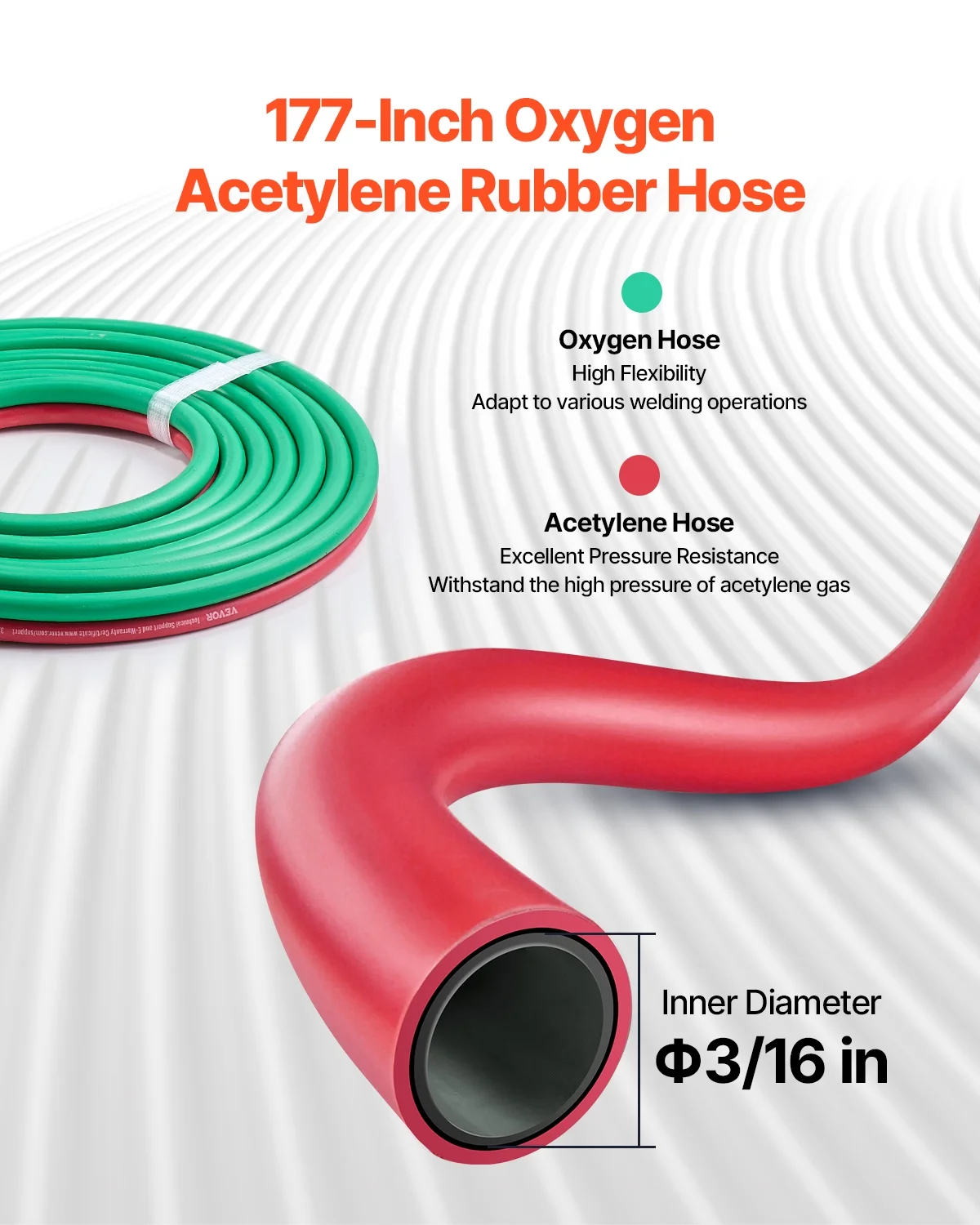 - Durable 177-Inch Hose: The oxy-acetylene welding kit comes with 2 hoses (177-inch) crafted from high-quality rubber and flame-resistant materials. Built for durability, it resists wear and aging, ensuring steady gas flow and reliable performance for the long haul.