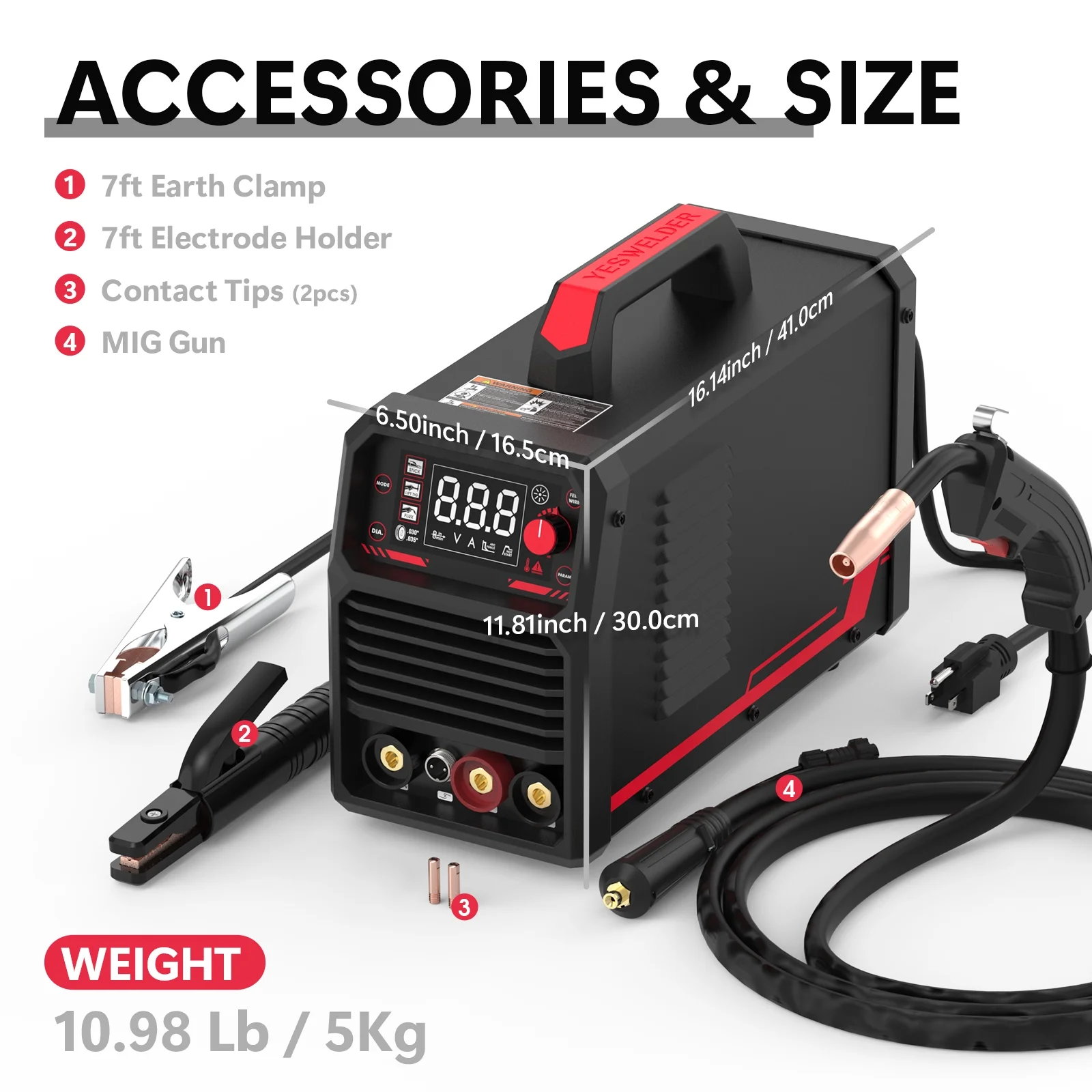 - Versatile 3-in-1 welder capable of gasless MIG, Stick, and Lift TIG welding for a wide range of welding applications