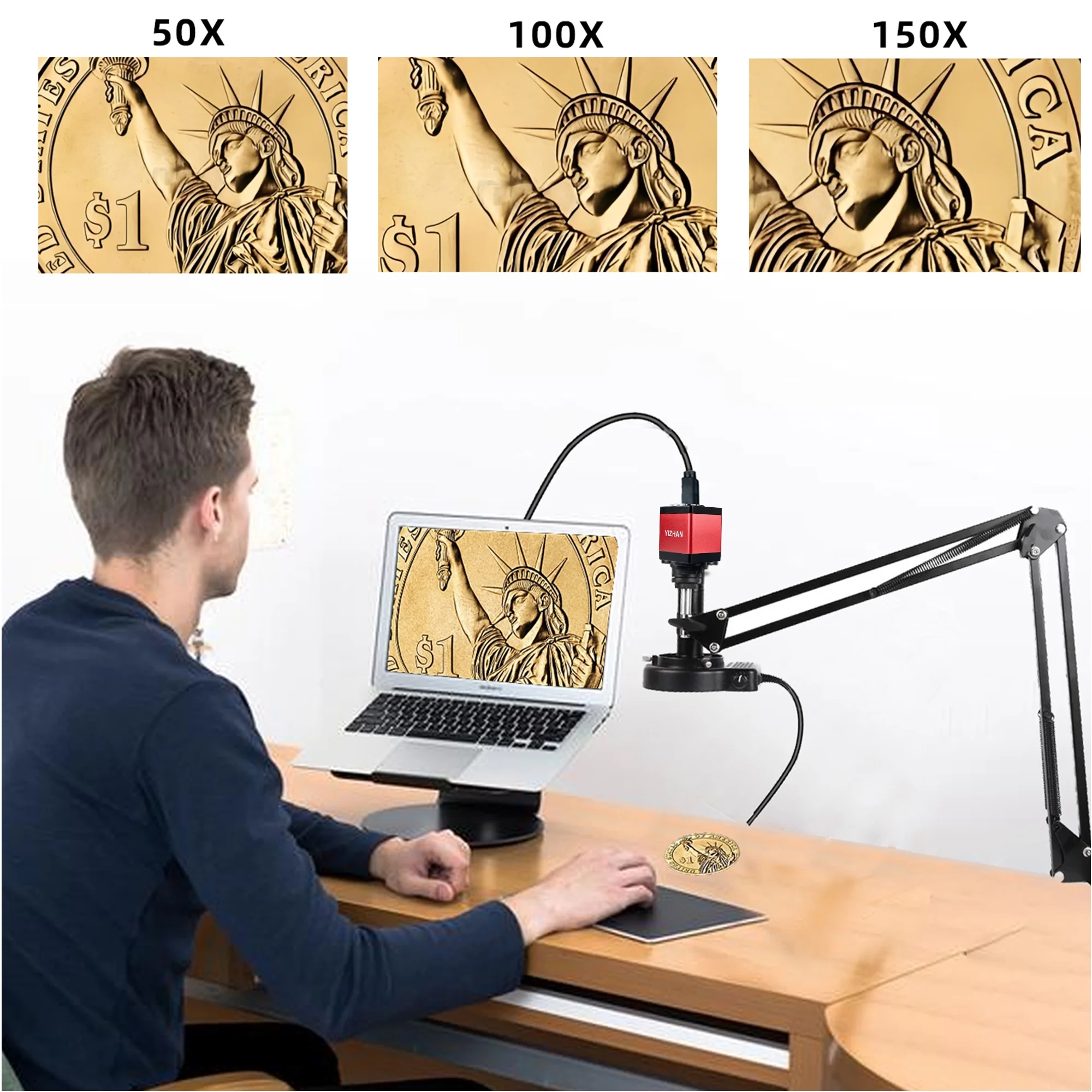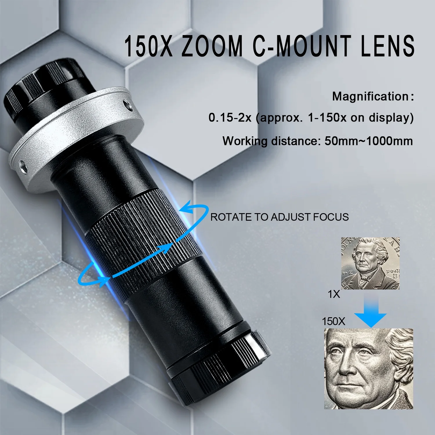 - ?��150X Zoom C-mount Lens��: The digital microscope adopts 150X zoom C-mount lens, the maximum working distance of the lens is up to 1000mm, and the magnification on the display is from 1-150x. You can adjust the magnification by the knob on the lens. This industrial microscope is suitable for many working scenarios, such as electronic repair, coin observation, etc.