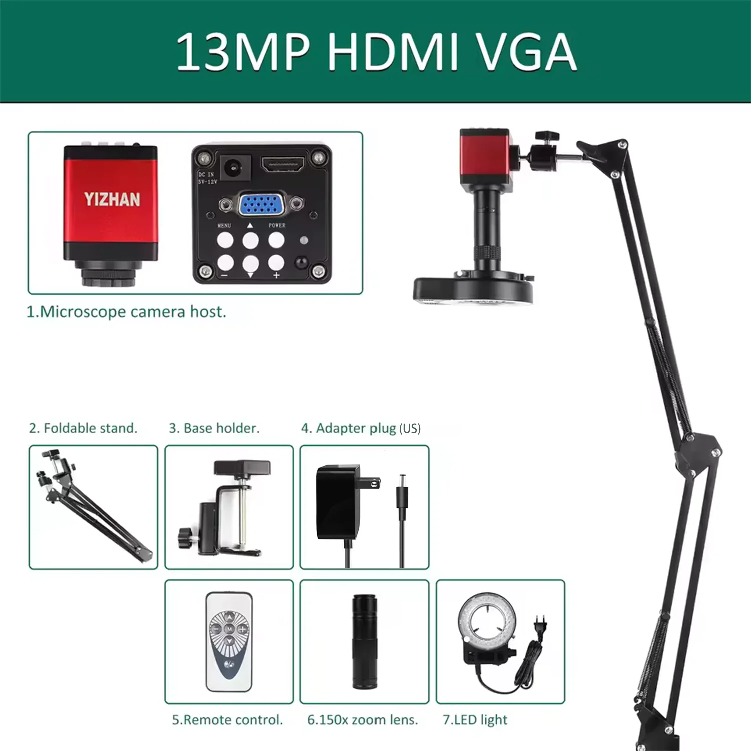 YIZHAN Digital Microscope for Adult 13MP 1080P HDMI VGA Industrial Video Microscope with 150X Zoom C - Mount Lens Foldable Stand LED Ring Light for Electronics Inspection, Jewelry and Watch Repair