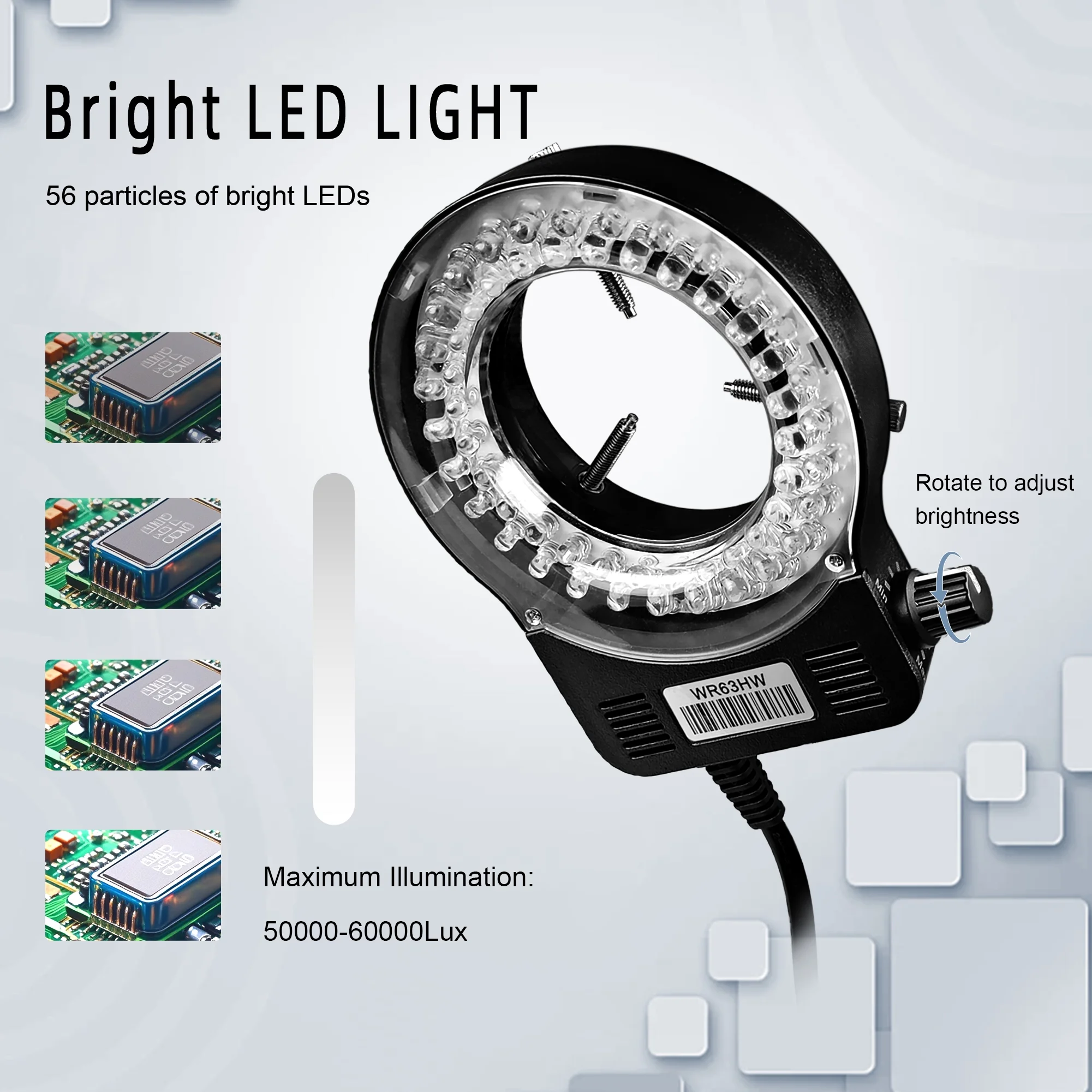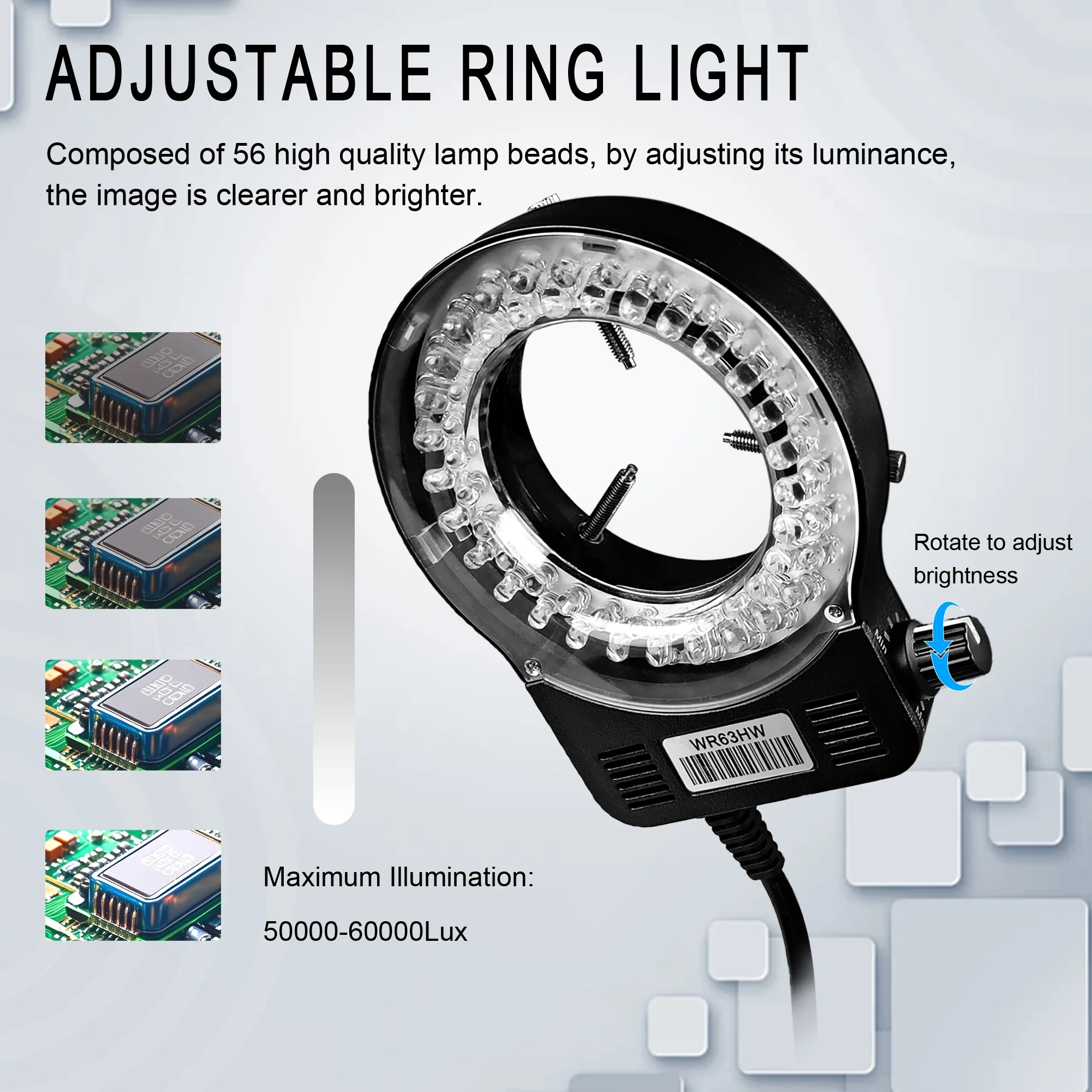 - ?��Bright LED light��: the industrial microscope is equipped with a bright LED ring light, the ring light consists of 56 bright LED beads, the light color temperature is 6500K-7000K. the ring light can be adjusted brightness, the maximum illumination is 60,000 Lux. the ring light can make the video microscope to get clearer pictures and videos when working.