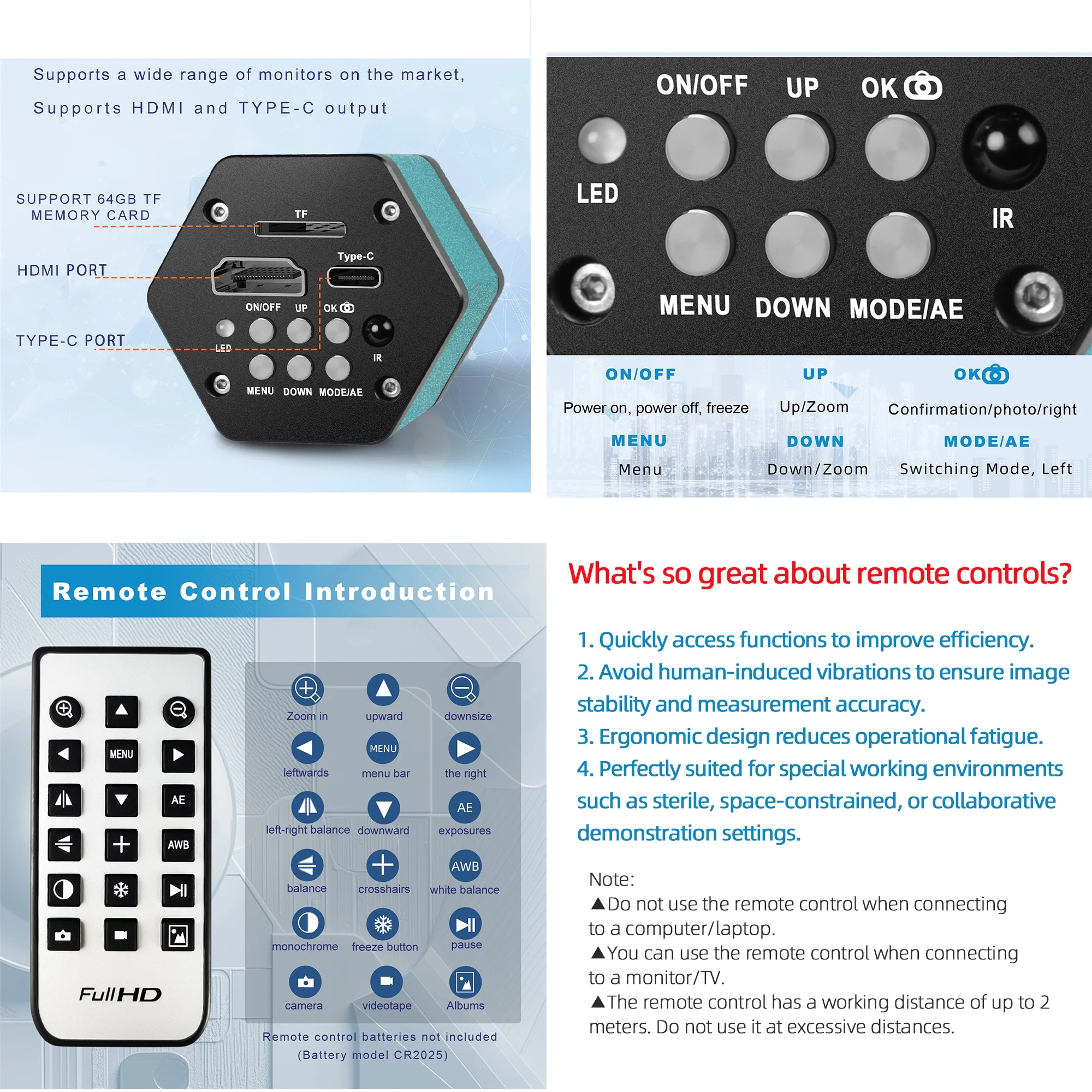 - ?��Flexible stand, remote controller��: The digital microscope adopts a foldable stand, which is very flexible and stable, and the four parts of the stand can be adjusted at different angles. You can choose the most suitable position for you to observe the samples more clearly. The video microscope can be controlled by remote control, but this function is only available in HDMI output mode.