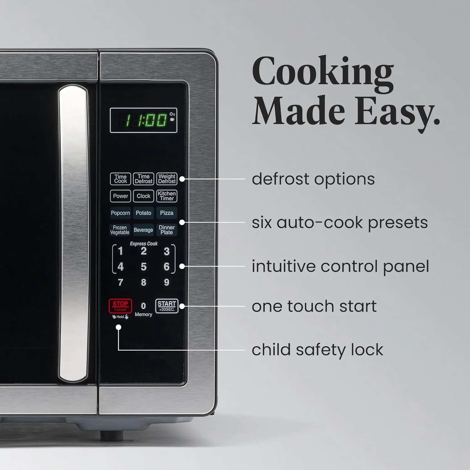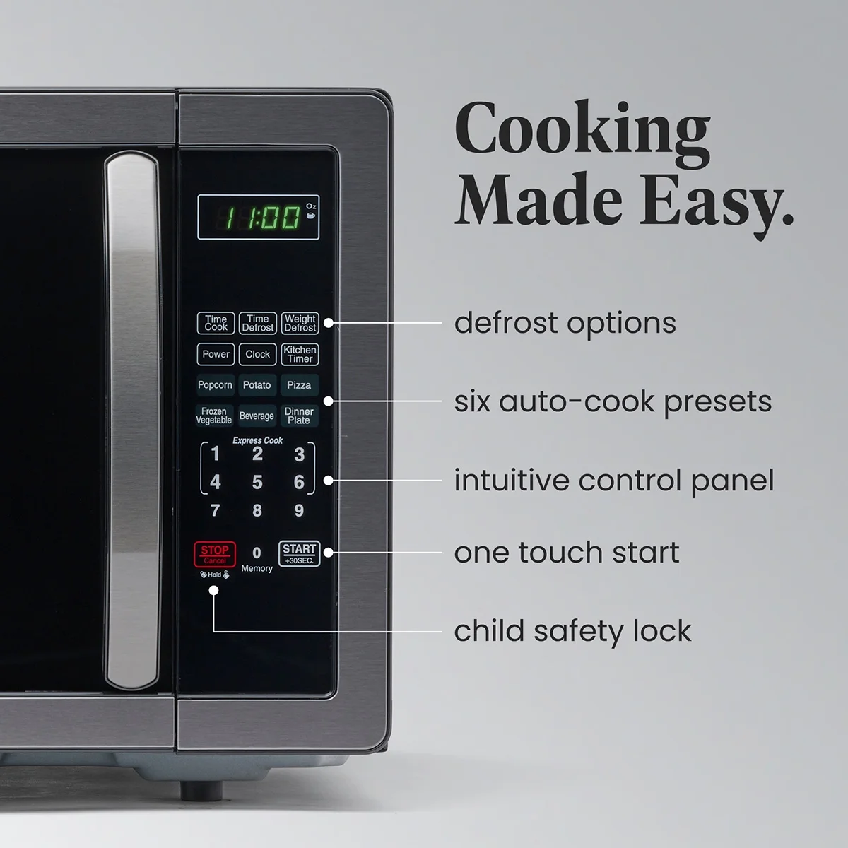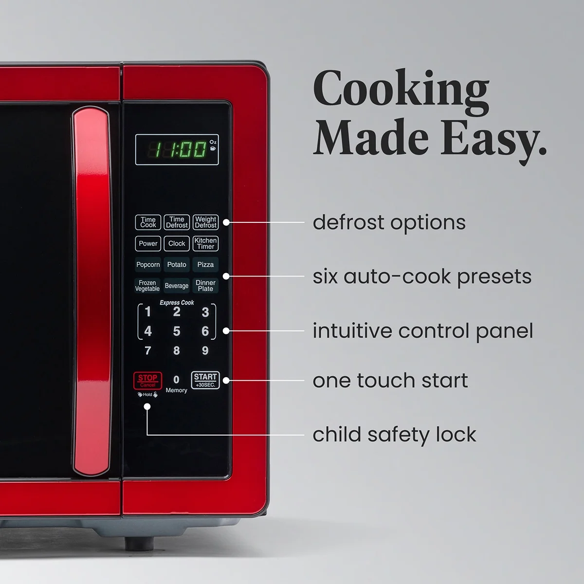 We��ve got your back with convenience and safety in mind. The clear LED display, kitchen timer, and clock make navigating your microwave oven a piece of cake. Our countertop oven also comes with a child lock, because every cooking adventure is meant to be worry-free.