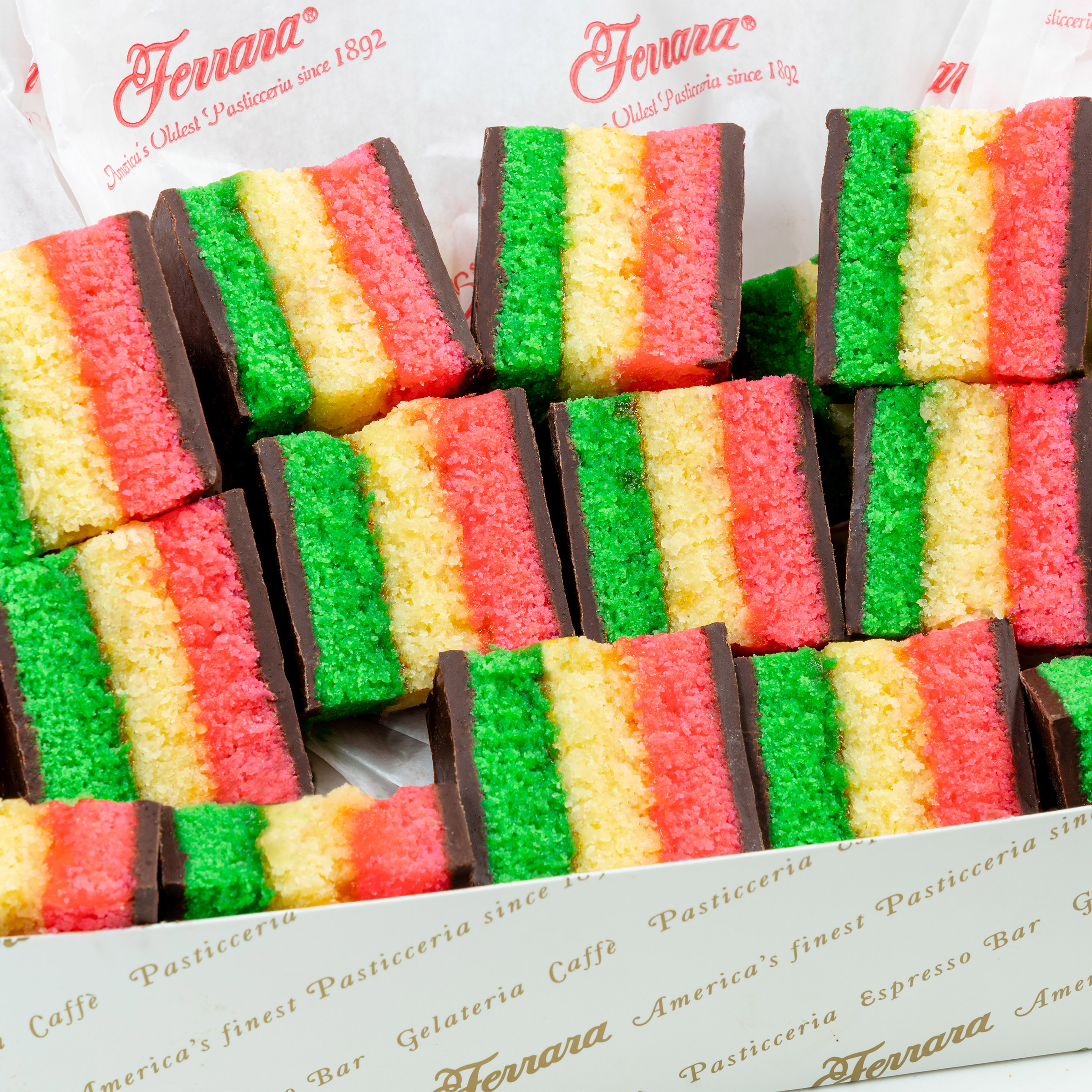 Ferrara's Bakery of Little Italy in New York CityWith our secret recipes that span three centuries, this fifth-generation family-owned bakery continues to handcraft Italian desserts from the same location in NYC’s Little Italy since 1892.Ferrara’s traditional rainbow (tricolori) cookies are made in-house daily from a secret recipe that Antonio Ferrara used when he opened the bakery. This Tri-color or Rainbow cookie features layers of cake made from almond & macaroon paste that are sandwiched with apricot jam and coated in chocolate.A little history about the world famous Ferarra bakery.   Since 1892 when our great grandfather, Enrico Scoppa and our great grand-uncle, Antonio Ferrara, opera impresario and showman, opened a cafe called Café A. Ferrara in Little Italy section in New York City we have prided ourselves on creating superb Italian specialties.We take the extra step of baking two, three and sometimes four times a day, in small batches. Because of the frequency with which we bake, Ferrara acquired our great reputation for quality and freshness. Today, Ferrara is still a family owned business operated by the fifth generation. Тhat’s perhaps the most wonderful thing about Ferrara. Since its beginning in 1892, the spirit, recipes and devotion to quality has changed very little.Rainbow Cookies can be refrigerated for up to a week or frozen for up to 6 months. Once opened, store in an airtight container and serve at room temperature.