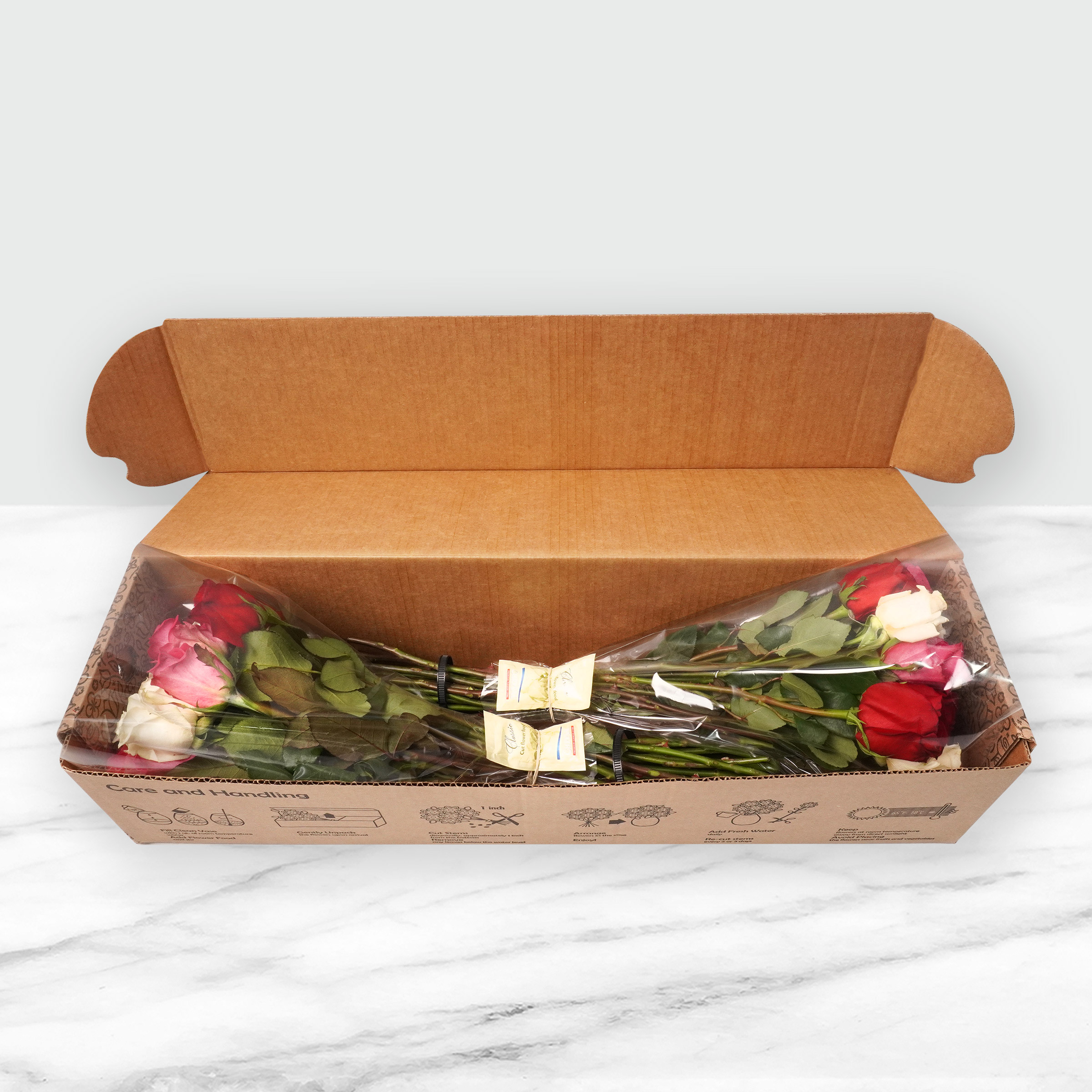 How to Order: We will attempt to deliver your floral order by the end of the day on your preferred arrival date, however, your order may arrive one day before or after your selected date. Next day orders must be placed prior to 11:00 am PST Monday through Thursday, in order for them to arrive next day. Due to the perishable nature of this item, orders do NOT ship Friday through Monday. Orders only arrive Tuesday through Friday. Are your flowers for an event? Many of our flowers ship in bud form. We suggest ordering your flowers to arrive 2-3 days before your event to allow them bloom. Did your flowers arrive looking thirsty? No worries! Just follow the included care and handling instructions to properly hydrate your flowers. After a fresh drink of water, your flowers will blossom and look more full. Flowers pictured on the site are taken after three days in water. Floral Details: Our stunning Rainforest Alliance Certified roses are hand-picked from our South American farms. While we pride ourselves in providing the highest quality flowers, we are also socially responsible - protecting the environment and the farm employees in the process. All of our roses are made to impress with larger, bolder, and more vibrant colors. We put our heart into every stem we grow. Each box contains 2 bunches of 25 stems, wrapped in corrugate sleeves for protection during shipping. Vase not included. Suggestions: Tell them how you feel! Gift messaging available during the checkout process. If you want gift messages on multiple orders, individual orders need to be placed. Need Help? For answers to frequently asked questions, please enter the following URL into your search bar: www.flowernet.com We are here to help! Email:  support@flowernet.com Phone: 877-285-1256 7:00AM – 3:00PM (PST), M-F