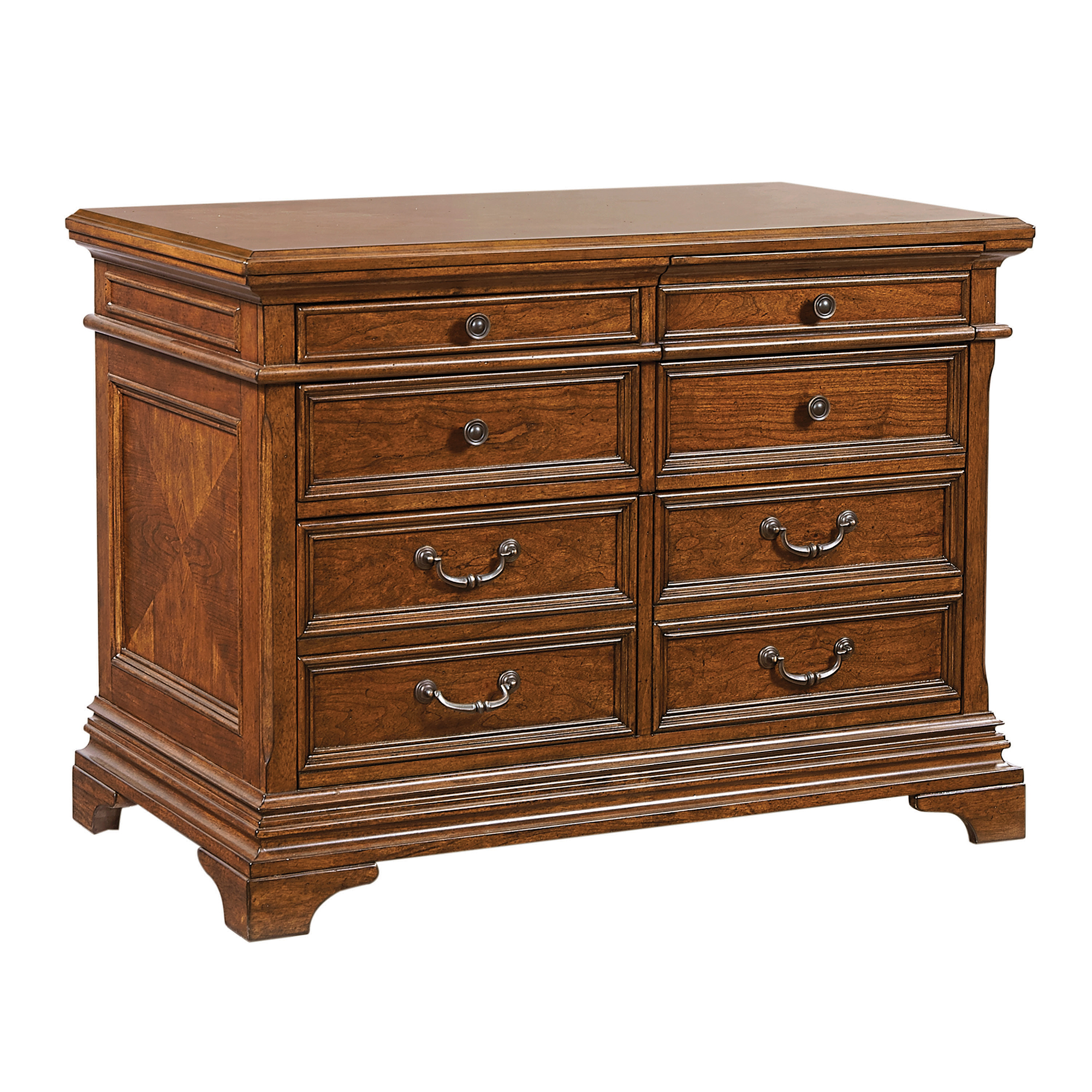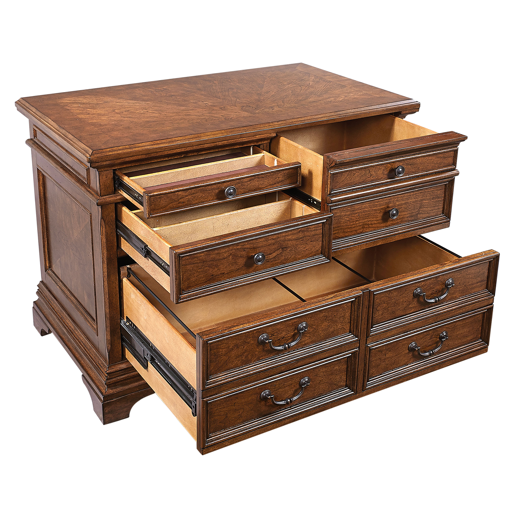 • Utility drawers include adjustable dividers for office supplies and paper storage (top left drawers)