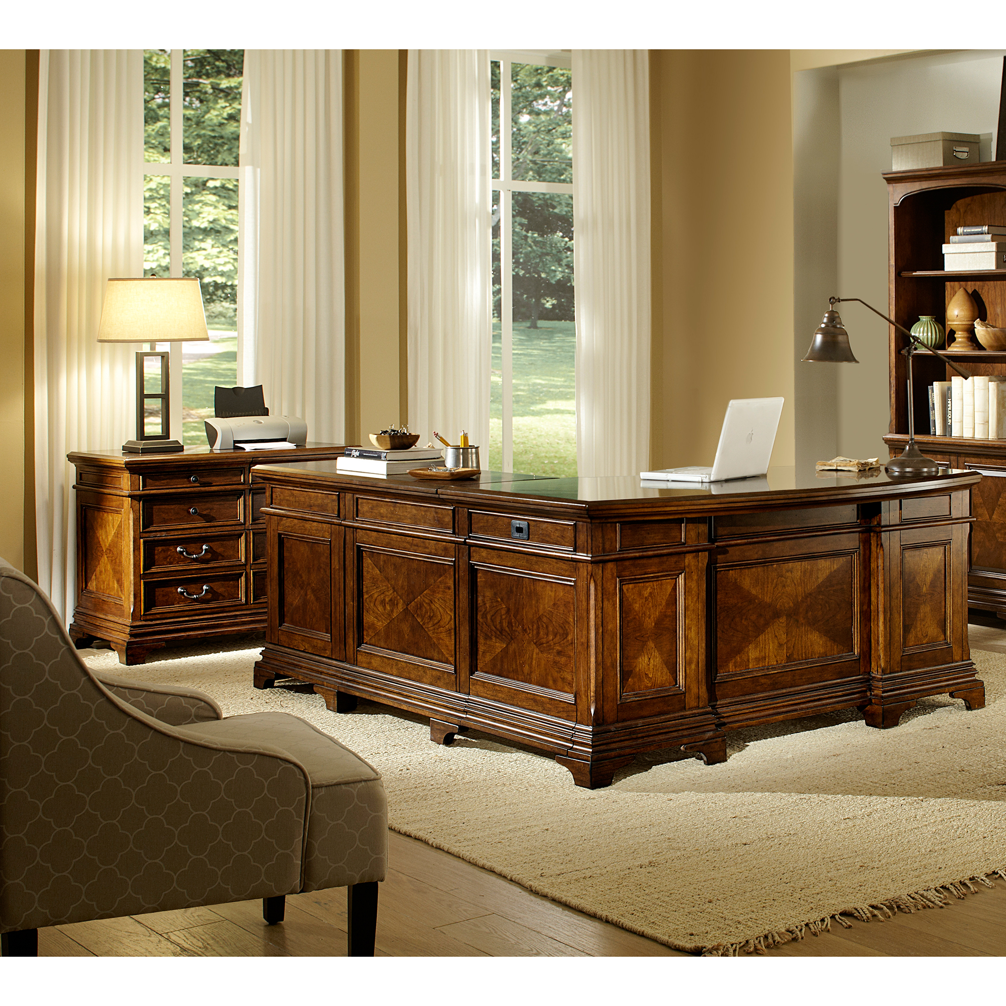 Updated for today’s lifestyles, the desks feature a curved desktop shape that encourages correct sitting posture with everything you need comfortably within reach. Practical features include legal/letter sized file storage, AC outlets for charging, adjustable dividers and touch lighting. This combination of classic design, quality construction and unique features make the Lewis Office a perfect choice for nearly any home or office.66” Return Desk: