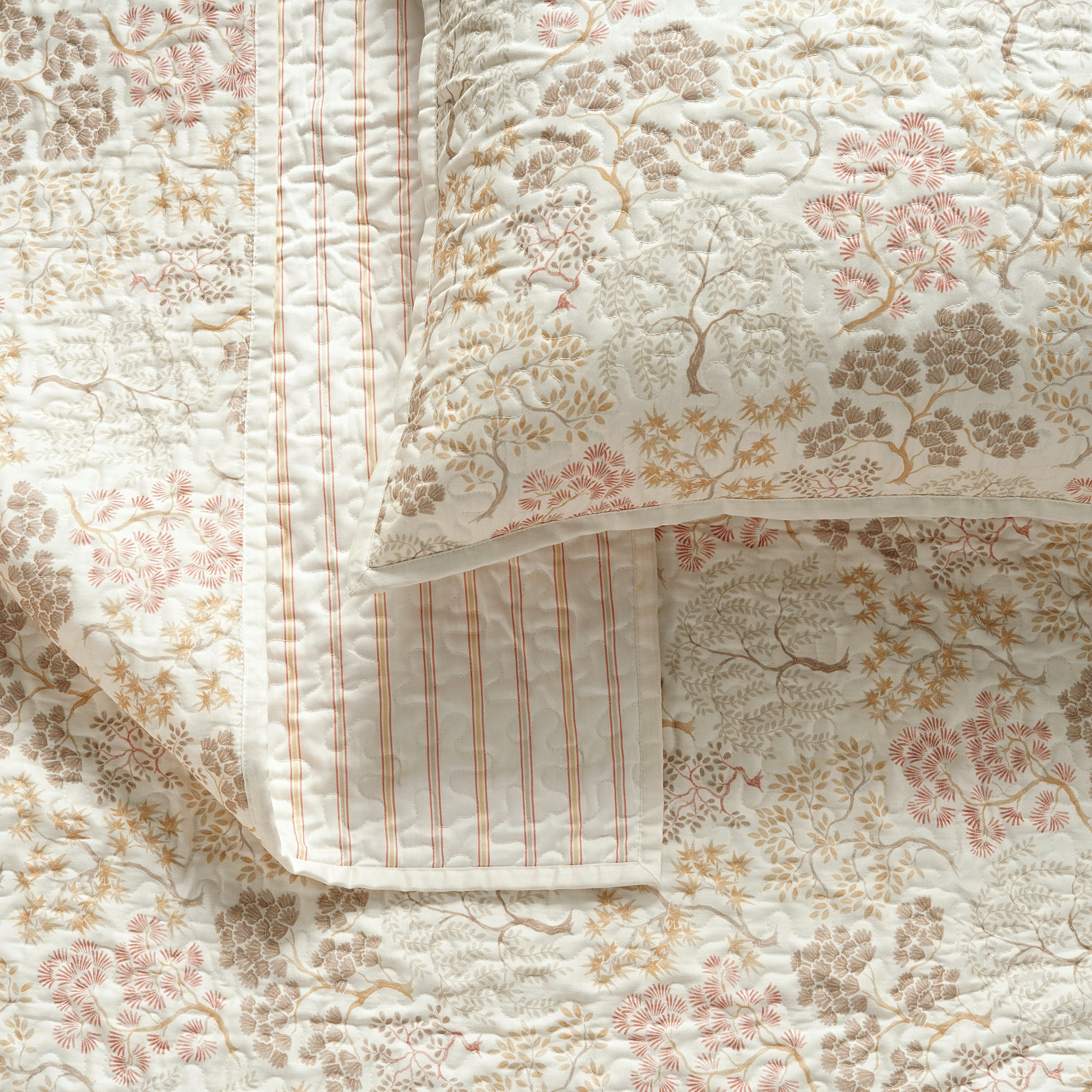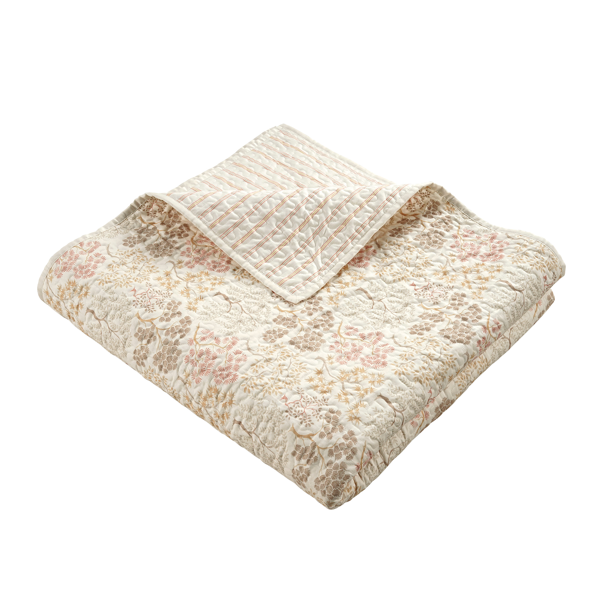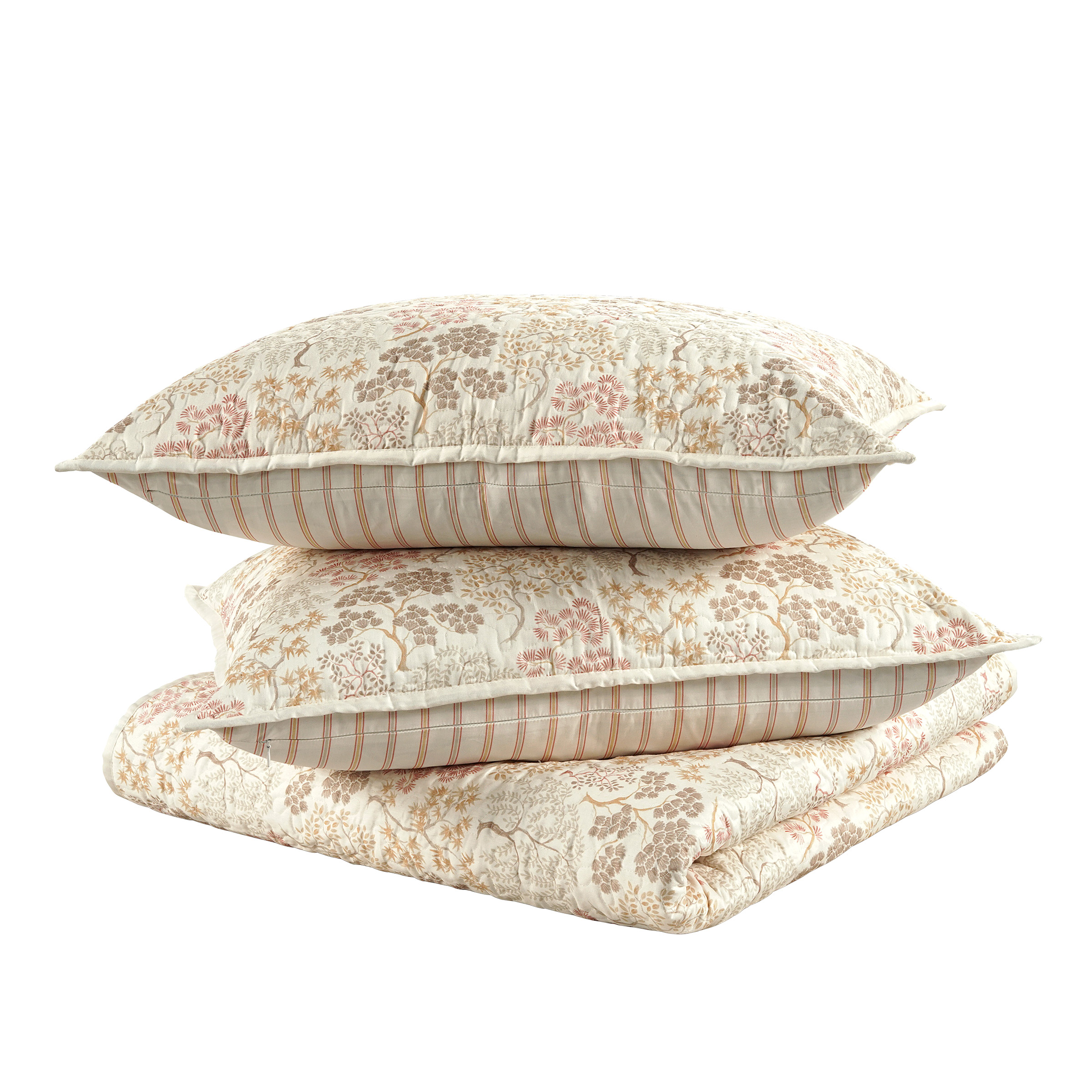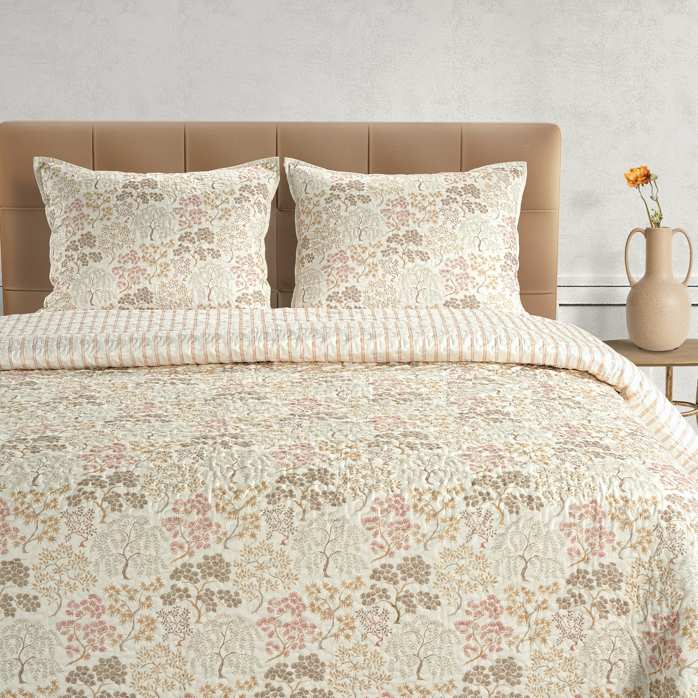 Give your bedroom a soft, relaxed update with this 100% cotton quilt set. One side features a delicate floral print in warm, earthy tones, while the reverse has subtle stripes for a clean, easygoing look. Just flip it over whenever you want to switch things up! This set includes one quilt and two matching shams—all lightweight and machine washable for effortless care. Crafted from 100% cotton, it offers a soft, breathable texture that's perfect for year-round use, adding a touch of timeless charm to any bedroom. Features: