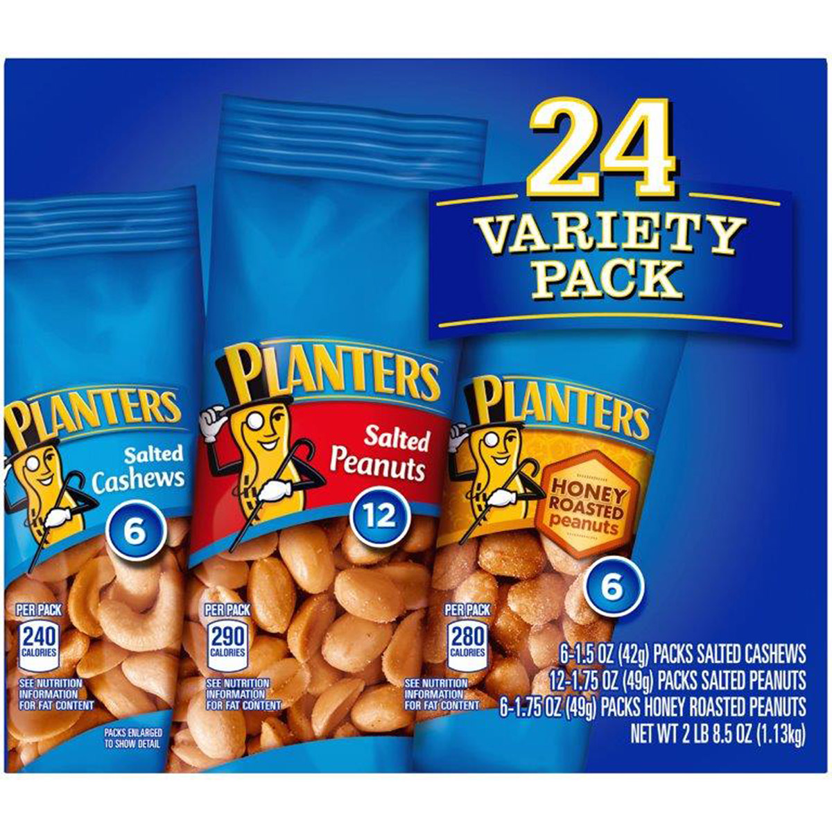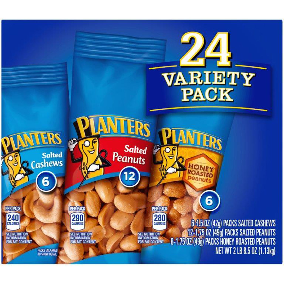 Planters Peanuts and Cashews Variety Pack lets you easily satisfy any craving. Our multi-pack contains three flavors of delicious, crunchy roasted nuts, so there's always an option for you. Choose from 6 packs of Planters Salted Cashews, 12 packs of Planters Salted Peanuts, or 6 packs of Planters Honey Roasted Peanuts. Each snack nut is packaged in single-serve packs for grab-and-go snacking. Toss these roasted mixed nuts in your lunchbox or backpack for a convenient and delicious snack no matter where you go, or hand out the box of 24 snack-size packs to your friends and family so everyone can enjoy them.