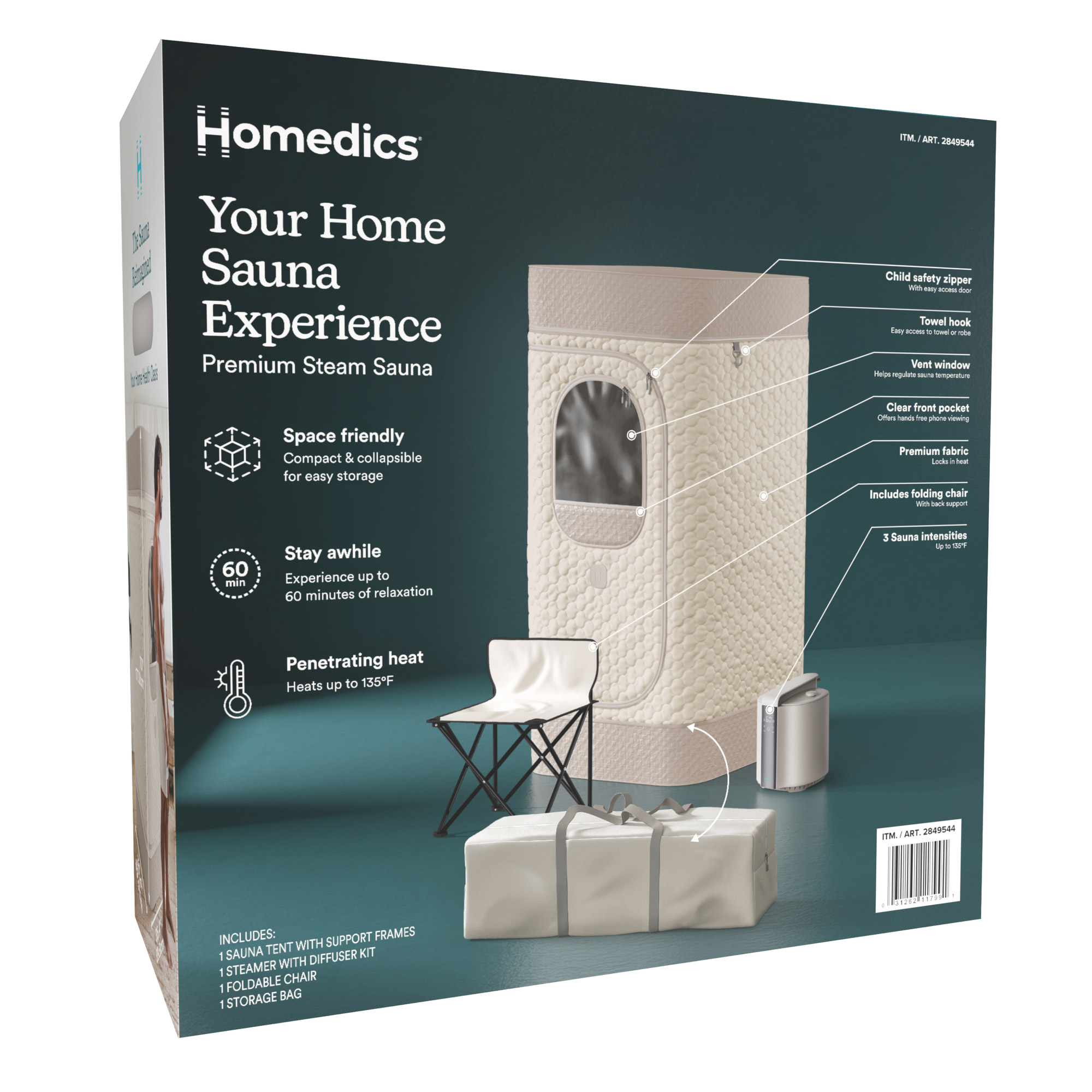 Relax, unwind, and recover with the ultimate steam sauna experience now in the comfort of your home. The Homedics Premium Steam Sauna heats up to 135°F with 100% humidity, helping to reduce stress, improve sleep, soothe sore muscles, and promote healthy skin and many other health benefits. With simple, tool-free setup and steam-ready in just 15 minutes, you can enjoy up to 60 minutes of uninterrupted relaxation whenever you need it. The extra-large, space-saving design comfortably accommodates individuals up to 5'10", then folds down into a storage bag for effortless portability. MoistureLock technology ensures a waterproof floor, while premium fabric locks in heat. Whether you're recovering post-workout or just need a wellness moment to yourself, this sauna brings the spa to you.