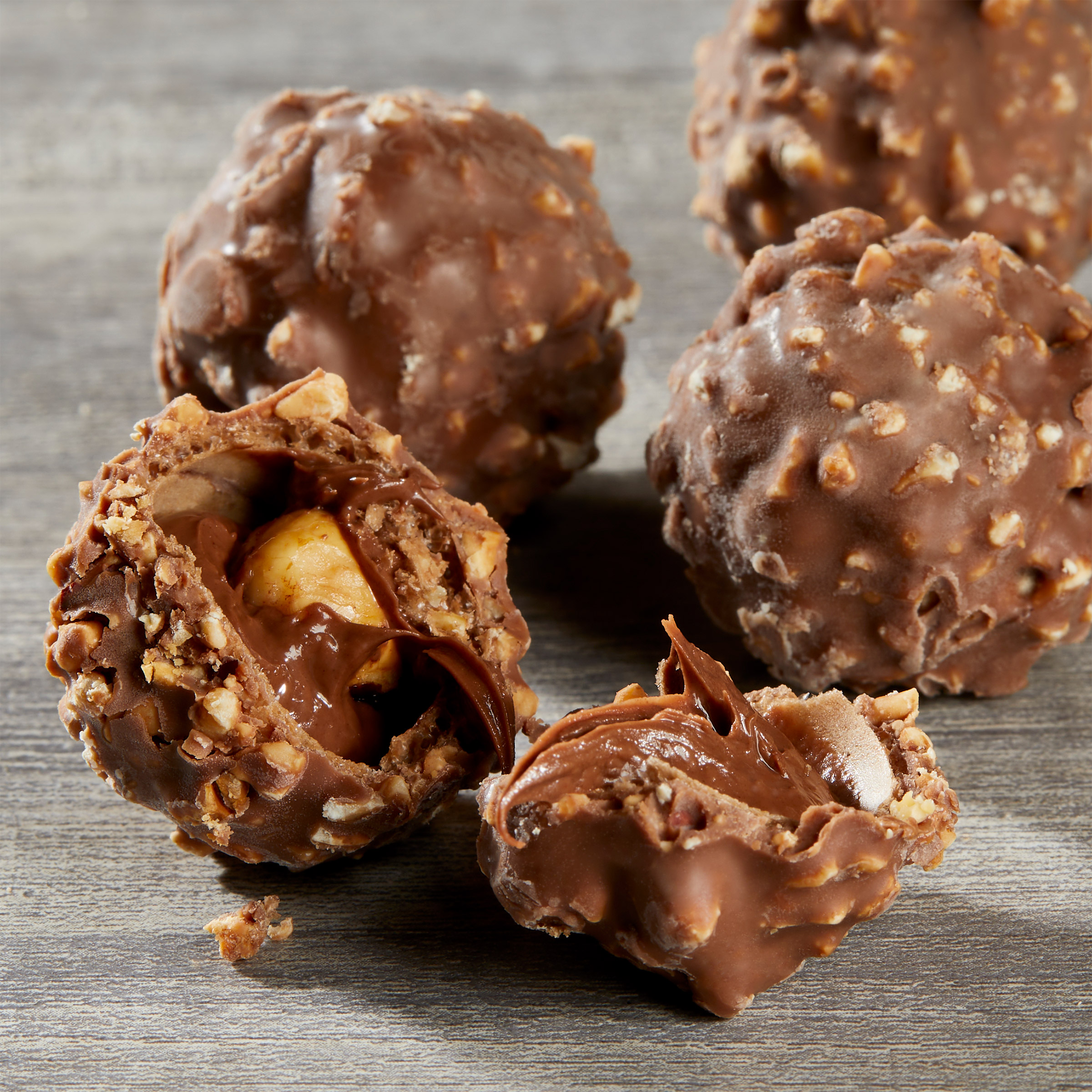 • MILK CHOCOLATE HAZELNUT: A tempting combination made with a whole crunchy hazelnut dipped in delicious creamy chocolate hazelnut filling and covered with milk chocolate, crispy wafers and gently roasted hazelnut pieces