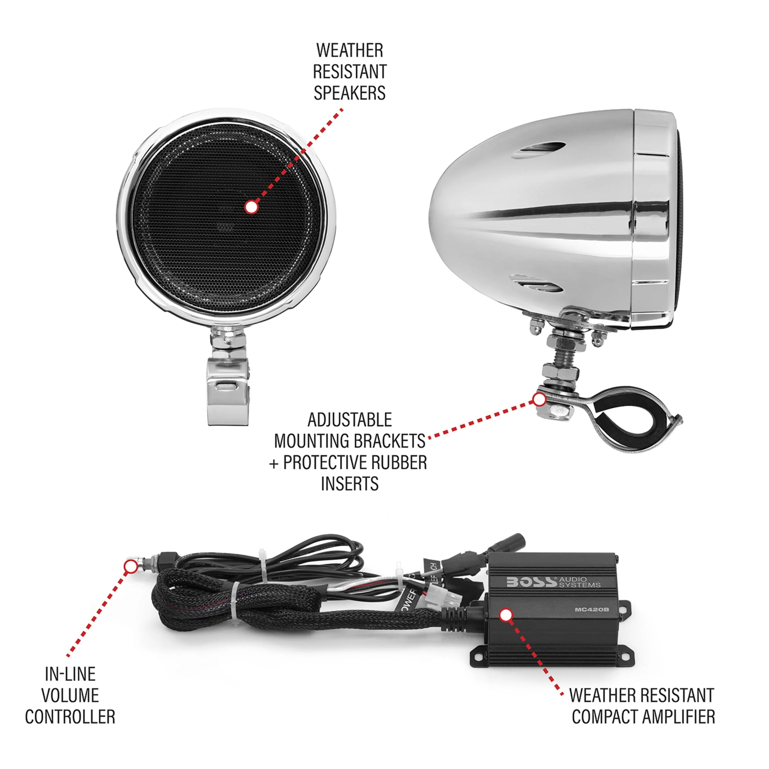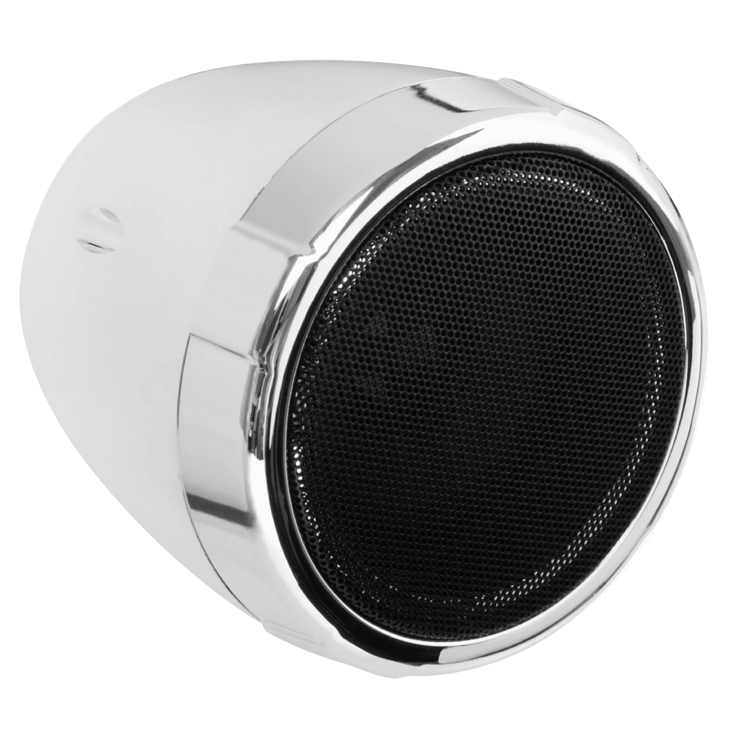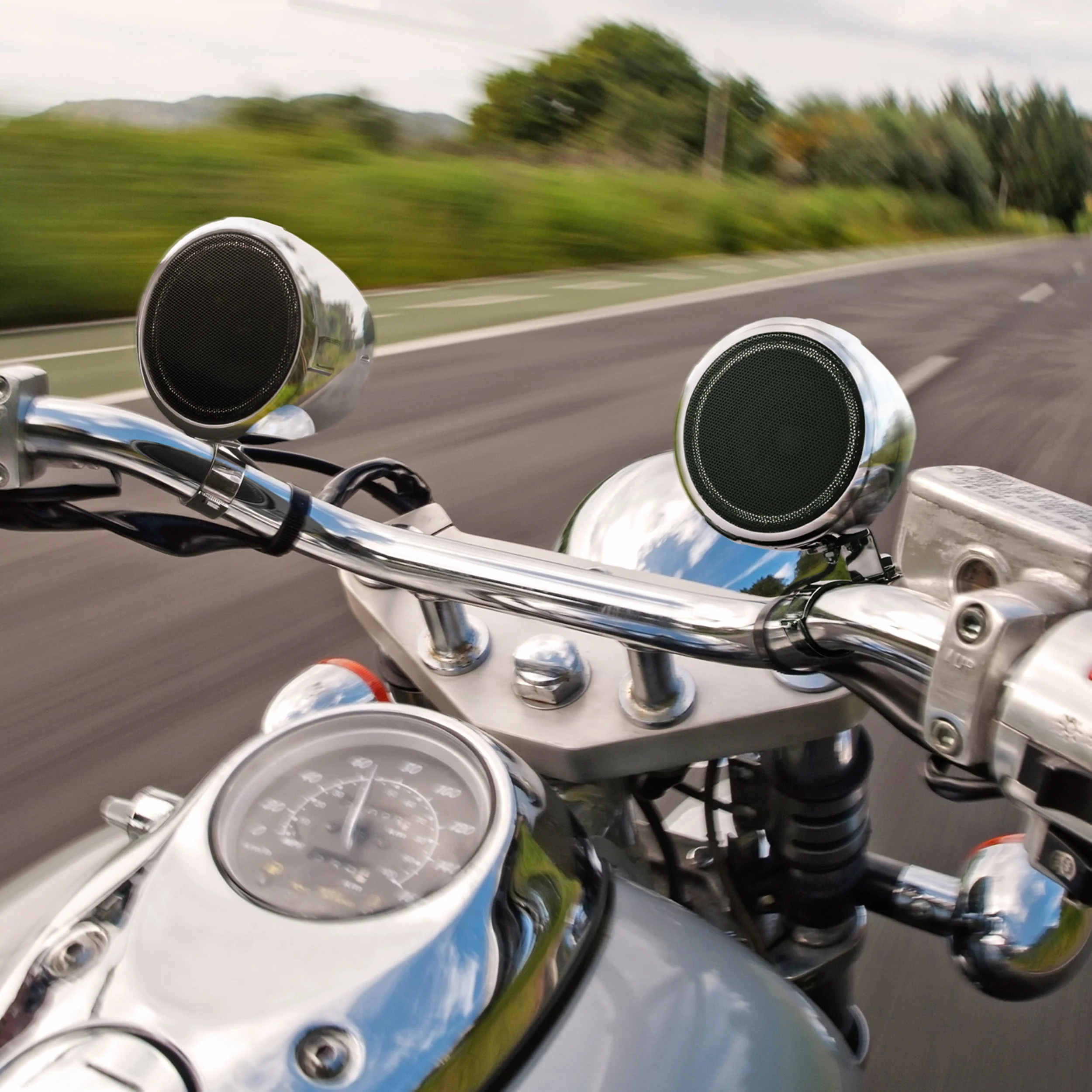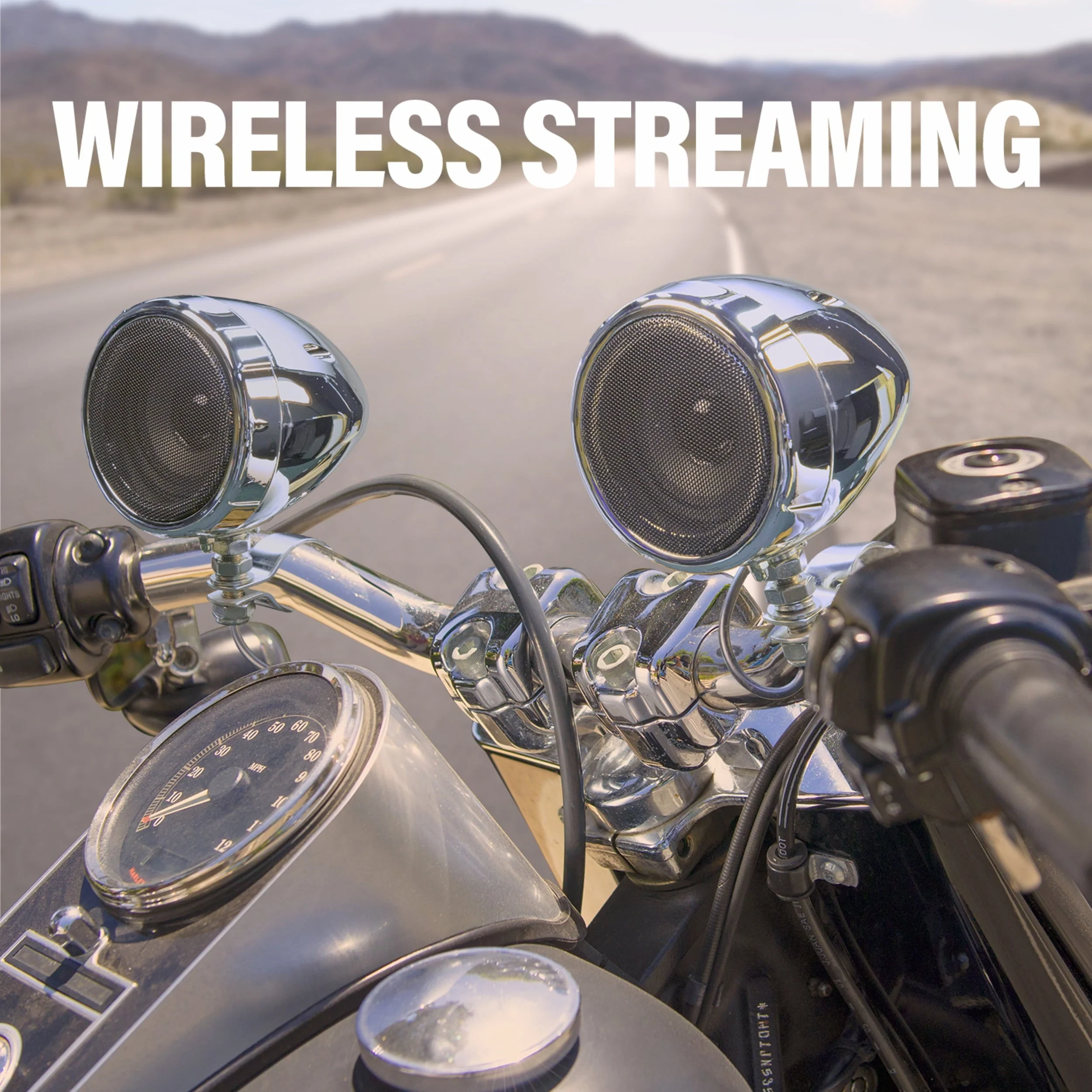 This pair of chrome, 3 inch, full range speakers are great for 12V motorcycles, scooters, and ATVs. They have a peak power handling of 600 watts and show off Bluetooth audio streaming to blast your favorite bangers.