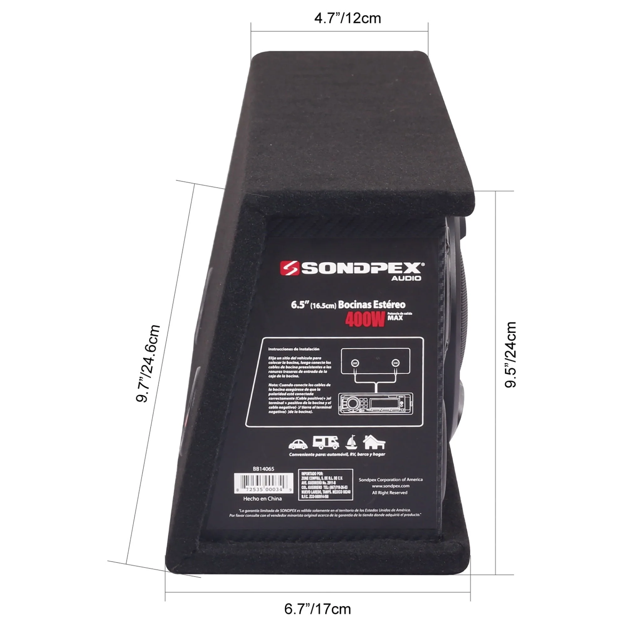 400W 6.5" 2-Way Speaker System. When you want to take your car stereo from ordinary to extraordinary, get your hands on one of these speaker system. This four-speaker system features two high efficiency 6.5" woofers for thundering bass and two 3" horn tweeters for incredible highs. Also features protective metal grill, carpet covering, and convenient carrying handle.