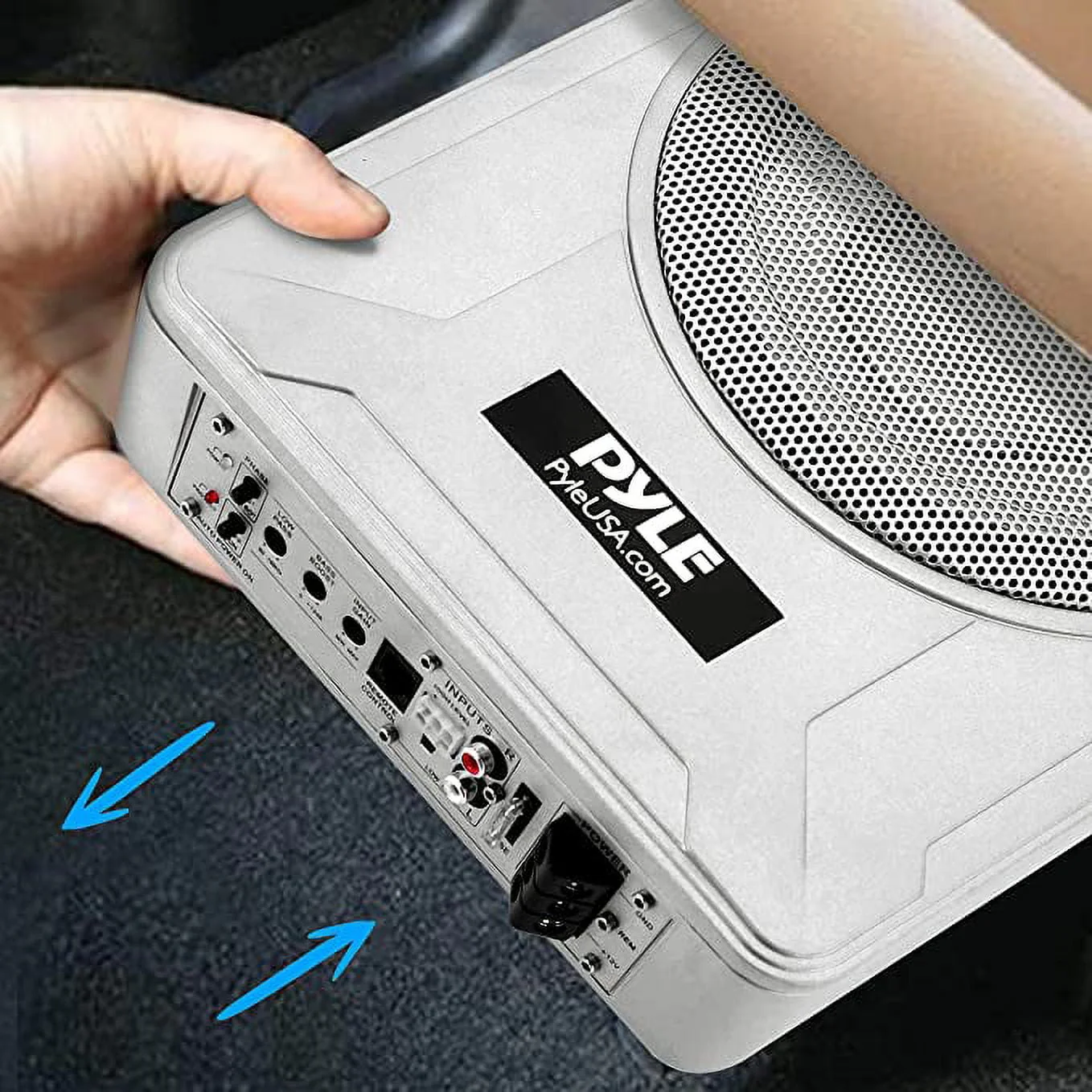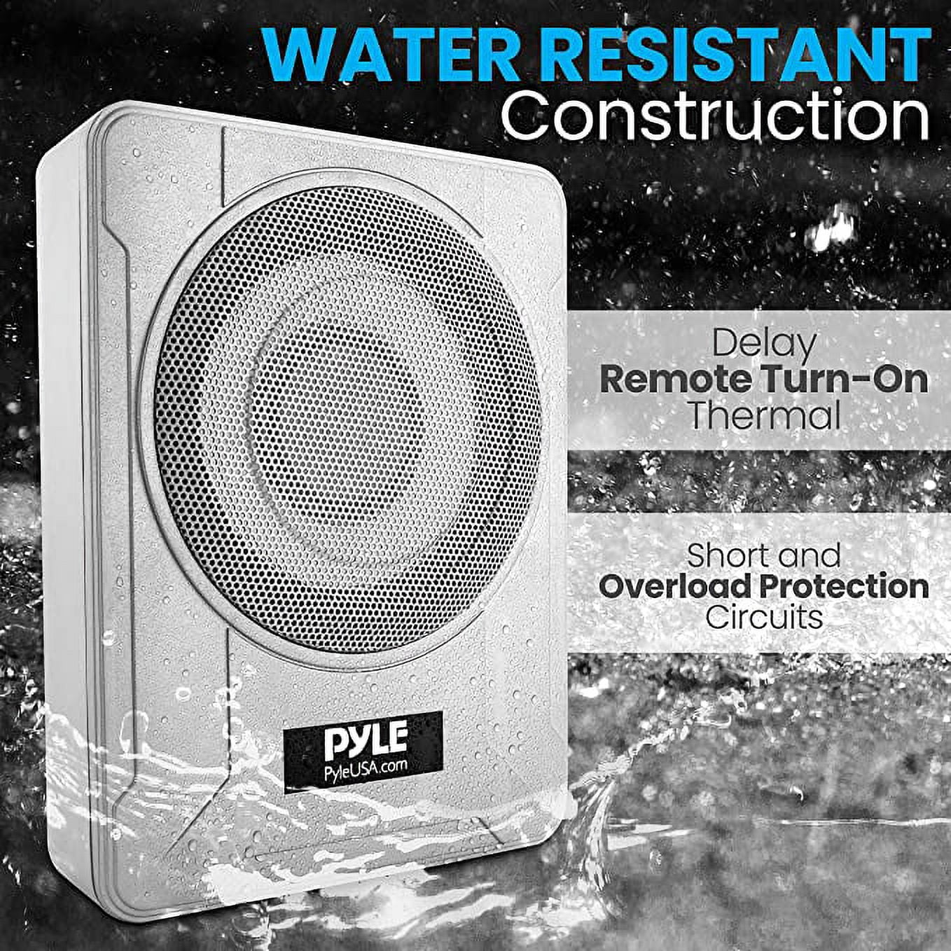 Pyle 8-Inch Low-Profile Amplified Subwoofer System - 600-Watt Compact Enclosed Active Marine Under seat Car Subwoofer with Built in Amp, Powered Car Subwoofer W/ Low- & High-Level Inputs PLMRSBA8 - 8″ Slim Woofer Low-Level RCA Input High-Level Speaker Line Input Blue LED Power Status Indicator Red LED Protection Status Indicator Remote Bass Boost Level Control Delay Remote Turn-On Thermal Short and Overload Protection Circuits - Phase Shift Switch: 0 or 180° Adjustable Input Sensitivity: 0.12V-3.5V 0 to +12dB Variable Bass Boost (@50Hz) Low Pass Filter (50-150 Hz) Fuse: 1x25A Max Power: 600 watt RMS Power: amplifier: 90Watt Slim woofer: 100Watt Product Dimension: 12.8″ x 9.5″ x 3″ -inches