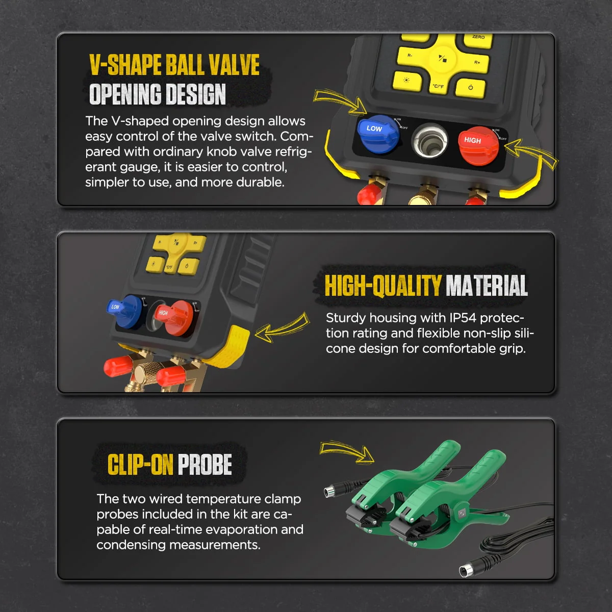 AUTOOL LM150 ball valve type intelligent electronic refrigerant meter, high and low pressure valve with V-shaped opening design, can accurately control the valve open or closed, with good flow regulation function, easy operation, accurate testing and longer service life. The meter features pressure testing, temperature testing, refrigerant charging, evacuation, holding pressure leak testing and a built-in database of 93 refrigerant NIST standards, it is the best helper for the repair and maintenance of air conditioners, refrigeration equipment and heat pumps.