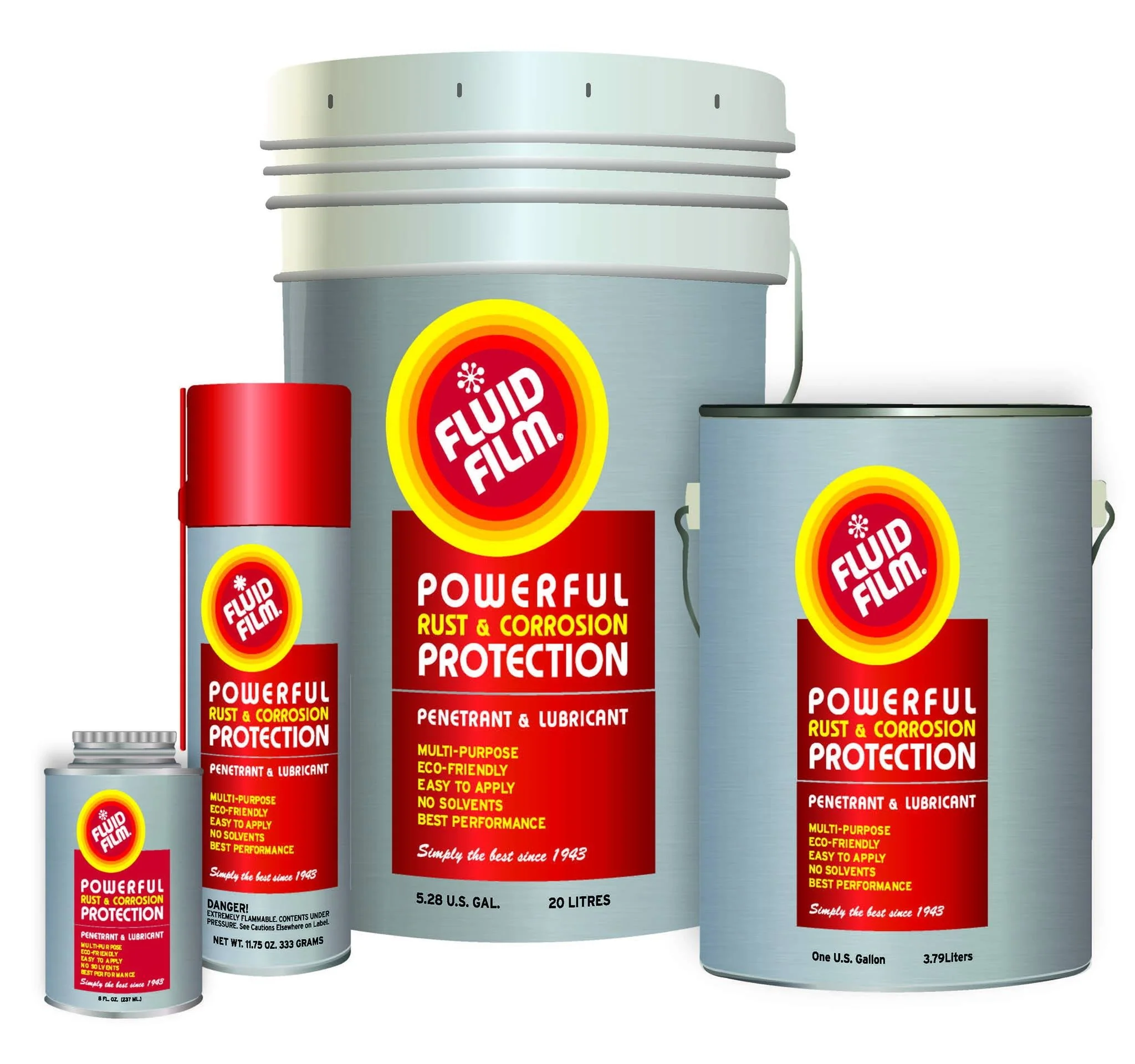 FLUID FILM is formulated from specially processed wool-wax, highly refined petroleum oils and selected agents to provide corrosion control, penetration, metal wetting and water displacement. The long lasting product contains no solvents, will not dry out and will penetrate to the base of all metals, providing corrosion protection from both natural and industrial atmospheres. Heavily corroded and/or frozen parts such as nuts, bolts, shafts, etc. that would normally be damaged during maintenance, can be salvaged by applying FLUID FILM.