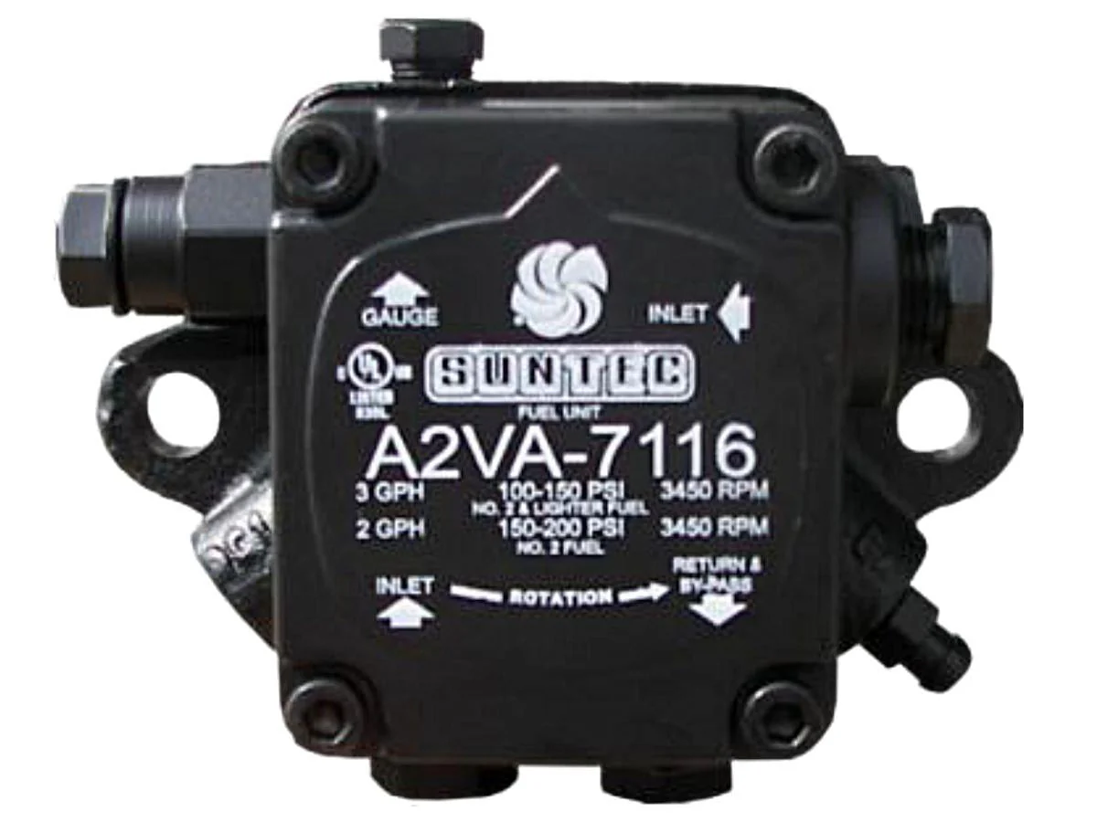 Suntec A2VA-7116 Single Stage Oil Pump 3 GPH @ 100 PSi (A Pump)Factory Set @ 100PSI Adjustable From 100 - 150 PSIRotation And Nozzle Prt As Viewed From The Shaft End RH-RHIncludes Bypass Plug (NOT INSTALLED)Specifications:A - Single Stage2- 3450 RPMV - 3 GPHA- R.H. Rotation - R.H. Nozzle71 - Hub 54 mm, Lip Seal16 - Mounting Style and Standard PumpsExact Replacement For Carrier 58HH680001, Grainger 2460GU, 2460U, Sid Harvey P4-91R & P4-91, Wayne Combustion 13495, Wayne 100714-001, 100714-SER, Suntec A2VA-7016, A2VA7016, Sunstrand A2VA-7016, A2VA7016, Rheem / Ruud 59-17936-30, 59179360340, 6093-5507, 59-17047-05, 8102-5504, A2VA7116, Danfoss 071N1151, Danfoss 071N1159