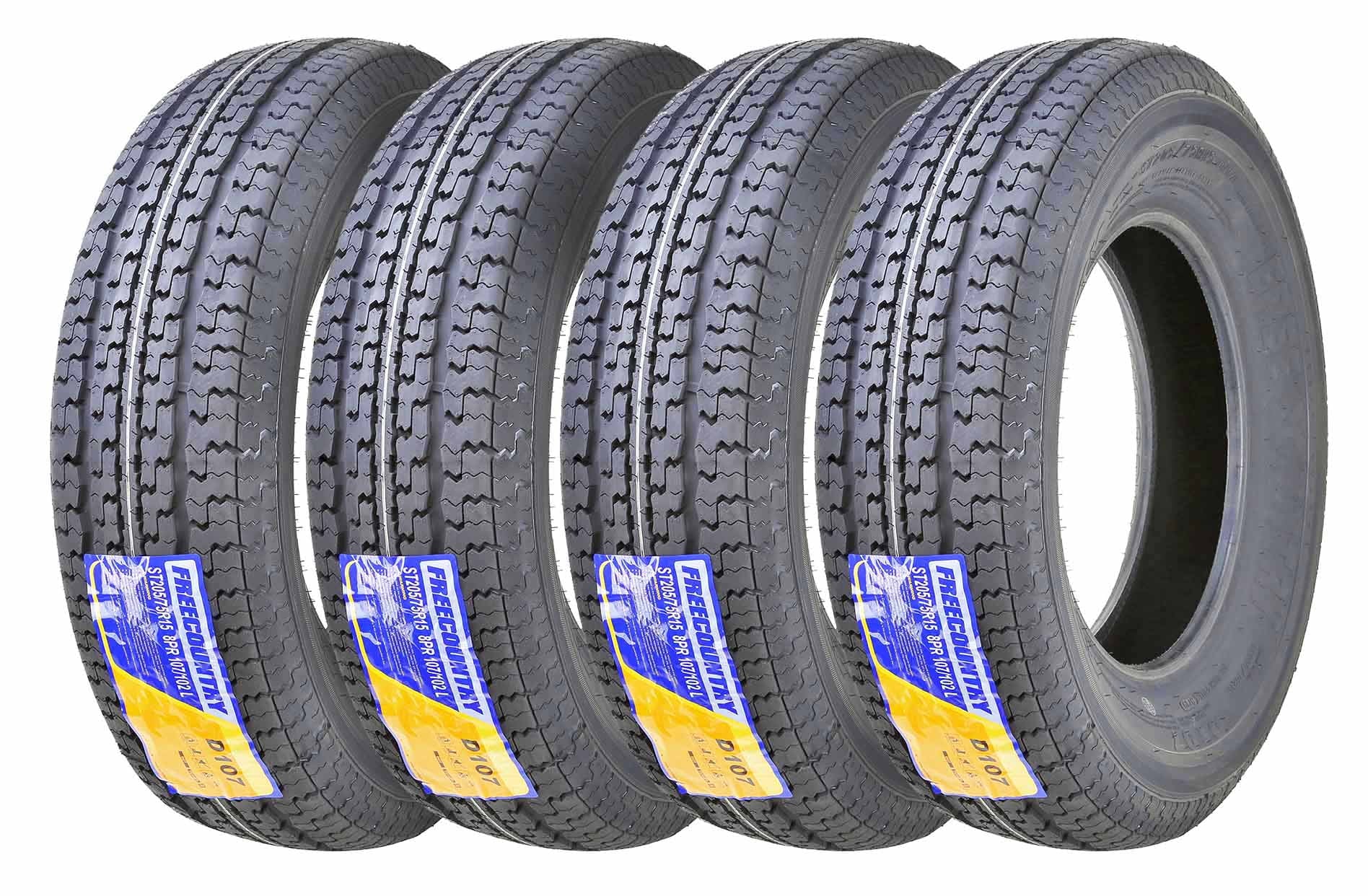 Set 4 of new premium FREE COUNTRY 8PR Load Range D radial trailer tires ST205/75R15 with "Scuff Guard" ring on tire wall is designed for better tire side and rim protection. The FULL nylon cap ply overlay crosses the entire tread area, a significant upgrade from most other products on the market have nylon strips on the shoulder area only, adding a critical safety feature!