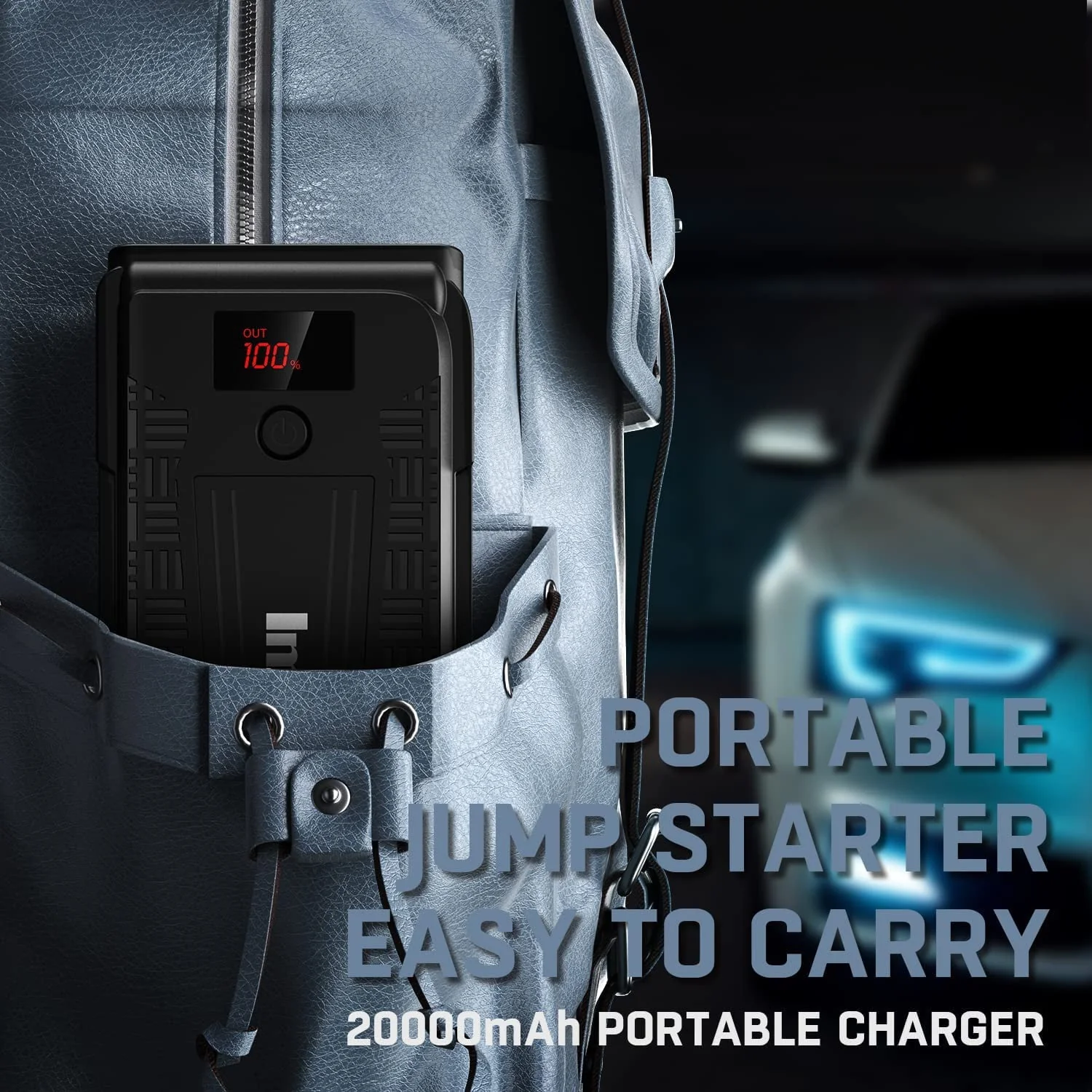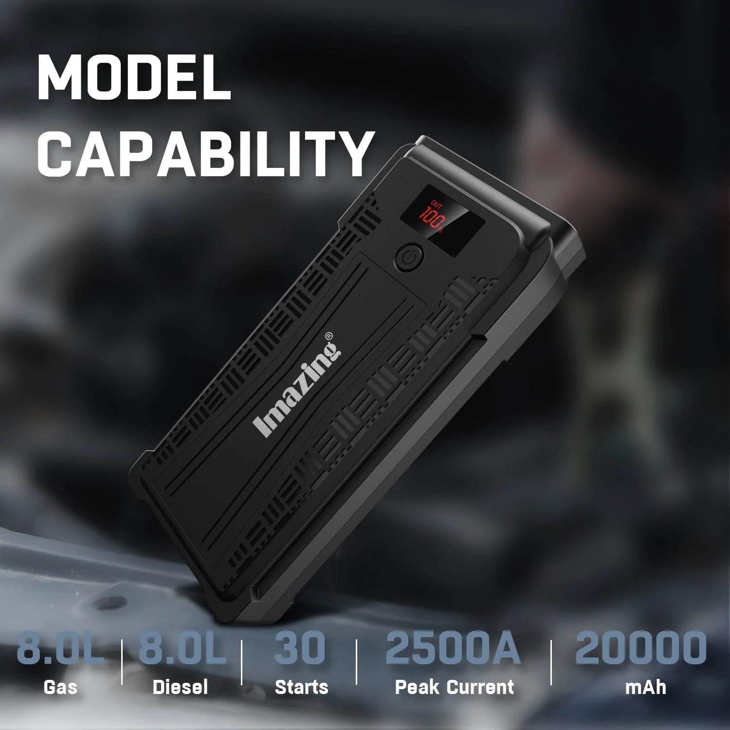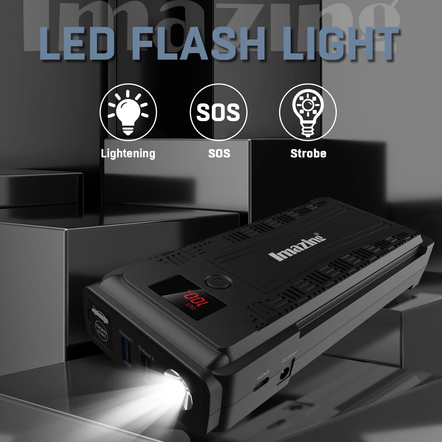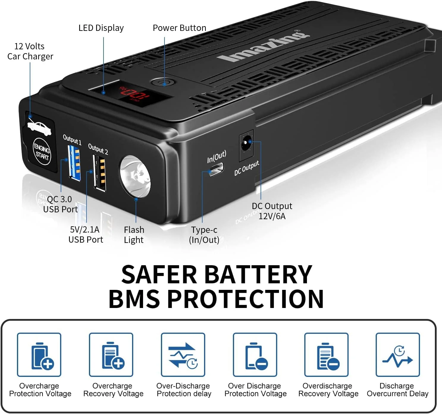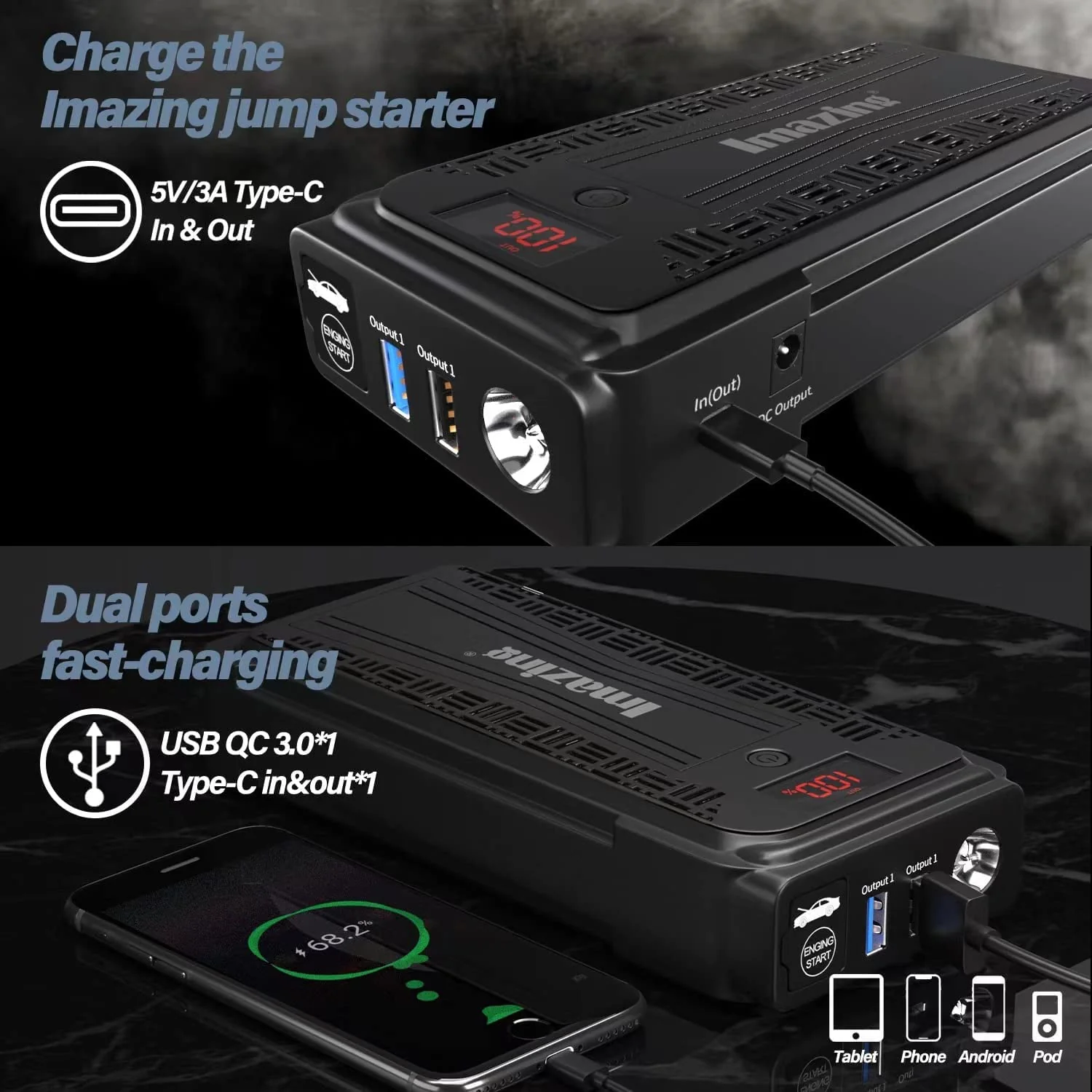 12V Auto Battery Booster Portable Power Pack with LCD Display, Smart Jumper Cables and LED Flashlight. Smart intelligent Clamp: Clear instructional guideline LCD display indicated 8 advanced safety technology features including reverse polarity protection, reverse connection protection, over-current protection, overload protection, over-voltage protection, over-charge protection, short circuit protection, over-discharge protection. Quick Charging USB Ports and Type C Port and DC Output: USB Output 1 (5V/3A,9V/2A,12V/1.5A), Output 2 (5V/2.1A), Type C In(Out)(5V/3A), DC Output (12V/6A). The quick charge 3.0 USB port compatible with almost all QC 3.0 USB charging specifications of products and equipment provide 3 times faster charging speed. A Powerful Power Station: This is not just a portable jump starter but a jump starter power pack. You can learn more about how to use the product from the operation video below the product images or check the "Videos for this product" on this product page. What You Get: 1 x Jump starter, 1 x Carry case, 1 x LCD smart Clamp, 1 x Type C cable/Charging the Imazing jump starter(Type C cable color may change without notice), 1 x Cigarette Lighter Adapter, 1 x User Manual