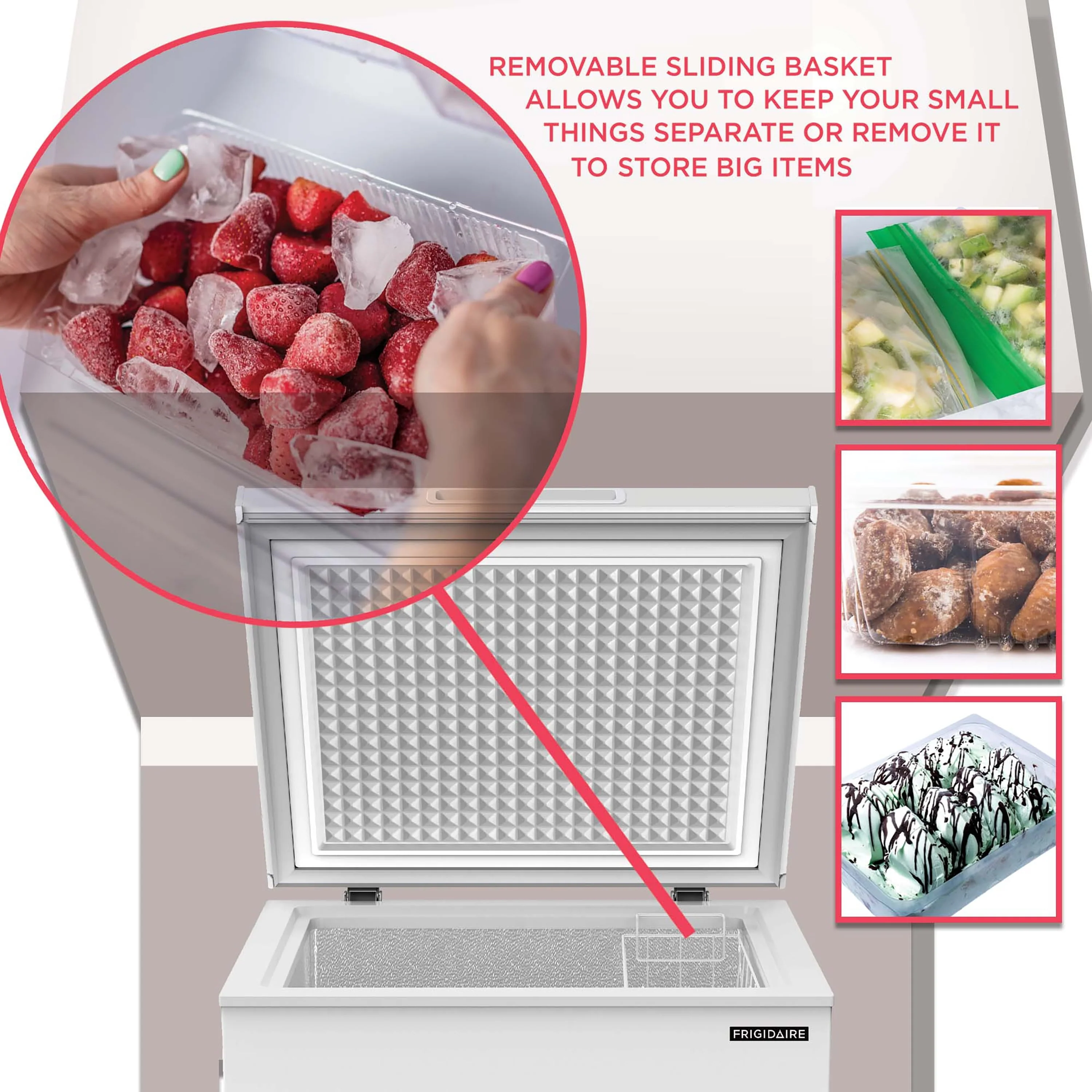 Chest freezers from Frigidaire offer the best in quality and performance. You’ll have plenty of room to stock up on popsicles for a sunny summer day with this spacious 7.0 cu. ft. Frigidaire chest freezer. Say goodbye to digging around for smaller items forgotten at the bottom – a removable basket keeps loose snacks within quick reach. Plus, the external temperature controls and manual defrost provide a more consistent cooling temperature to keep food fresher for longer. Comes in white.