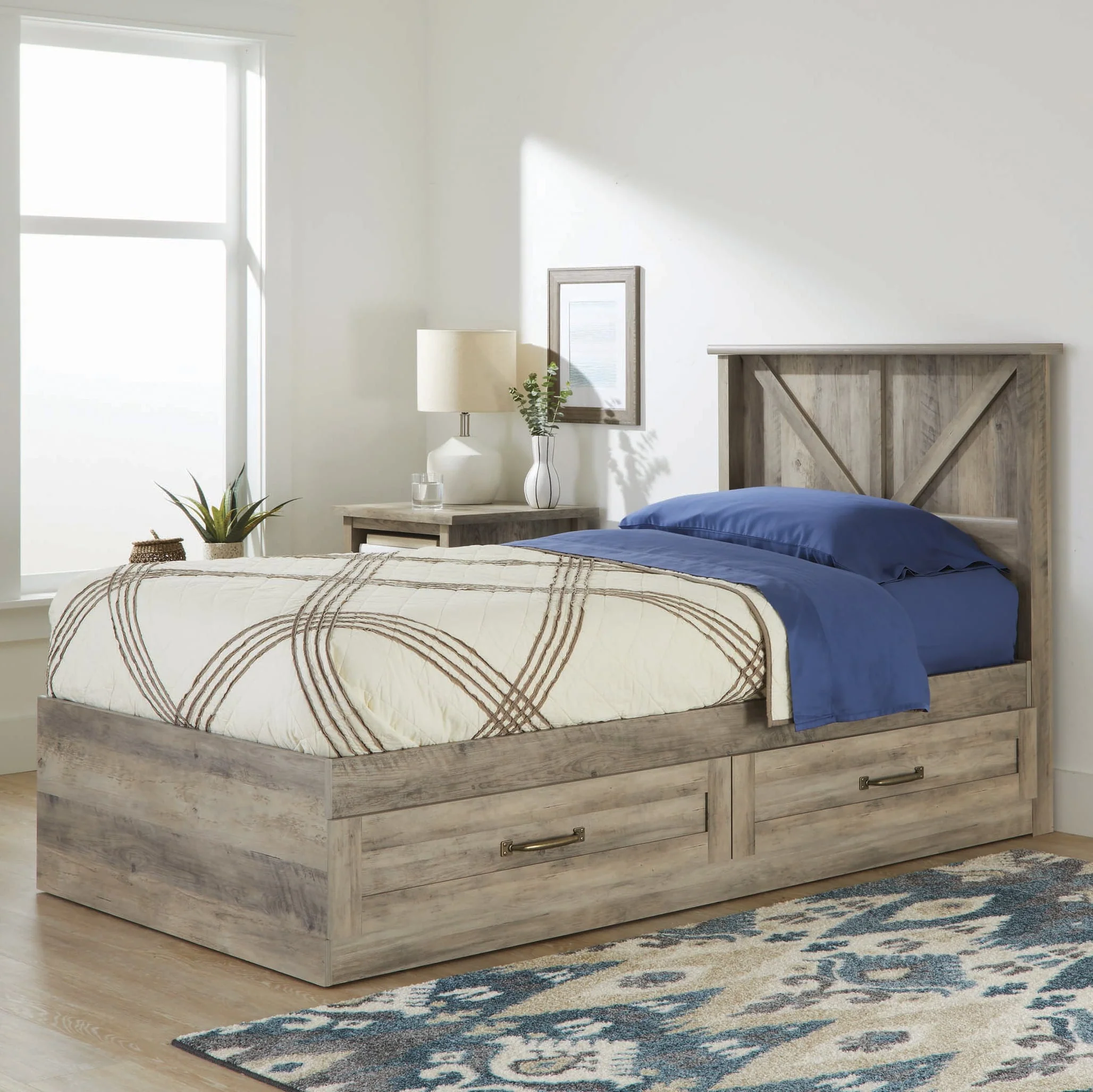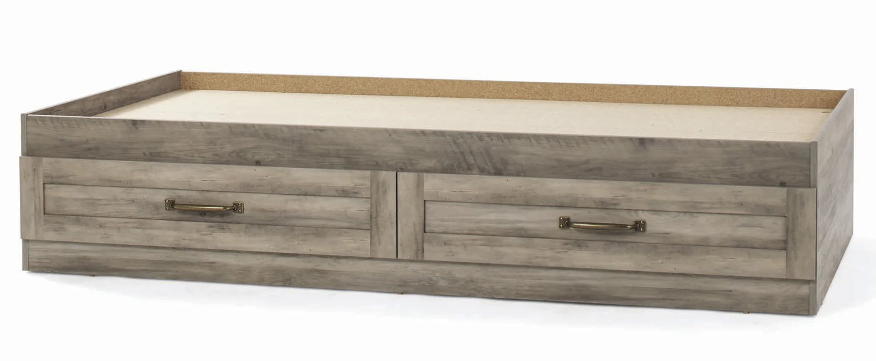 Is your sleepy bedroom decor in need of a wake-up call? We've got you covered. Give your bedroom a fresh, new look and begin to snooze in style with this mates bed from the Better Homes & Gardens Modern Farmhouse collection. Its convenient under the bed storage includes two large storage drawers that open and close on smooth metal runners. Both drawers feature a removable divider for versatile storage options of an array of different items. Enjoy an easy access space to stow away anything from stacks of sweatshirts and shoes to board games and an extra set of sheets and blankets. You can find room for all your stuff! It accommodates a twin-sized mattress to give you a completed look, whether it is in your master suite or down the hallway in the guest room. It adds cozy style and simplistic beauty no matter where it rests. Its detailed with framed panel doors and stylish hardware to give it its charming good looks. Finished in Rustic Gray, this mates bed is everything your bedroom needs.