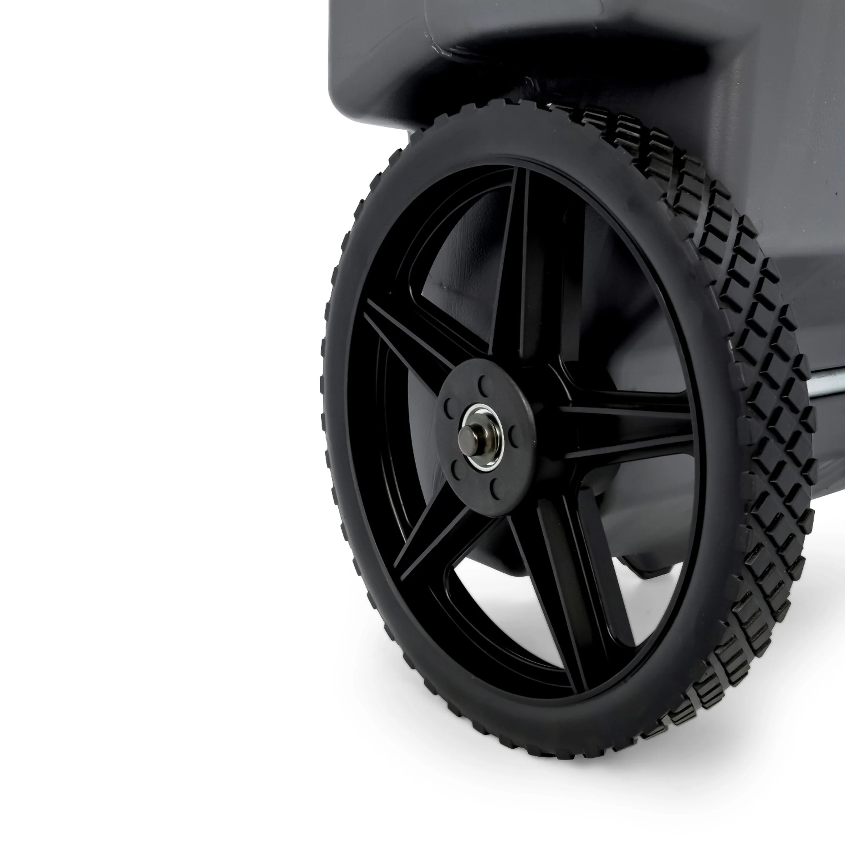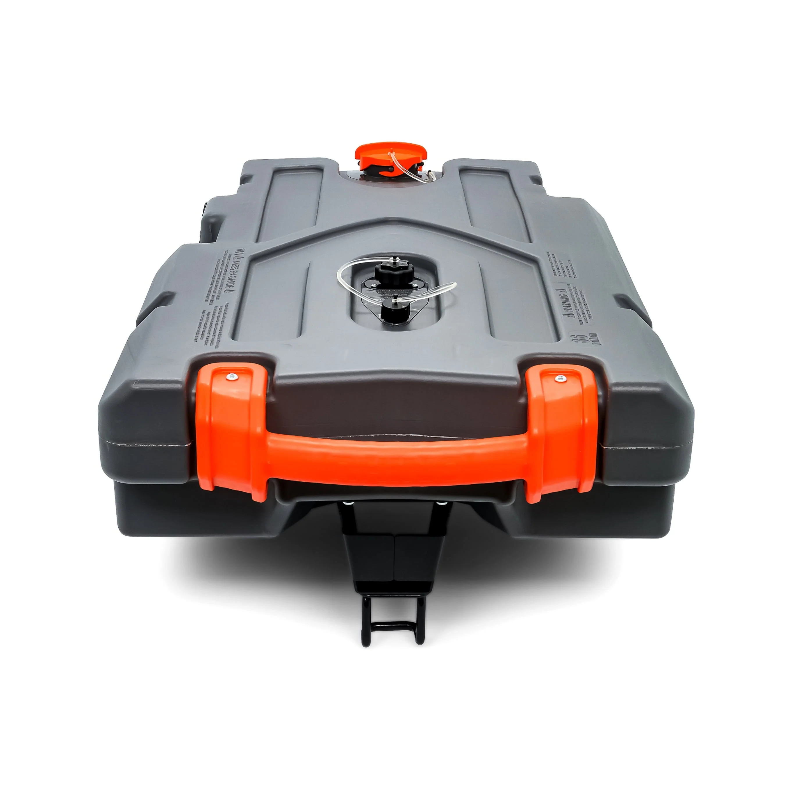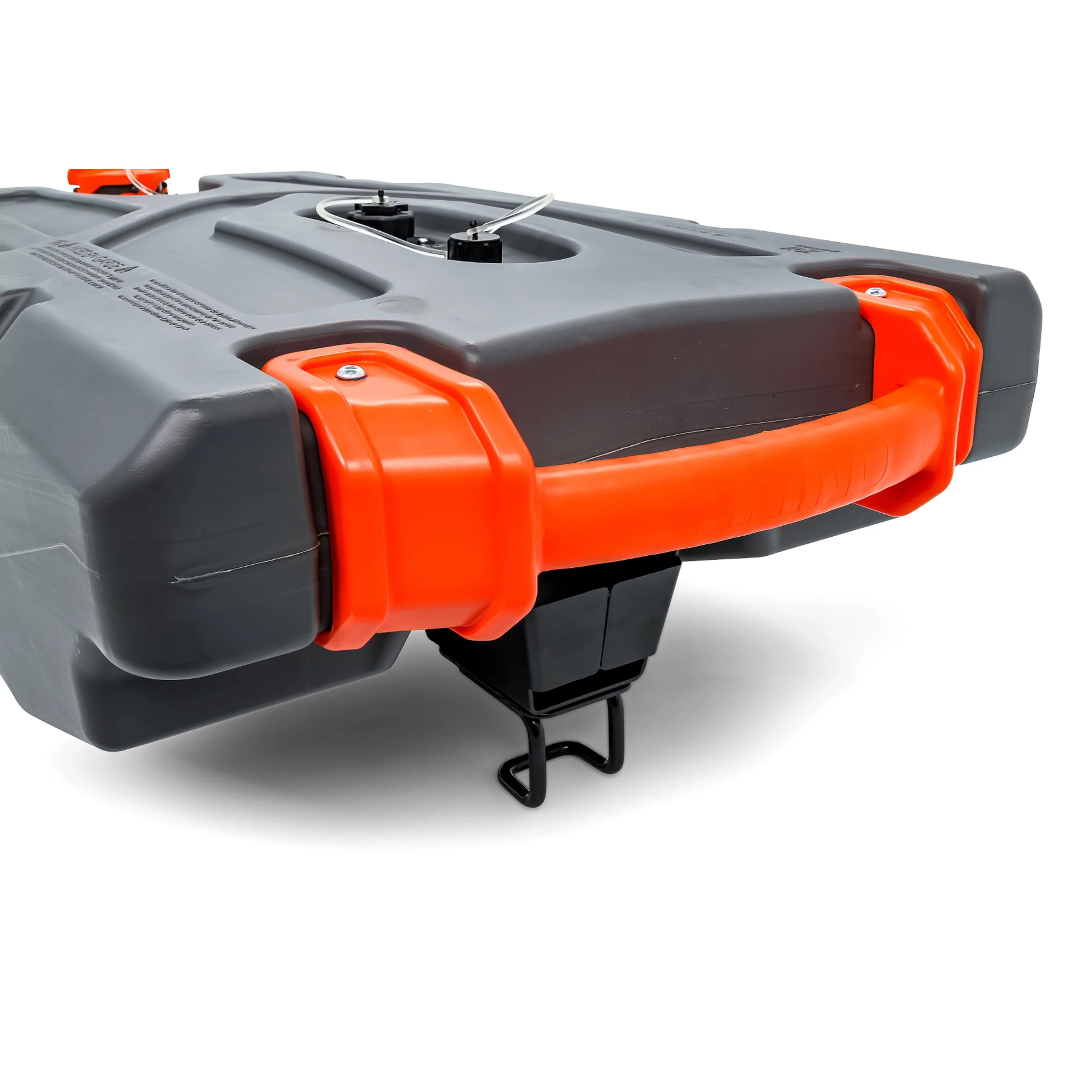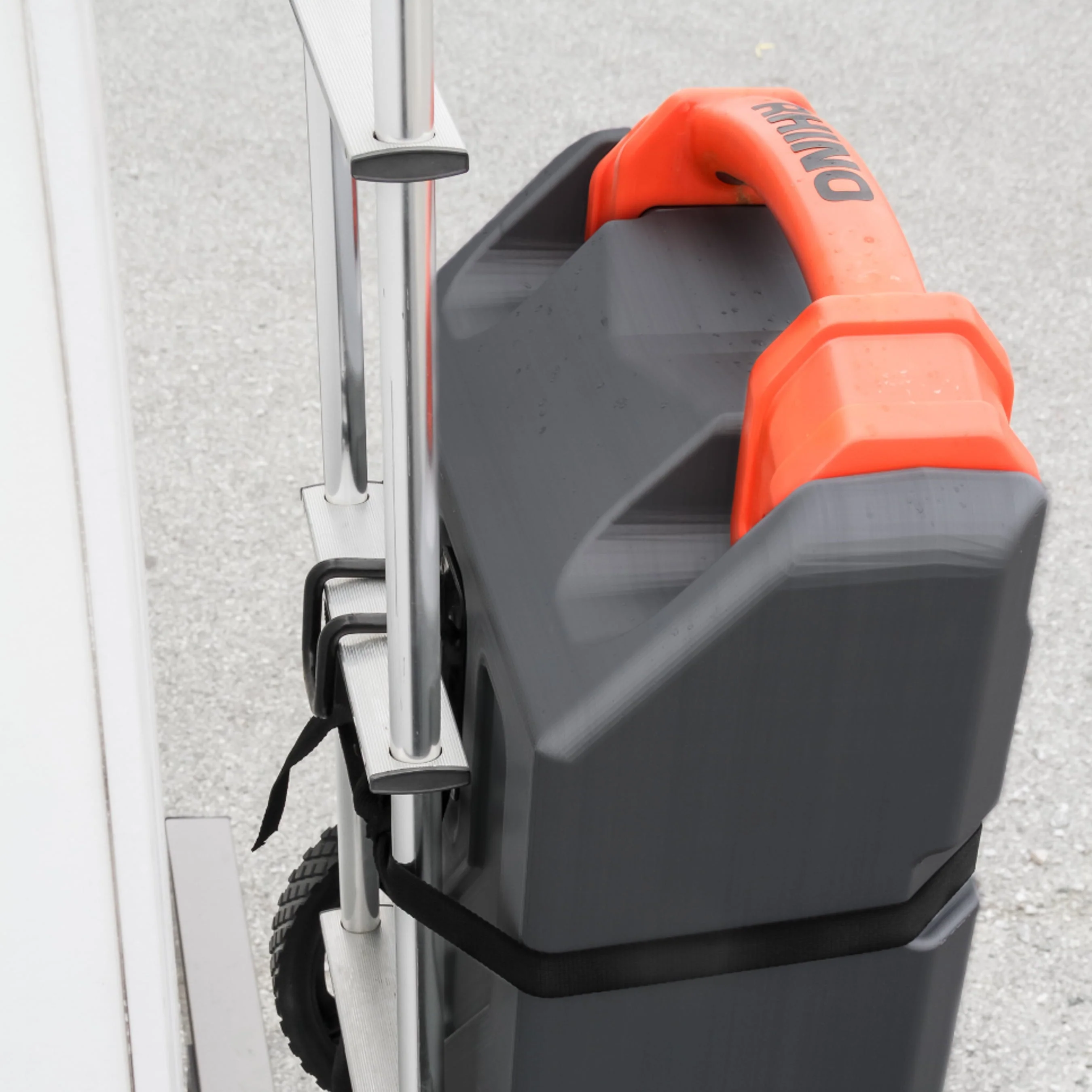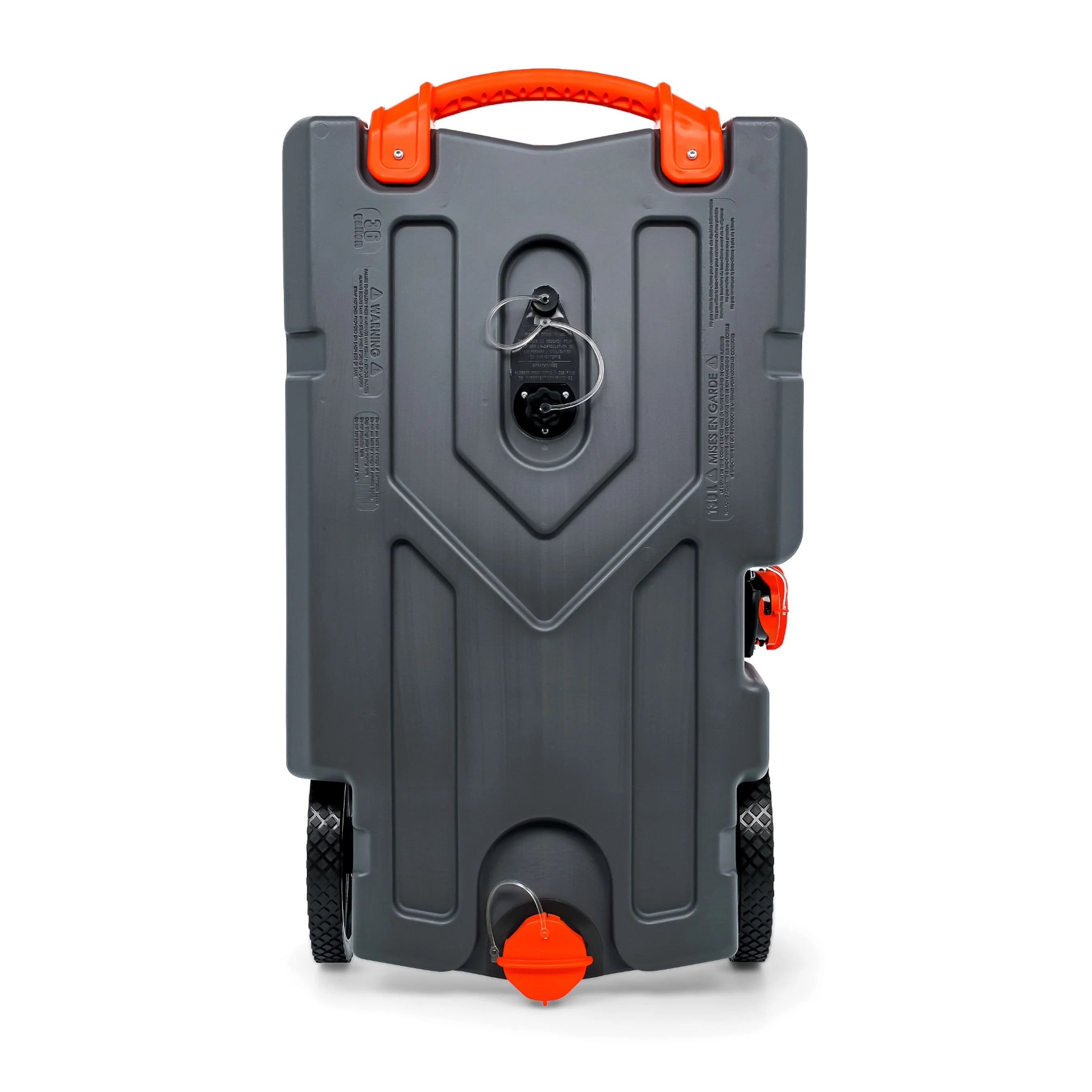 Camco's 36 Gallon Rhino Portable Tote Tank allows you to transport waste from your RV or trailer to a dump station. It's ideal for when you're parked too far away for an RV sewer hose. A built-in gate valve provides effortless emptying and the smooth interior is easy to wash off using the integrated tank rinser. The tote tank features large, heavy-duty, no flat wheels with bearings to make transport smooth and effortless. A removable steel tow adapter allows you to easily roll the tote tank like a suitcase, or tow it slowly behind a truck or golf cart. When not in use, an integrated ladder hook can securely clamp onto RV or camper ladder; the body of the tote tank features grooves to securely strap it in place. Product includes: (1) 36 gallon tote tank, (1) large, durable handle, (2) oversized wheels, (1) tank rinser, (1) ladder hook, (1) gate valve, (1) 3-foot, super heavy-duty sewer hose with swivel bayonet and lug fittings, (1) 15-inch female to female orange Rhino grey water hose, (1) clear elbow with a 4-in-1 adapter, (1) clear double bayonet elbow, (3) storage caps, (2) caps with lanyards for rinse connections and (1) steel tow adapter. The tote tank is constructed of extremely durable blow-molded, UV stabilized HDPE that won't leak or deteriorate in the sun. It measures 15 ½-inches (L) x 25-inches (W) x 46-inches (H) and has a 13-inch minimum waste height hook up. Weight: 46 lb. Patented. Color: Multicolor; Model#: 39006