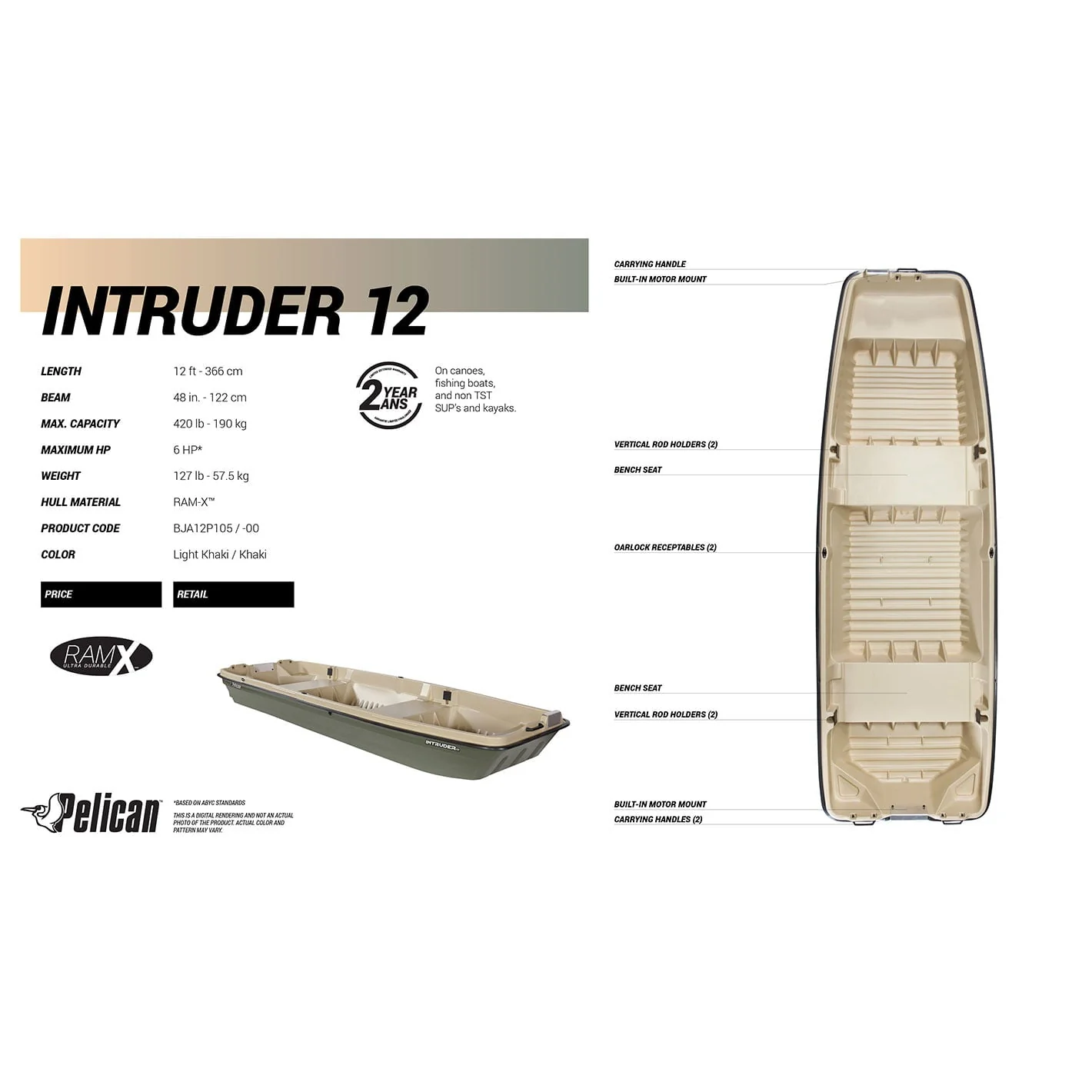 The Pelican International intruder 12 is a very stable “JON” style fishing boat. Its maintenance-free grooved and riveted deck offers great impact resistance and can contain up to 36 cubic feet of cargo. It features bench seats, 4 vertical rod holders, built-in motor mounts, oarlock receptacles, and carrying handles. Made of RAM-X™ impact-resistant material, the intruder 12 is built to last for many adventures. So create fishing stories worth sharing with everyone.