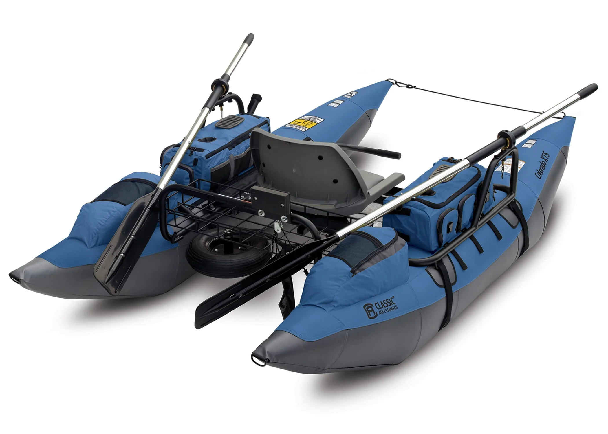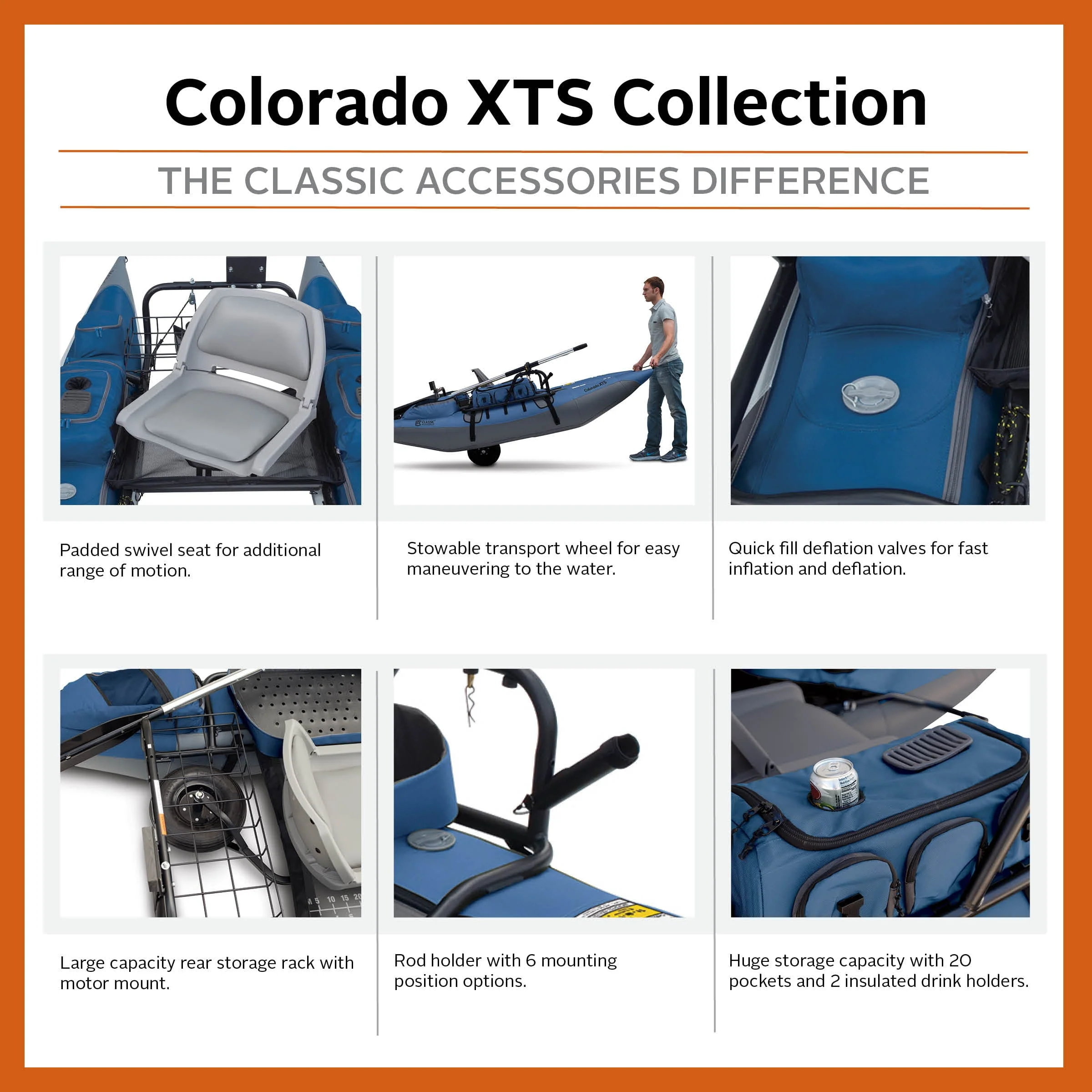 The Colorado XTS Pontoon Boat by Classic Accessories provides a 9-foot high-capacity pontoon boat with swivel padded seat, transport wheel, removable stripping basket and gear bags.