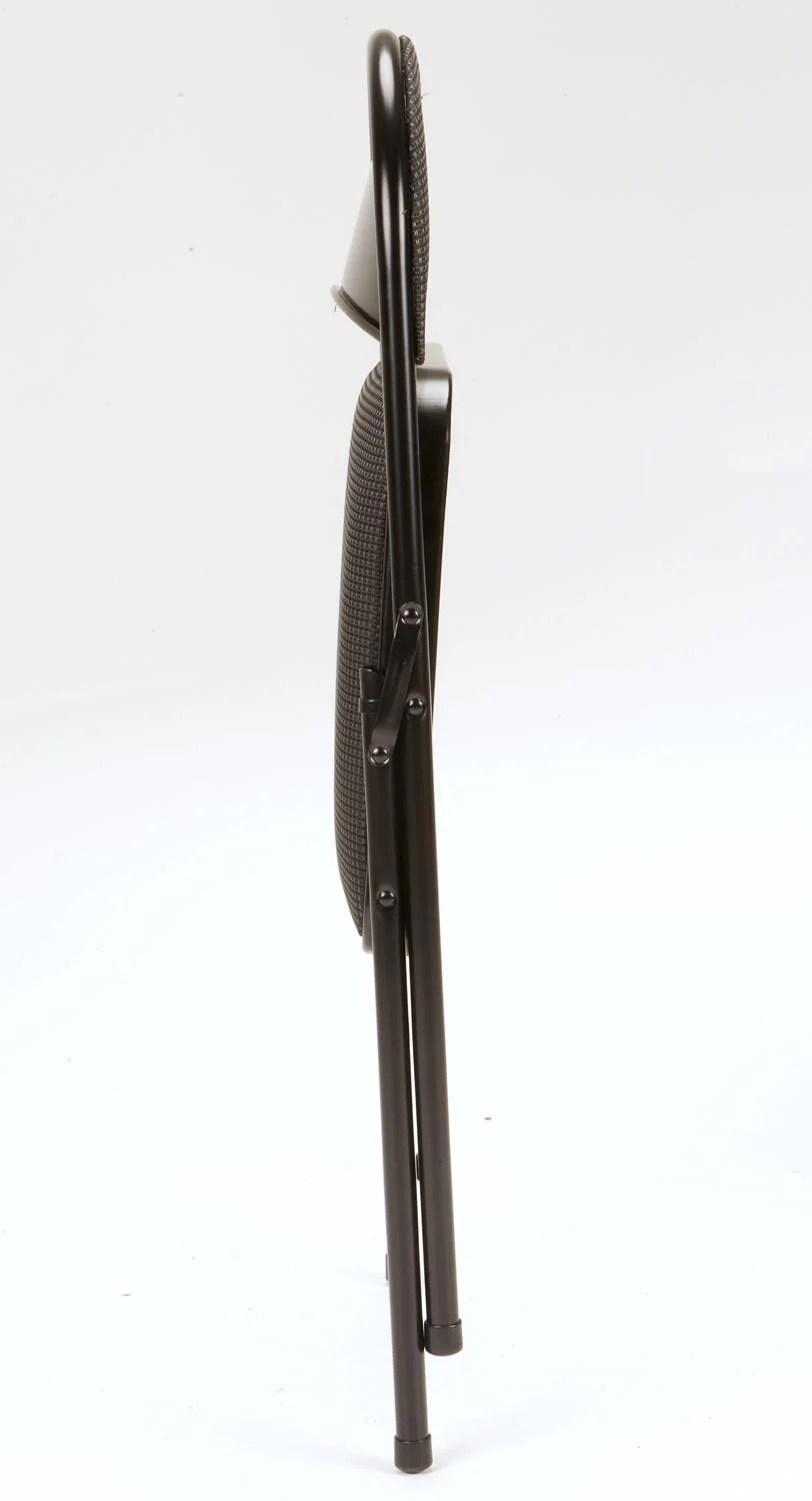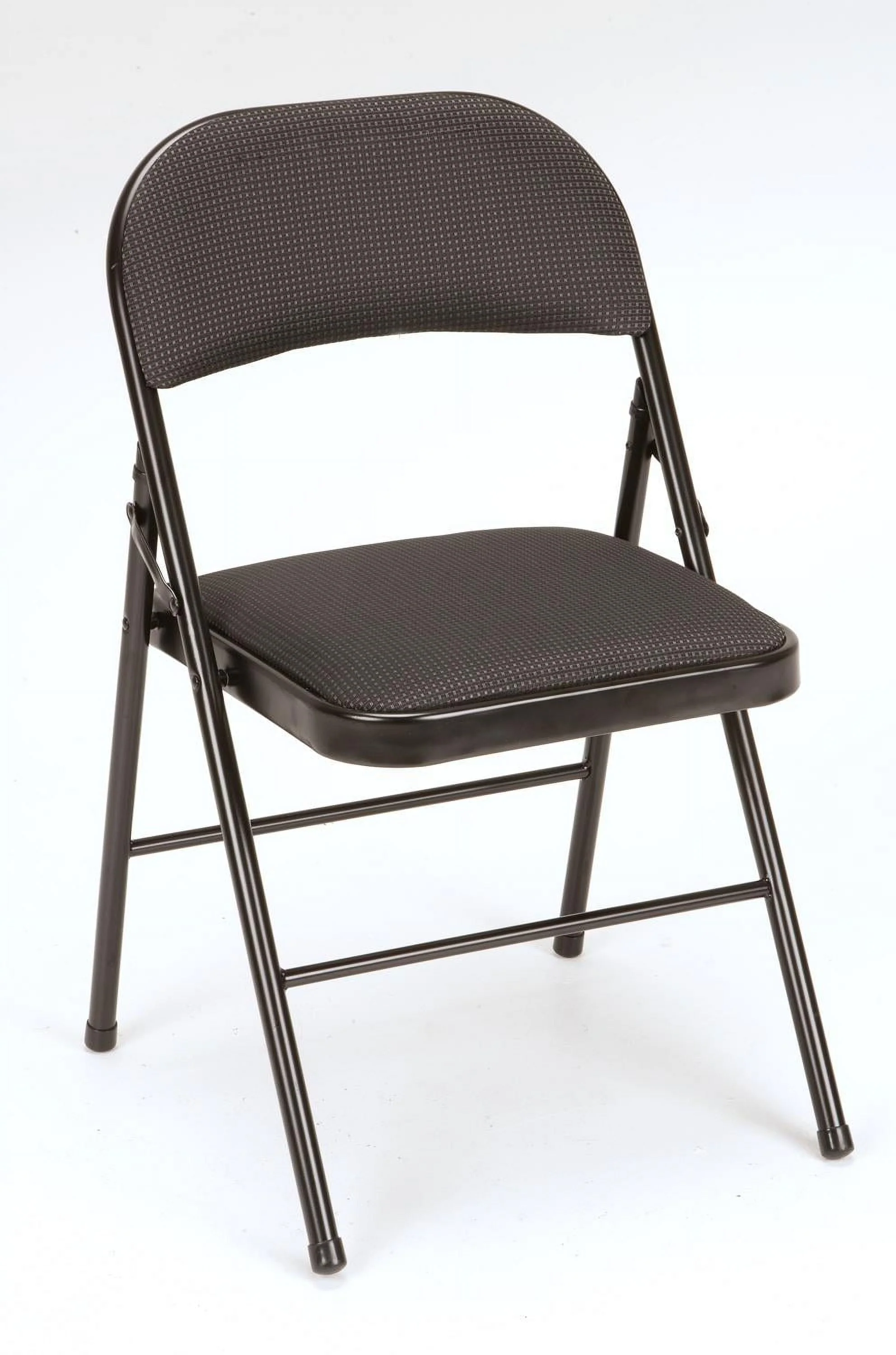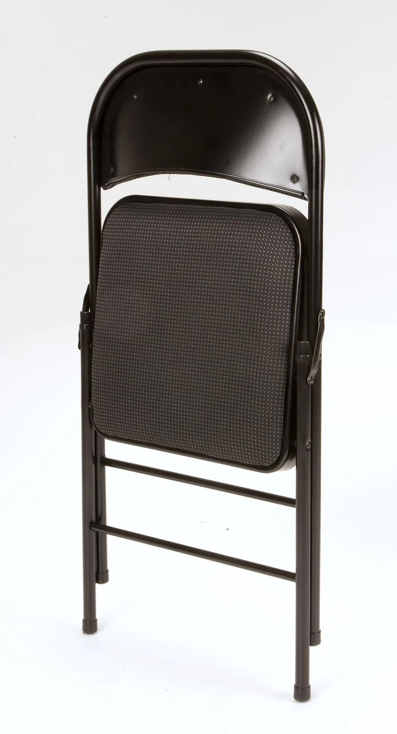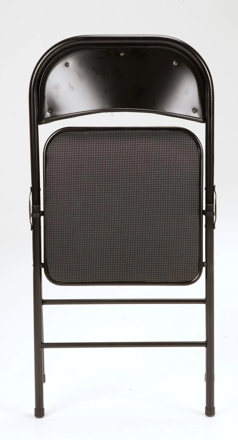 Enhance your next birthday party, holiday gathering, or daily routine with the Mainstays Fabric padded seat and back folding chair! The black color of this product allows you to have a simple, elegant addition to your living space without clashing with your existing color palette or furniture layout while providing extra seating for special occasions or daily use. Constructed out of a fabric seat and steel frame combination, this chair to be a long-term purchase you can use with peace of mind and no regrets! The fabric material provides you with a multipurpose option of comfort for your guests under all circumstances. The powder-coated finish makes our chair heavy-duty while retaining its stylish simplicity. Featured with this are non-marring leg tips intended to prevent slipping when in use and protect your floor's surface from any possible damage. When not in use, the fold hinges built into the chair allow this product to fold flat for easy, non-invasive storage so it’s out of sight, out of mind. Pair the Mainstays Fabric Folding Chair with our folding tables and make your next gathering an entertainer's dream.