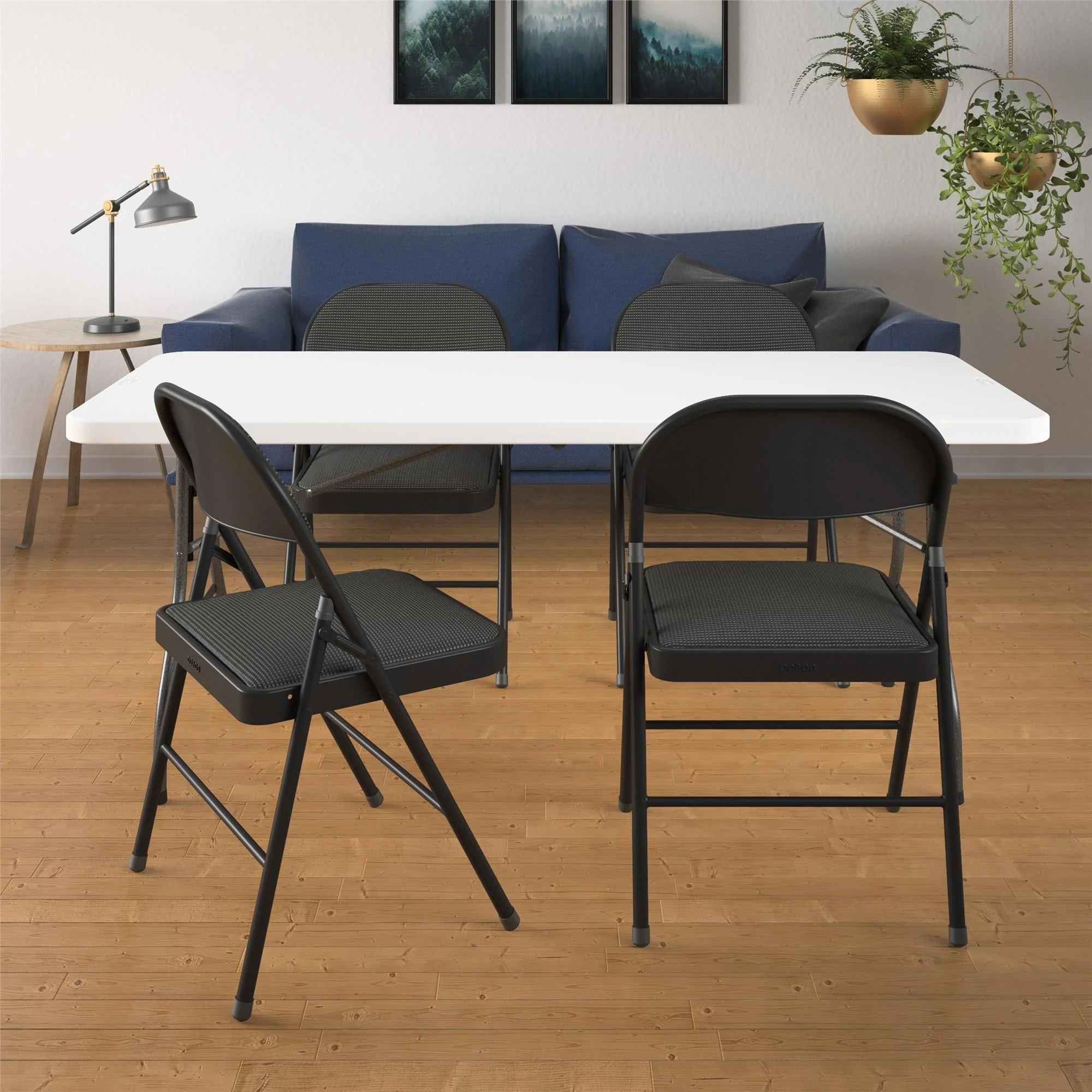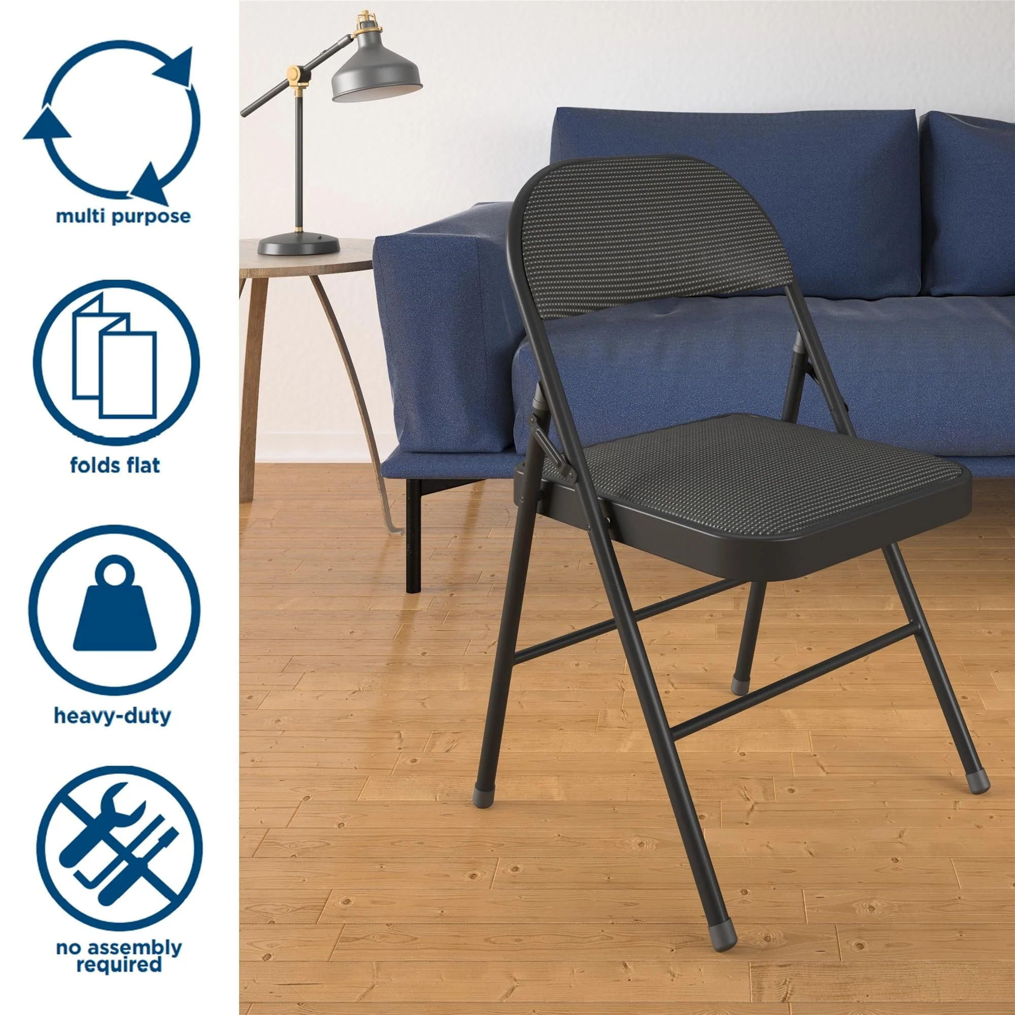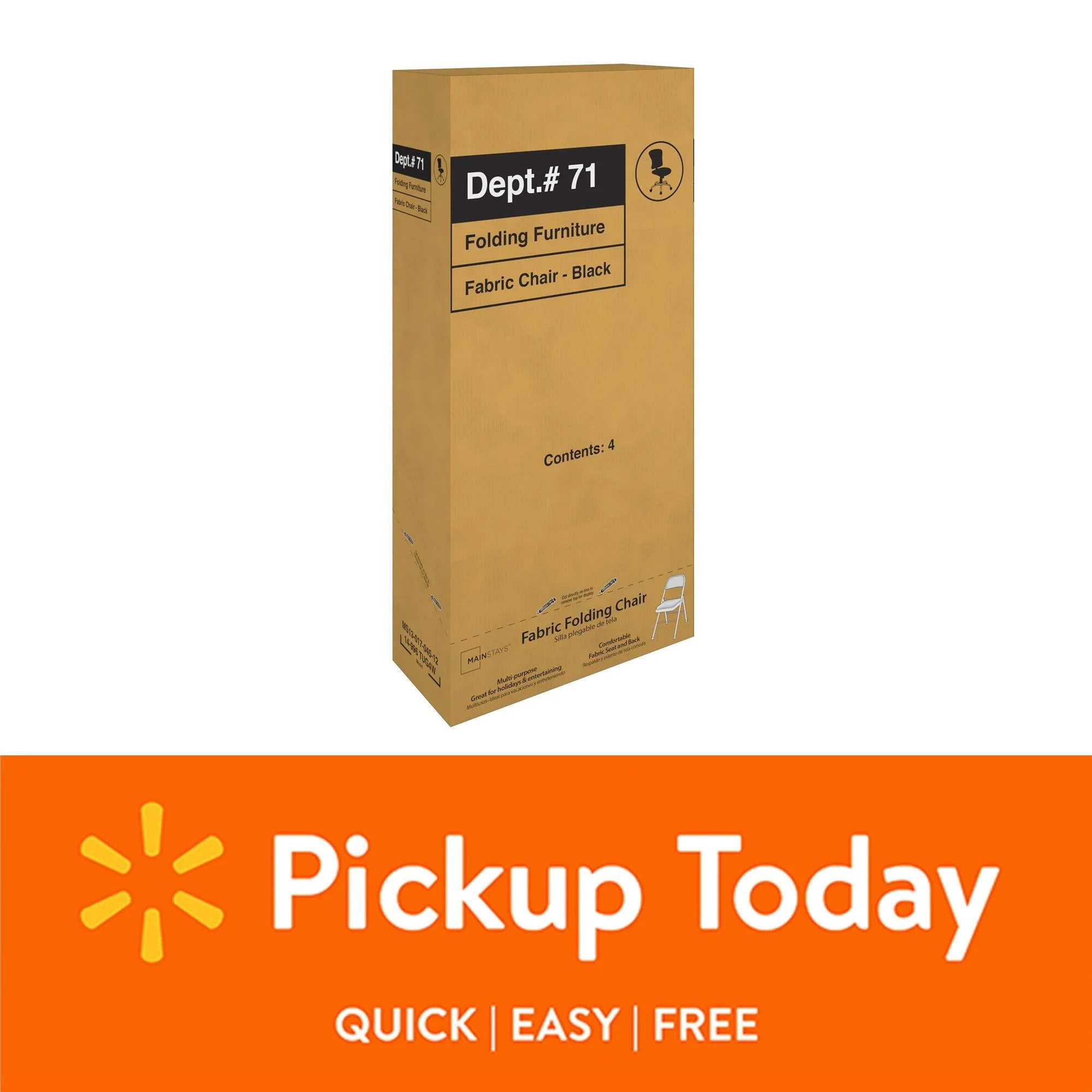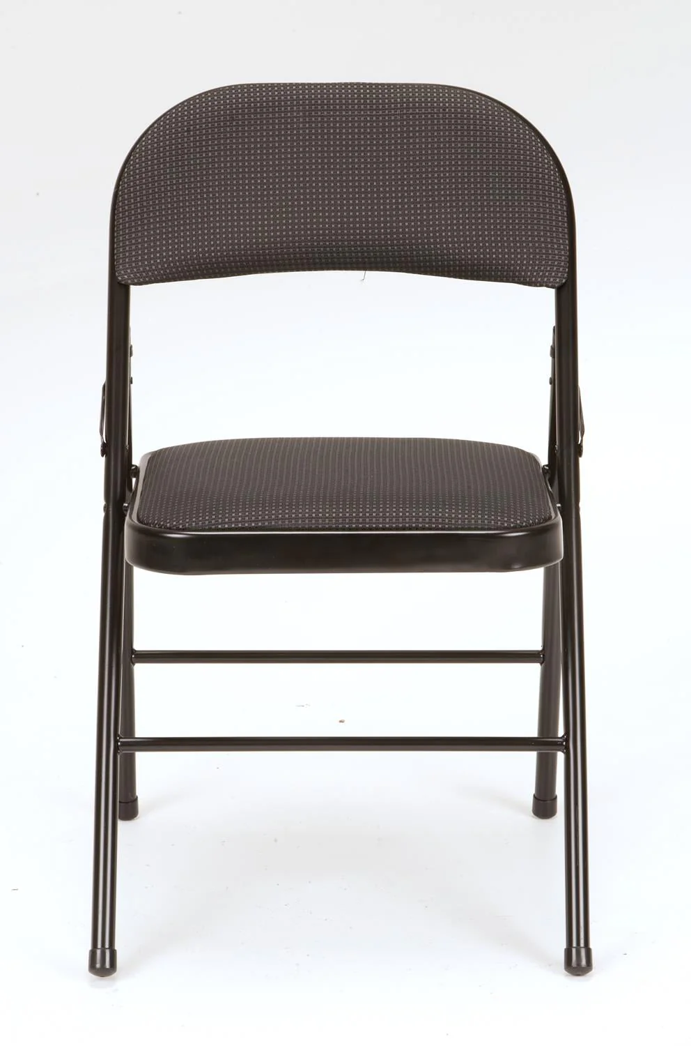 Enhance your next birthday party, holiday gathering, or daily routine with the Mainstays Fabric padded seat and back folding chair! The black color of this product allows you to have a simple, elegant addition to your living space without clashing with your existing color palette or furniture layout while providing extra seating for special occasions or daily use. Constructed out of a fabric seat and steel frame combination, this chair to be a long-term purchase you can use with peace of mind and no regrets! The fabric material provides you with a multipurpose option of comfort for your guests under all circumstances. The powder-coated finish makes our chair heavy-duty while retaining its stylish simplicity. Featured with this are non-marring leg tips intended to prevent slipping when in use and protect your floor's surface from any possible damage. When not in use, the fold hinges built into the chair allow this product to fold flat for easy, non-invasive storage so it’s out of sight, out of mind. Pair the Mainstays Fabric Folding Chair with our folding tables and make your next gathering an entertainer's dream.