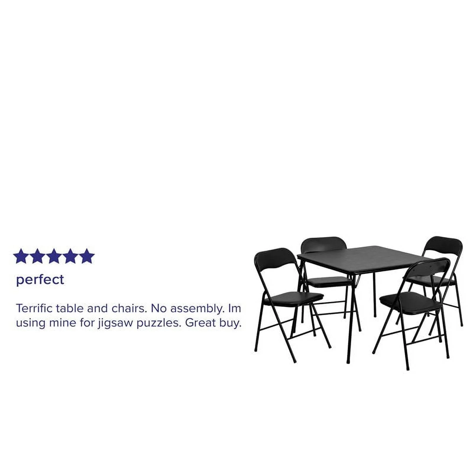 Host all those upcoming events with ease when you have this 5 Piece Black Folding Card Table and Chair Set. This set is a convenient solution for times when you have more guests than table settings. This folding card table is the perfect size for card and board games to get the family involved or to host game night. The 5 piece set includes 4 metal padded folding chairs and a square folding table. The table top is padded to help slow down thrown cards from sliding off the table. Powder coating protects the legs from scratches while plastic floor glides protect your floor by sliding smoothly.This classic set comes in handy when you need additional table settings for family get-togethers or for poker night in the man cave. It can be used indoors or outside and is lightweight and easy to fold up, transport and store.