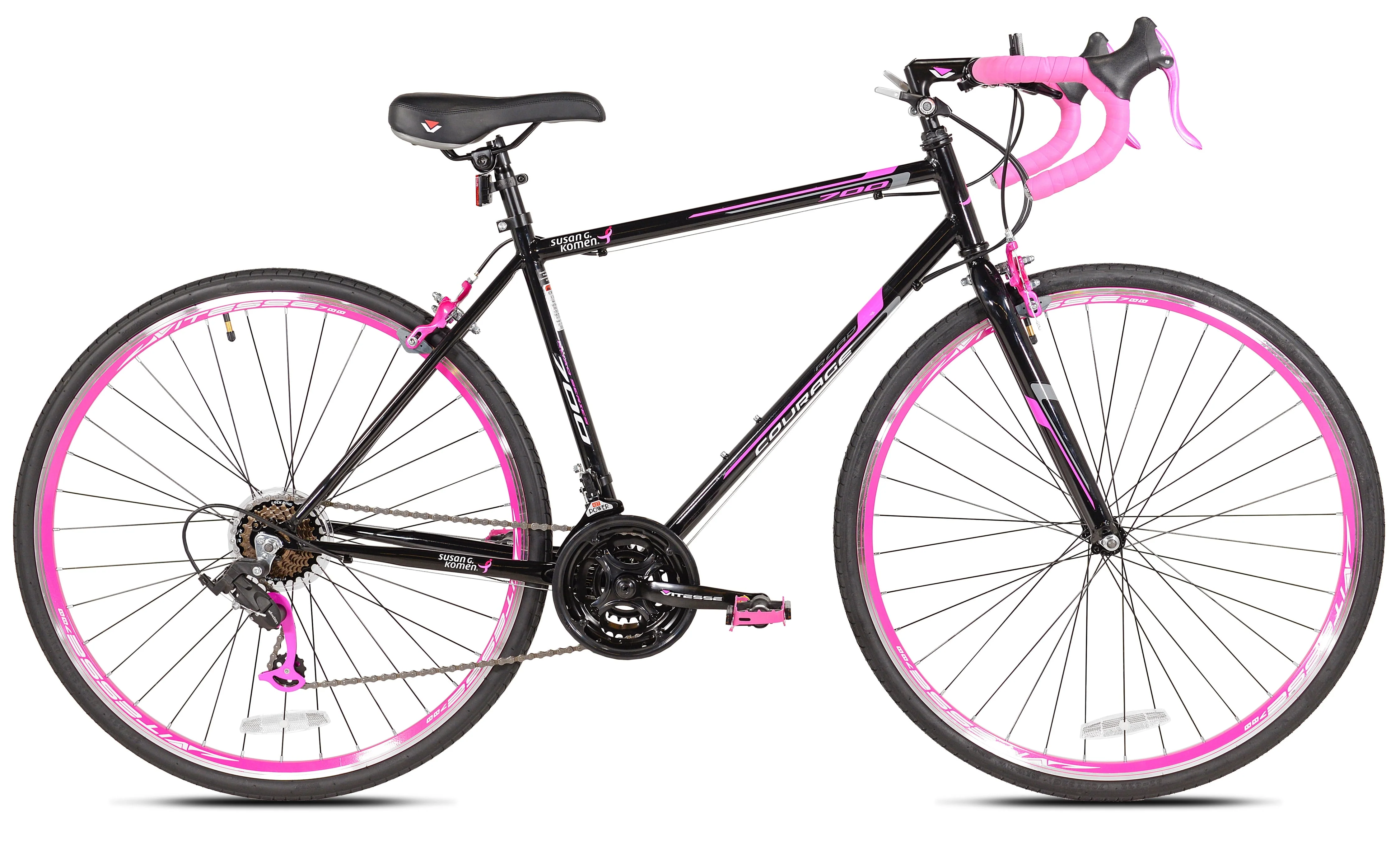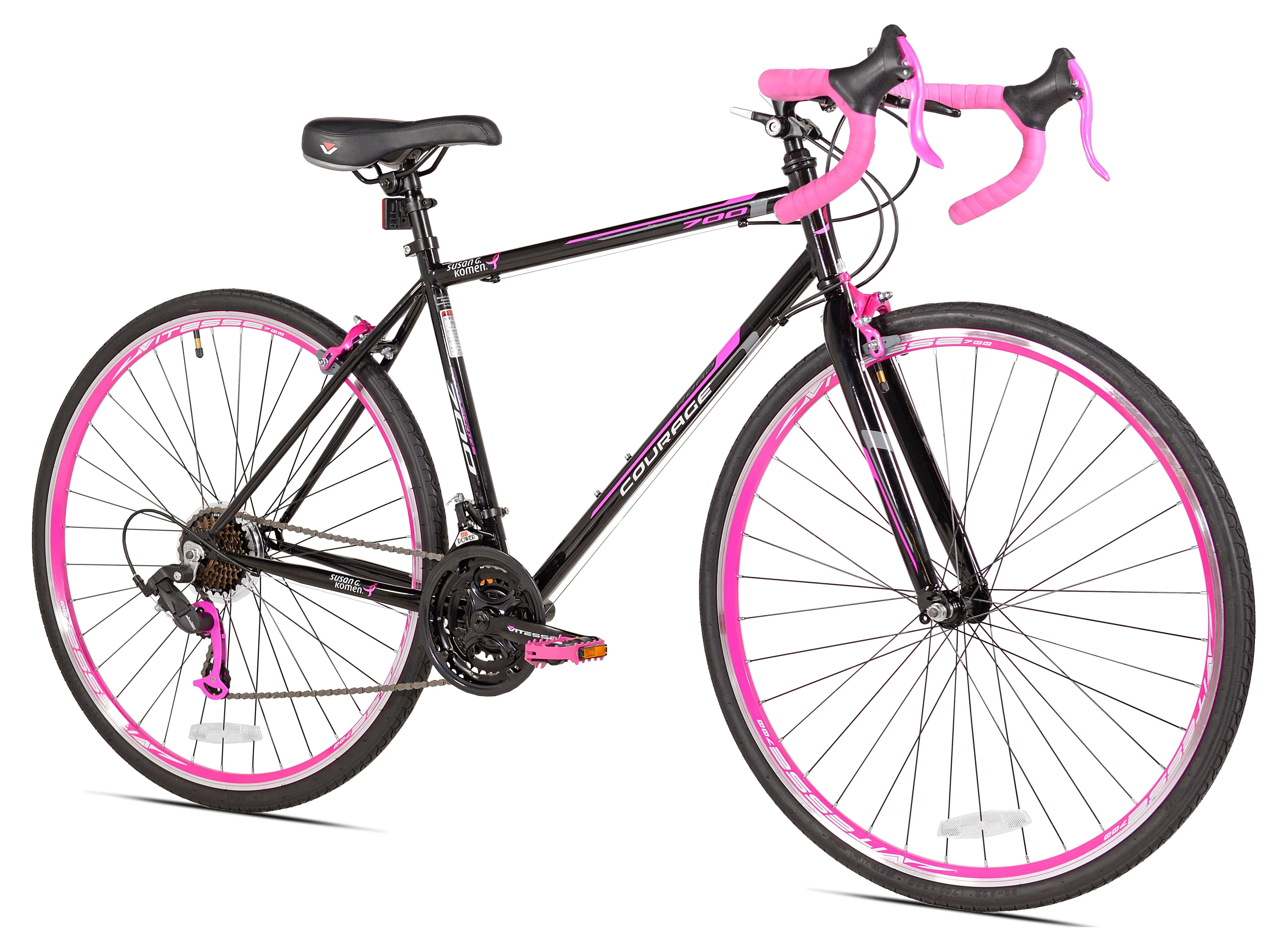 The Susan G Komen hybrid bicycle is the perfect blend of road bike and comfort bike. It begins with a sturdy steel frame. When you're riding to the store, out for a training ride or just making a coffee run you can count on a reliable 21-speed drivetrain with a rear derailleur from industry leader Shimano to tame the hills and get you moving. If you get moving too much, you can rely on front and rear alloy linear pull hand brakes to keep your speed in check. Ideal for adult females.