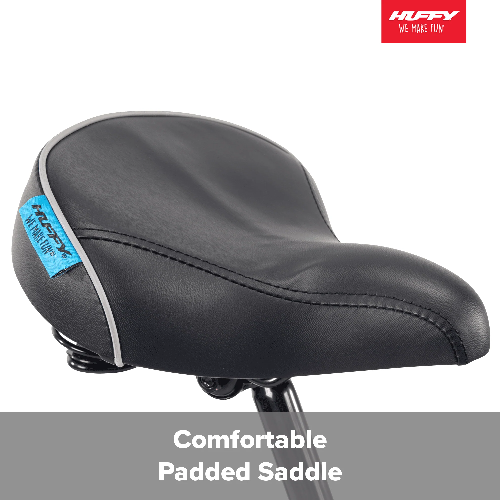 The comfortably padded spring saddle is slightly reclined with a lower center of gravity for better balance. A raised handlebar enables you to ride in a more upright position that's more natural for your back, neck, and legs. Your legs can fully extend forward while you pedal, and that helps to eliminate fatigue. Plus, while you're seated at a stop, both feet can rest on the ground. That flat-footed stance increases confidence as it provides better balance and control. Huffy's Perfect Fit frame delivers real comfort that goes along with this 26" cruiser bike's style!