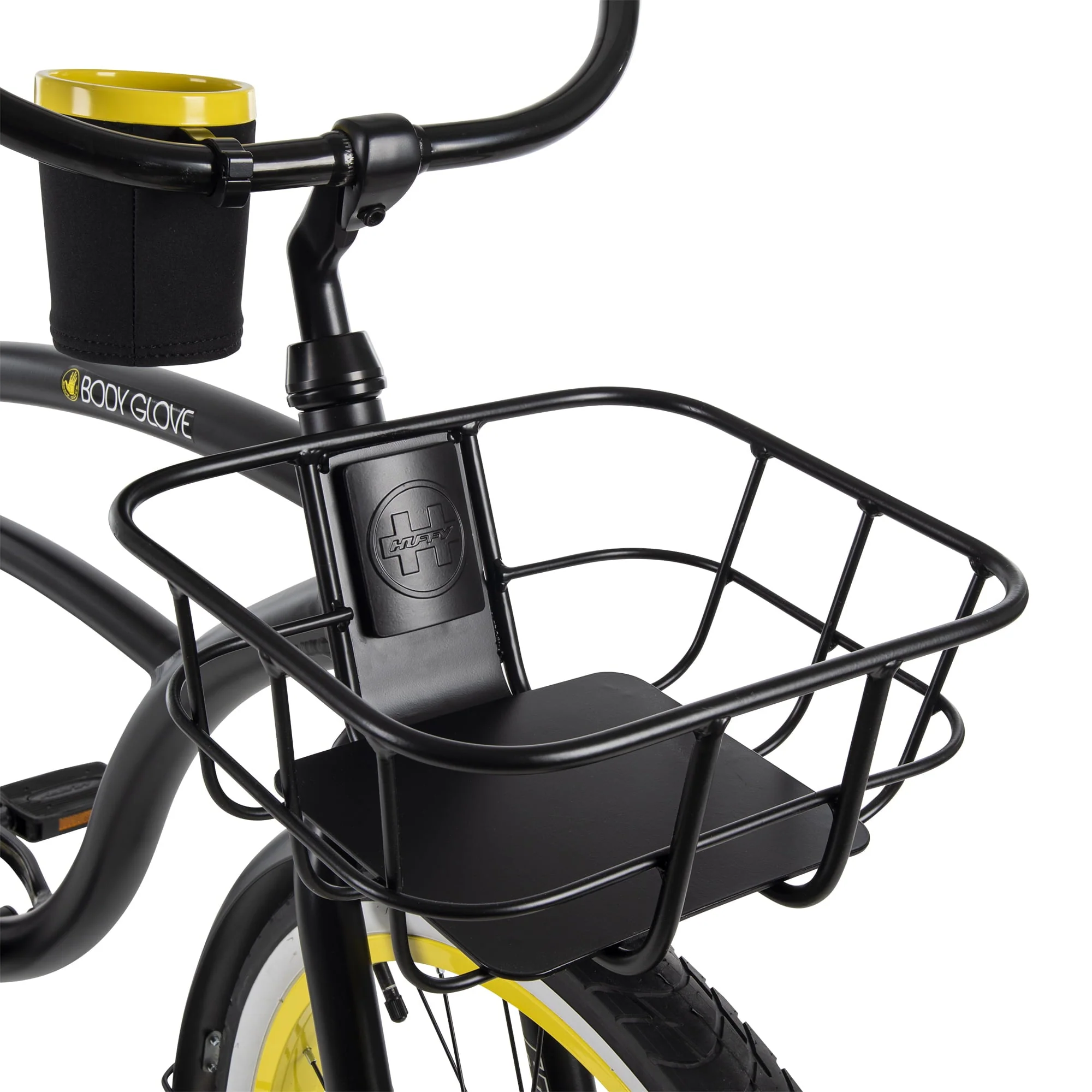Every ride ahead will be relaxing and comfortable thanks to this men’s aluminum cruiser bike featuring sleek Body Glove style details to give it a beachy feel. This matte black bike with yellow accents is a great choice for men who are looking for a leisurely way to get some more exercise and spend time outside. The single-speed bike with coaster brake comes equipped with great features to ensure you can bring whatever you need for the ride ahead. The front handlebars feature neoprene grips, a beverage holder, and a frame-integrated front basket. On the back of the bike, the integrated rear rack has a unique feature of a surfboard-shaped topper to add to this bicycle’s beachy feel. To keep you comfortable as you ride, the padded spring saddle adjusts easily to the right height, and the steel fenders keep you clean and dry as you ride. This Body Glove 26” men’s black cruiser bike is outfitted with all the right features and details to make every ride laid back and enjoyable.