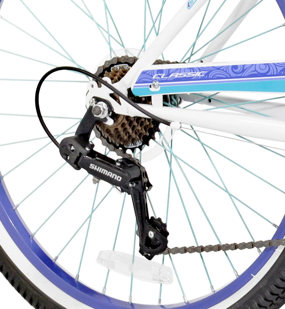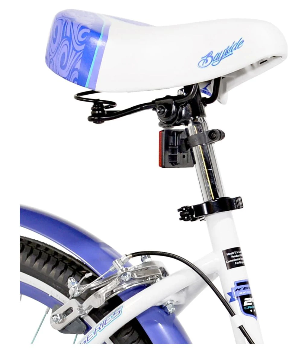 The Kent Bicycles Bayside Bike is ideal for a child or adult 4'6" & up who is ready to cruise around the block on their own. It is full of features and is also fashionista friendly. This gear cycle for girls features a color-coordinated front basket to carry all those important things, such as a water bottle, a jacket, or even your cell phone. This is a white purple and blue accented bike with an oversized custom step-through frame. This bike comes with a rubber suspension seat, a chain guard, and purple rims with teal spokes.