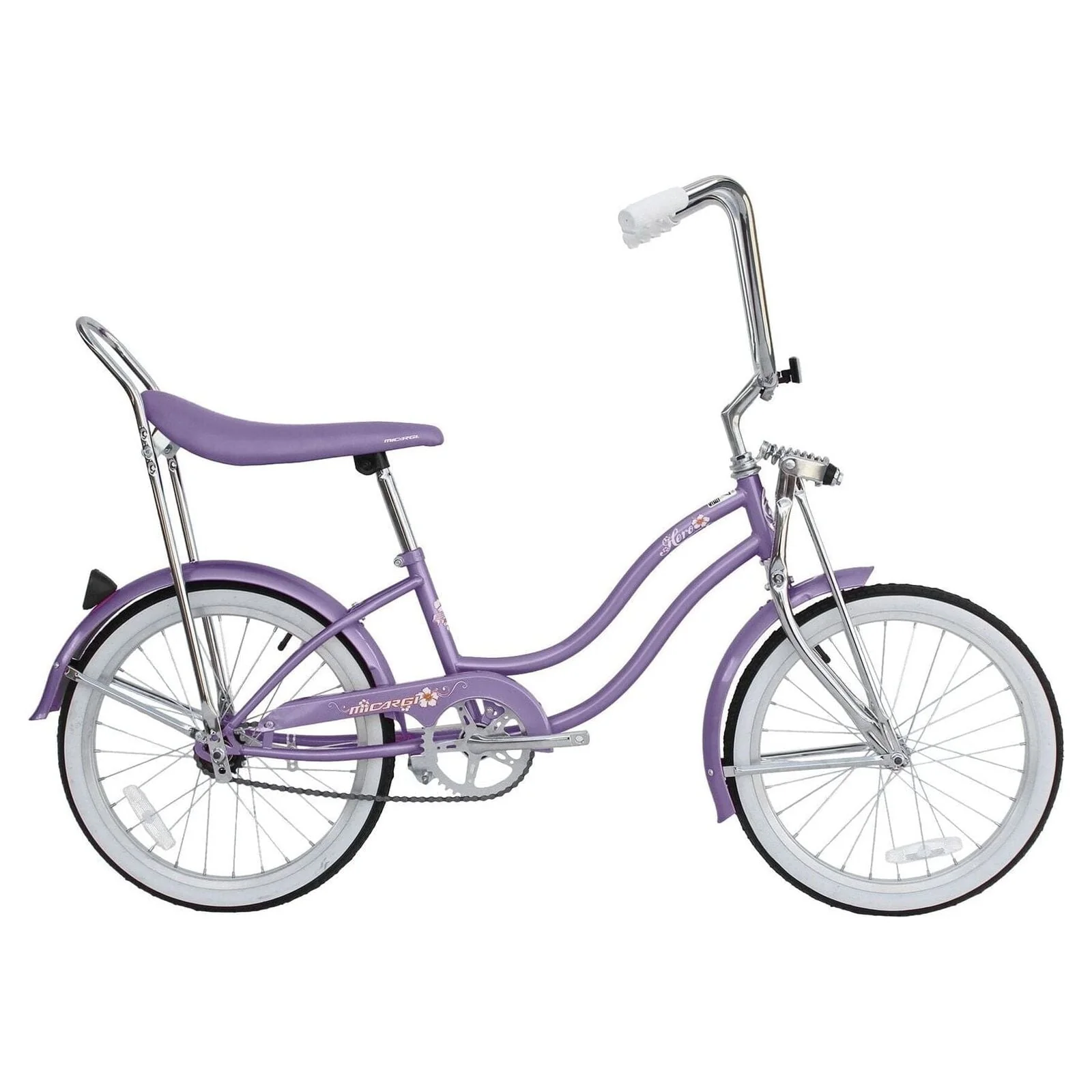 The Micargi Hero is a 20" lowrider that not only is appealing but reliable as well. The beautiful color of purple steel frame shines brightly outdoors and sports a springer end fork with high rise handle bars that allows the young rider to ride in style. The large comfortable white banana seat makes riding for hours seem like minutes, and the sissy bar completes the look of a classic lowrider. Purple rims to match the beautiful color of the purple frame truly makes this bike stand out from all the others. The Micargi Hero is perfect for those young riders that are looking for something different than a traditional 20" children's bike. The eye-catching color, floral decal, and overall look of this lowrider makes the perfect bike for a young trendsetter. This bike is great for riding around the beach or anywhere in town and will surely stand out in the crowd.